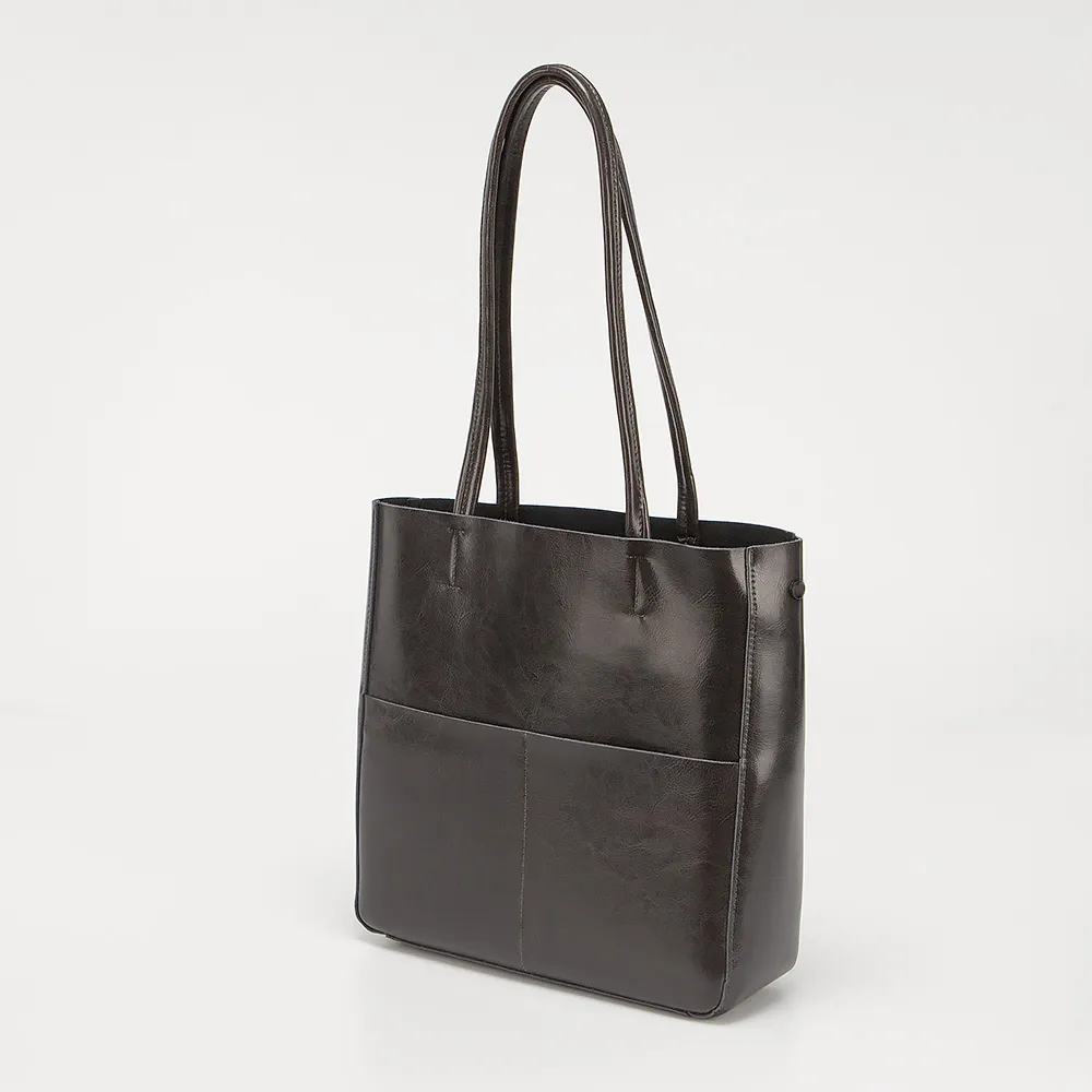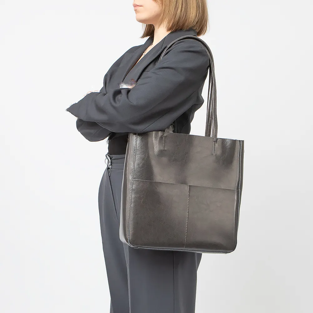 Сумка от торговой марки Poshete из натуральной кожи серого цвета. Модель шоппер с удлиненными ручками. Отделение на молнии. Внутри: фирменная подкладка, средник и карман на молнии, накладной карман. На лицевой и задней сторонах - по два накладных кармана без застежки.