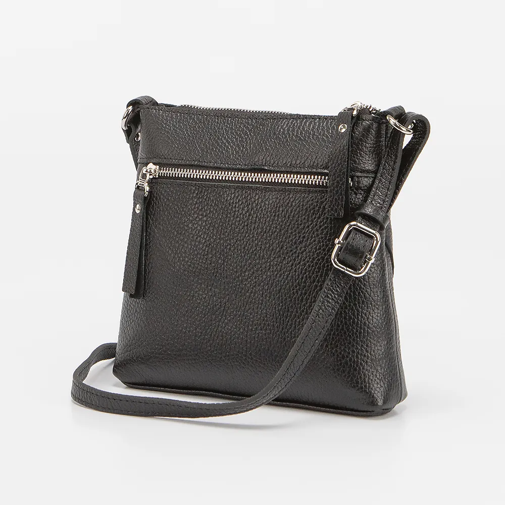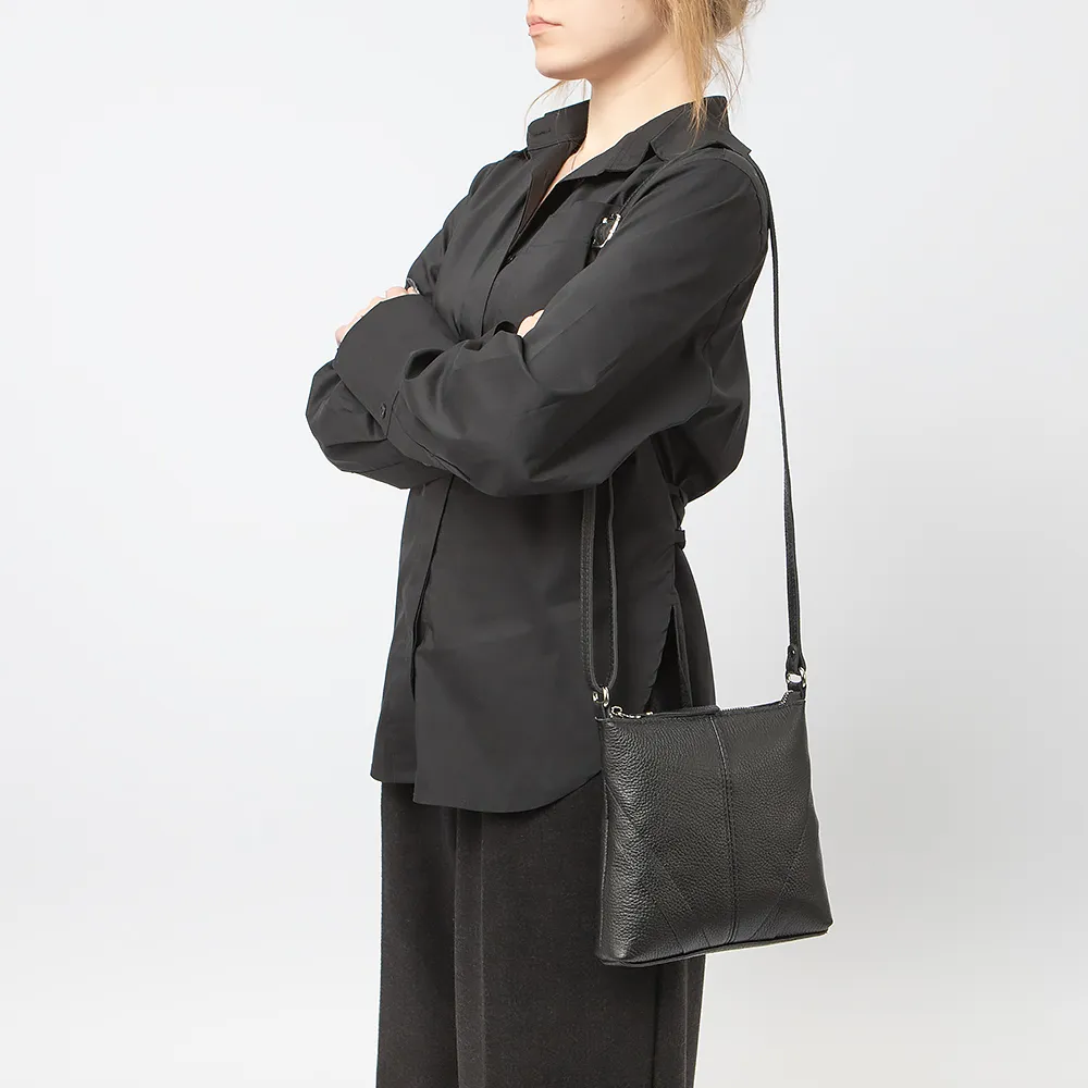 Сумка от торговой марки Francesco Molinary из натуральной кожи черного цвета. Плоская компактная модель с несъемным узким регулируемым плечевым ремнем. Отделение на молнии. Внутри: фирменная подкладка, карман на молнии, накладной карман. На задней стороне - карман на молнии.