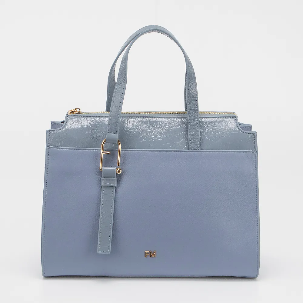 Сумка от торговой марки Francesco Molinary выполнена из натуральной кожи голубого цвета. Модель с двумя ручками и съемным регулируемым плечевым ремнем. Декорирована подвеской. Отделение на молнии. Внутри: текстильная подкладка, карман на молнии, накладной карман. На лицевой стороне - накладной карман на магнитной кнопке. Дно оснащено металлическими ножками для защиты от износа.