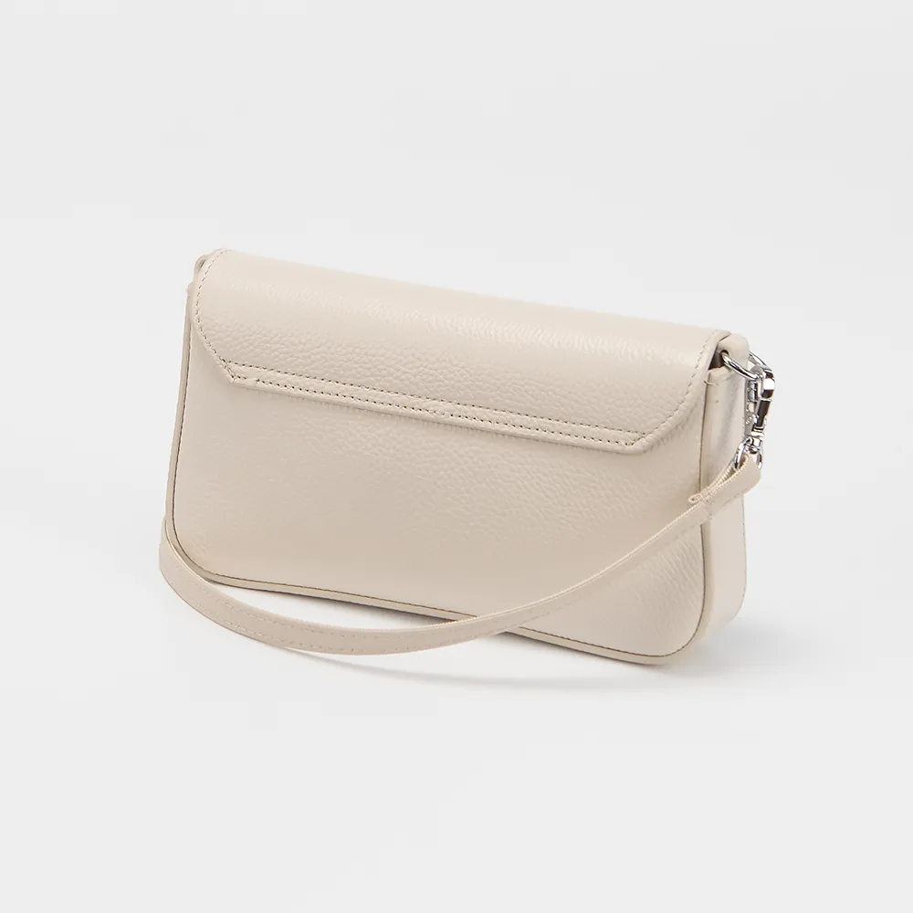 Сумка от торговой марки Poshete выполнена из натуральной кожи бежевого цвета. Компактная модель со съемным плечевым ремнем. Клапан на магнитной кнопке закрывает отделение с текстильной подкладкой. Внутри: карман на молнии.