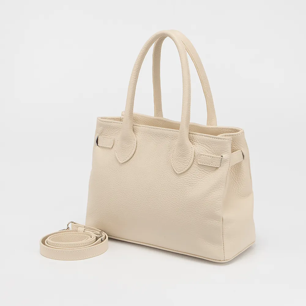 Сумка от торговой марки Francesco Molinary из натуральной кожи бежевого цвета. Модель с двумя ручками и съемным регулируемым плечевым ремнем. Декорирована ремешком на поворотном замке. Отделение на молнии. Внутри: фирменная подкладка, карман и средник на молнии, накладной карман. Дно оснащено металлическими ножками для защиты от износа.