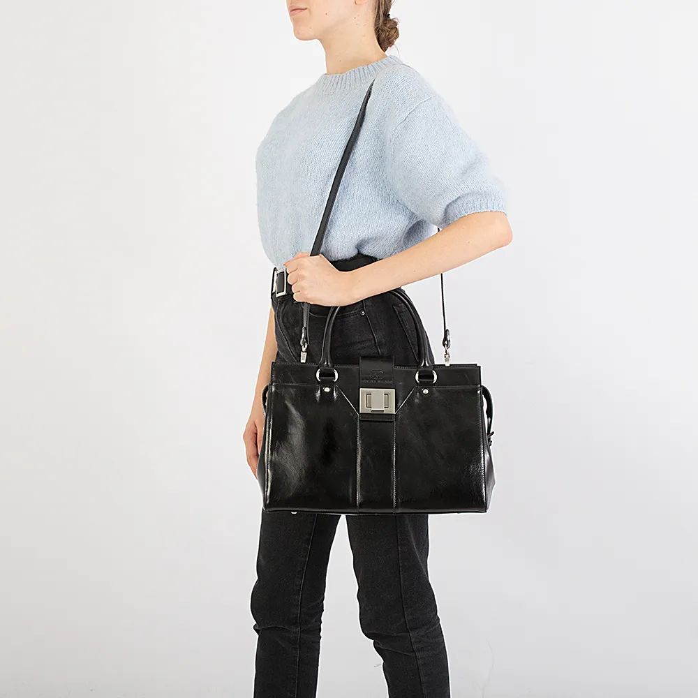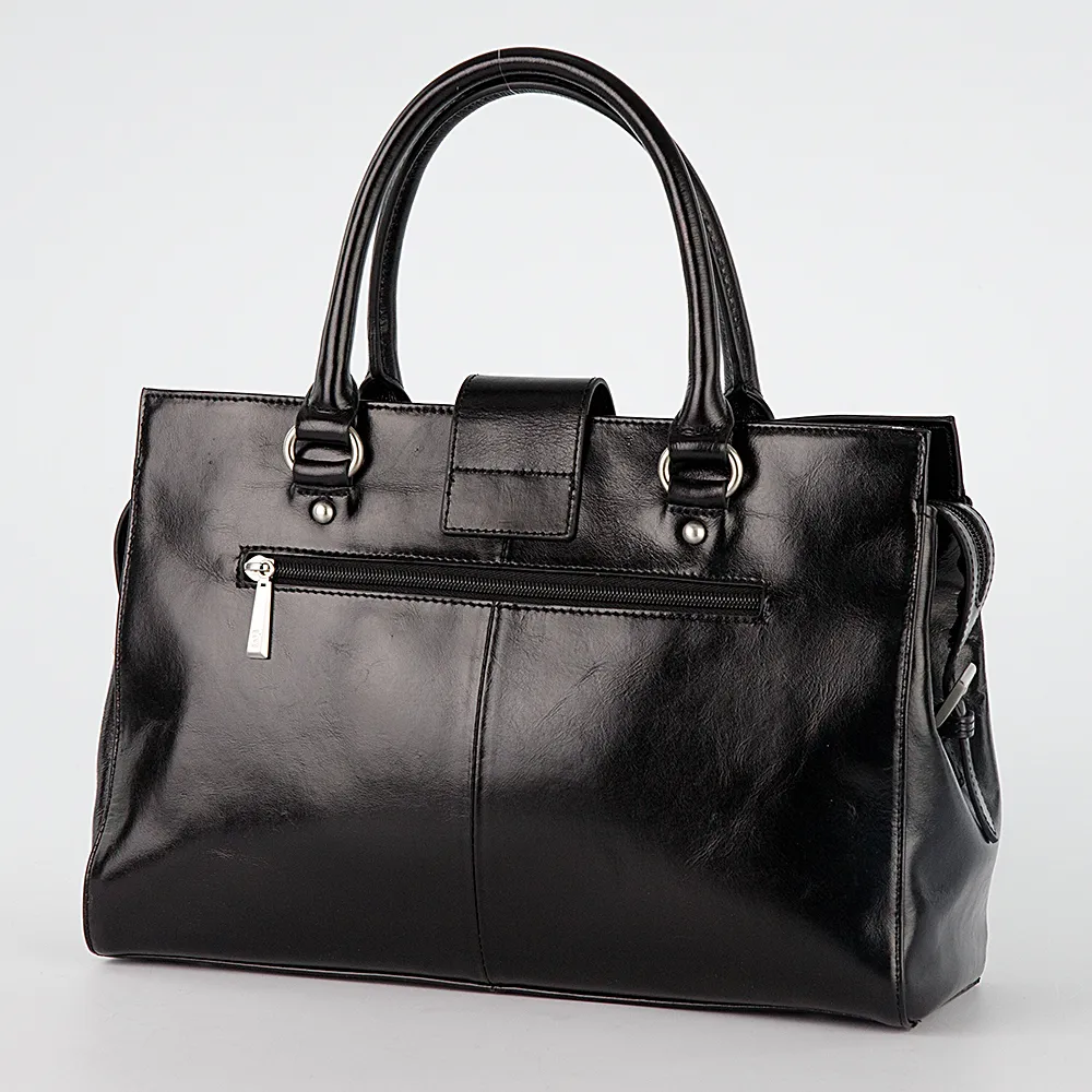 Классическая женская сумка Francesco Molinary формата А4 с декоративным хлястиком с тиснением Francesco Molinary, закрывающийся на замок. Модель с одним текстильным отделением на молнии, выполнена из натуральной мягкой кожи. Внутри средник на молнии, кармашки для телефона и мелочей, удобное отделение на молнии для документов. Снаружи, на задней стенке, карман на молнии. Металлическая фурнитура и ножки на дне серебристого цвета. В комплекте съемный регулируемый плечевой ремень из натуральной кожи.