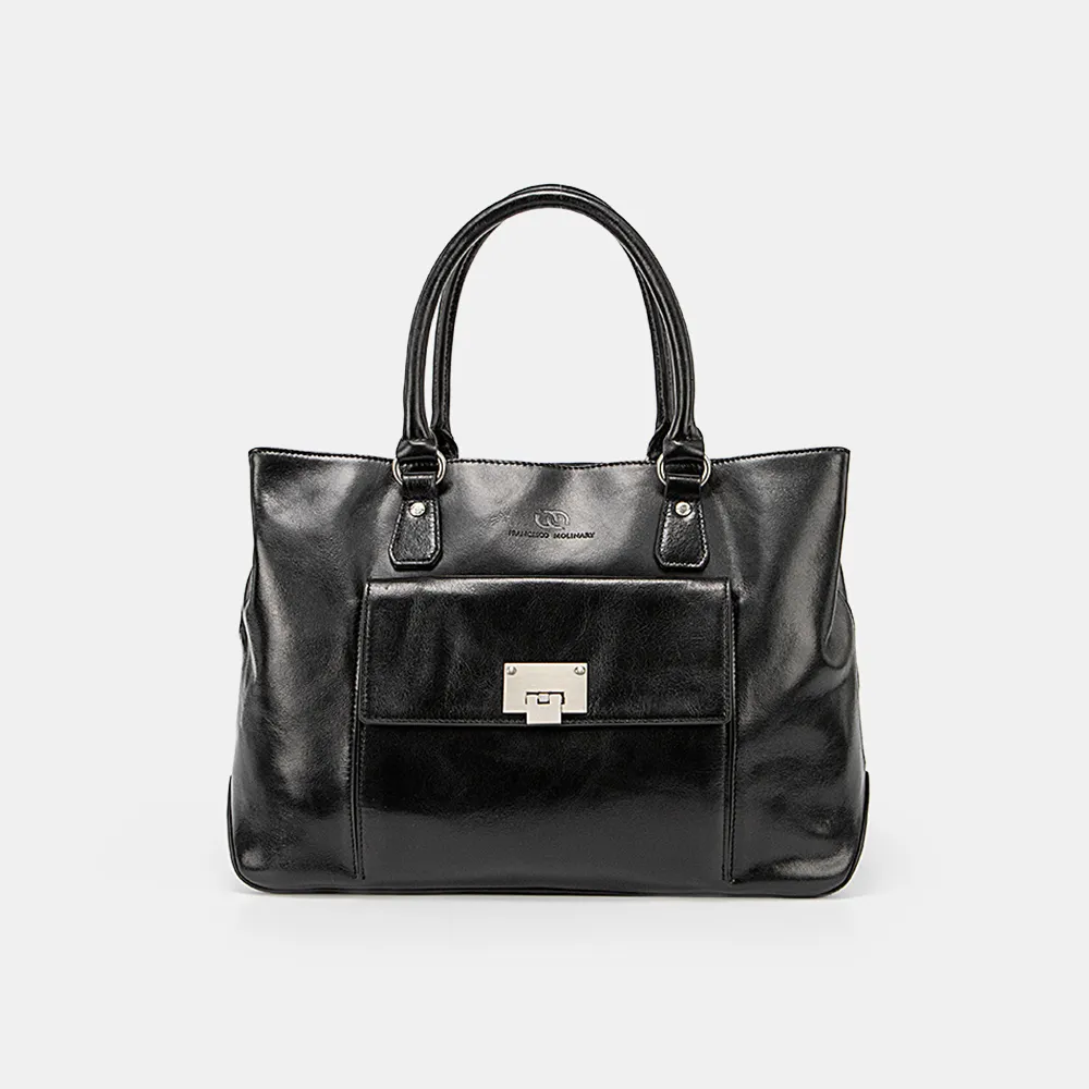 Сумка от торговой марки Francesco Molinary выполнена из натуральной кожи черного цвета. Модель с двумя удлиненными ручками на кольцах-держателях. Отделение на молнии. Внутри: фирменная подкладка, средник и карман на молнии, два накладных кармана. На лицевой стороне – накладной карман с клапаном на цупферном замке, на задней – карман на молнии. Дно оснащено кожаными накладками для защиты от износа. Размер подходит для документов формата А4.