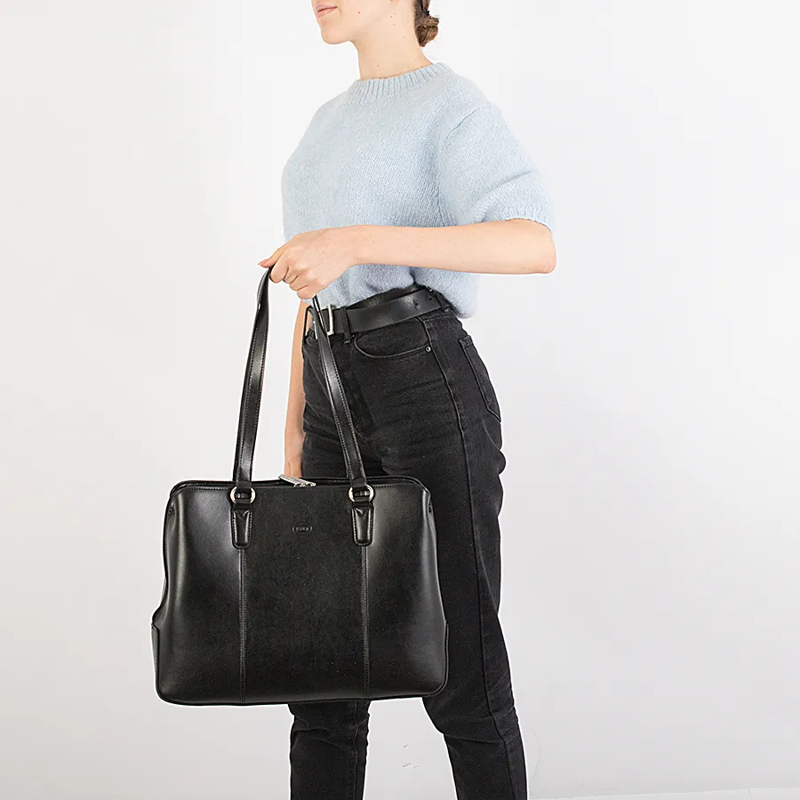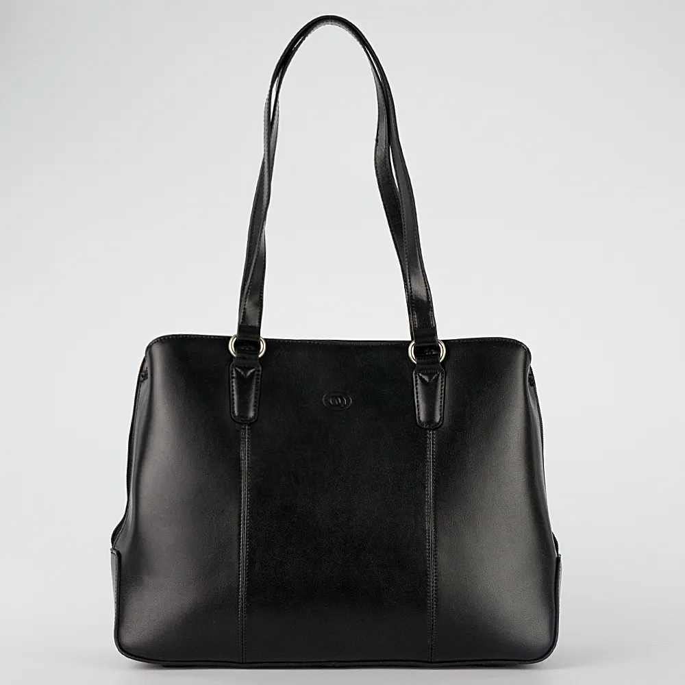 Сумка в деловом стиле от торговой марки Francesco Molinary выполнена из натуральной кожи черного цвета. Модель с двумя удлиненными ручками. Три отделения с фирменной подкладкой. Два отделения по краям – на магнитной кнопке. Основное отделение на молнии по трем сторонам, внутри: карман на молнии. На задней стороне – карман на молнии.