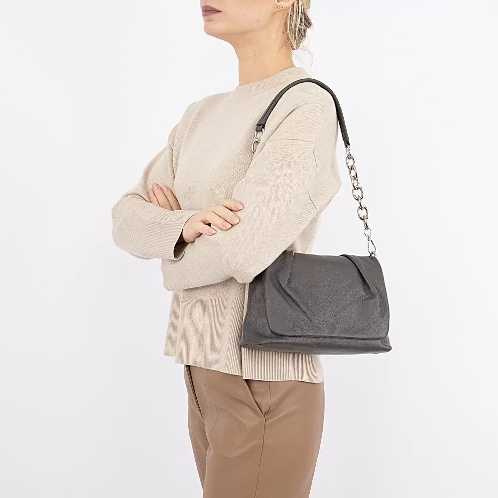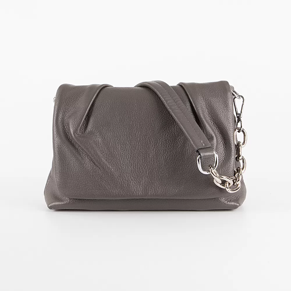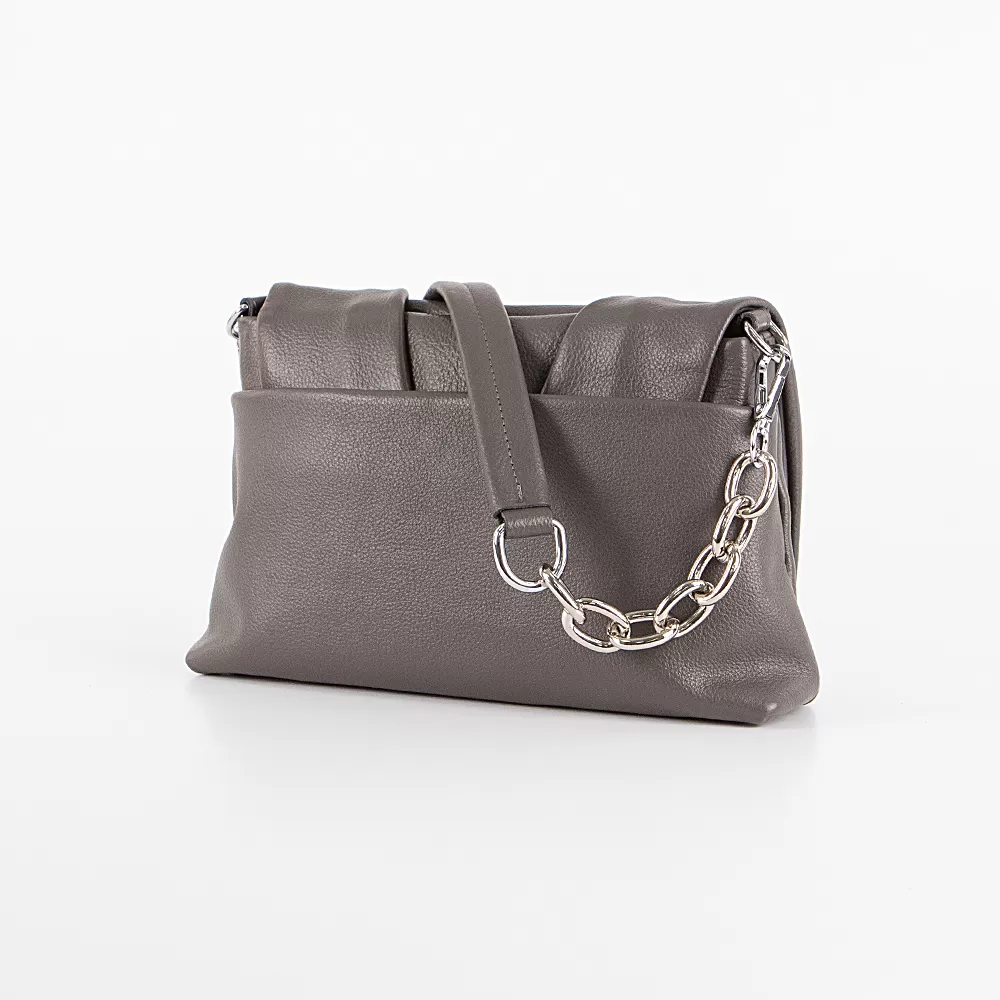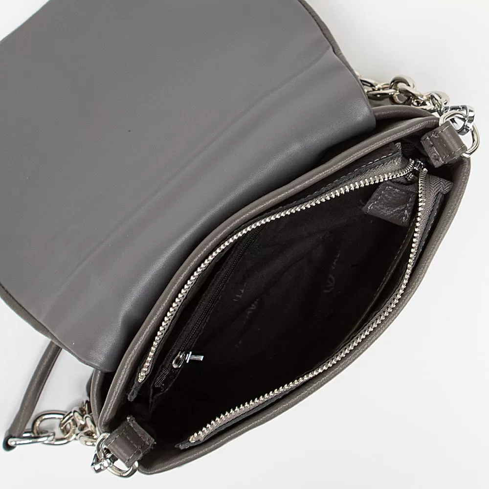 Сумка из натуральной кожи бренда Valigetti, модель со съемным плечевым ремнем, закрывается на клапан на магните, сзади также есть карман на магните. Она имеет два плечевых ремня: один классический, а другой с цепочкой. Основное отделение закрывается на молнию и имеет текстильную подкладку. В нем есть два кармана: один потайной на молнии и один накладной по центру.