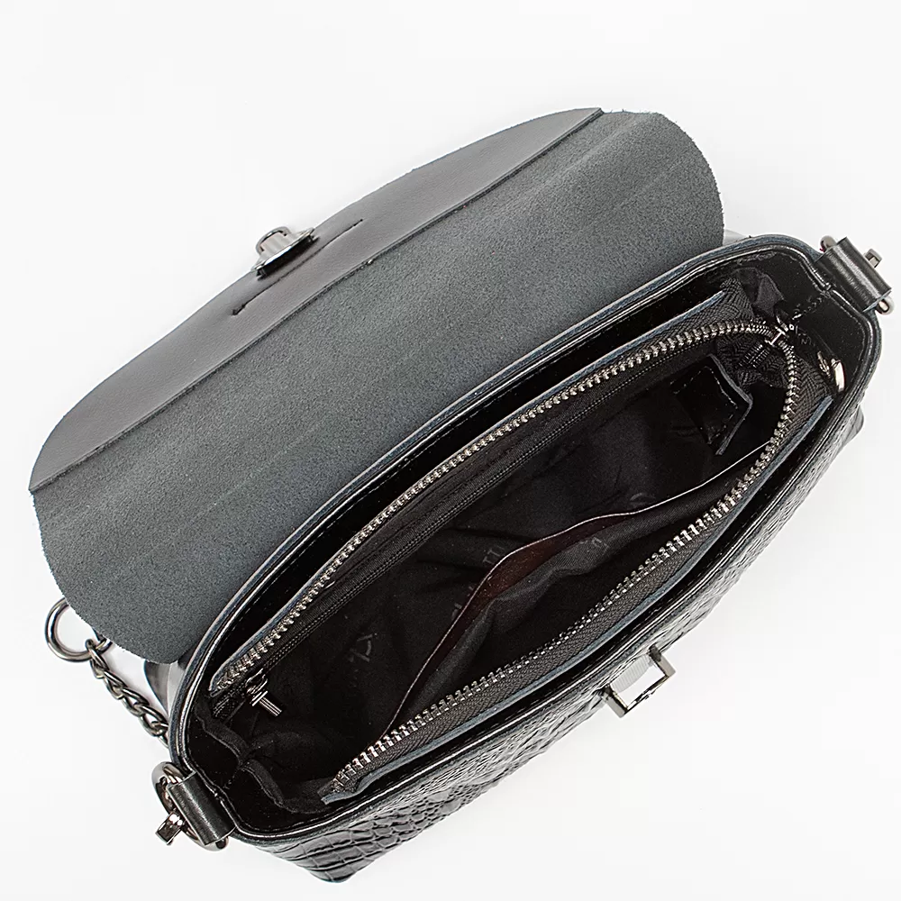 - Основное отделение на молнии с текстильным подкладом, накладной карман, карман потайной на молнии и боковой карман для мелочи.