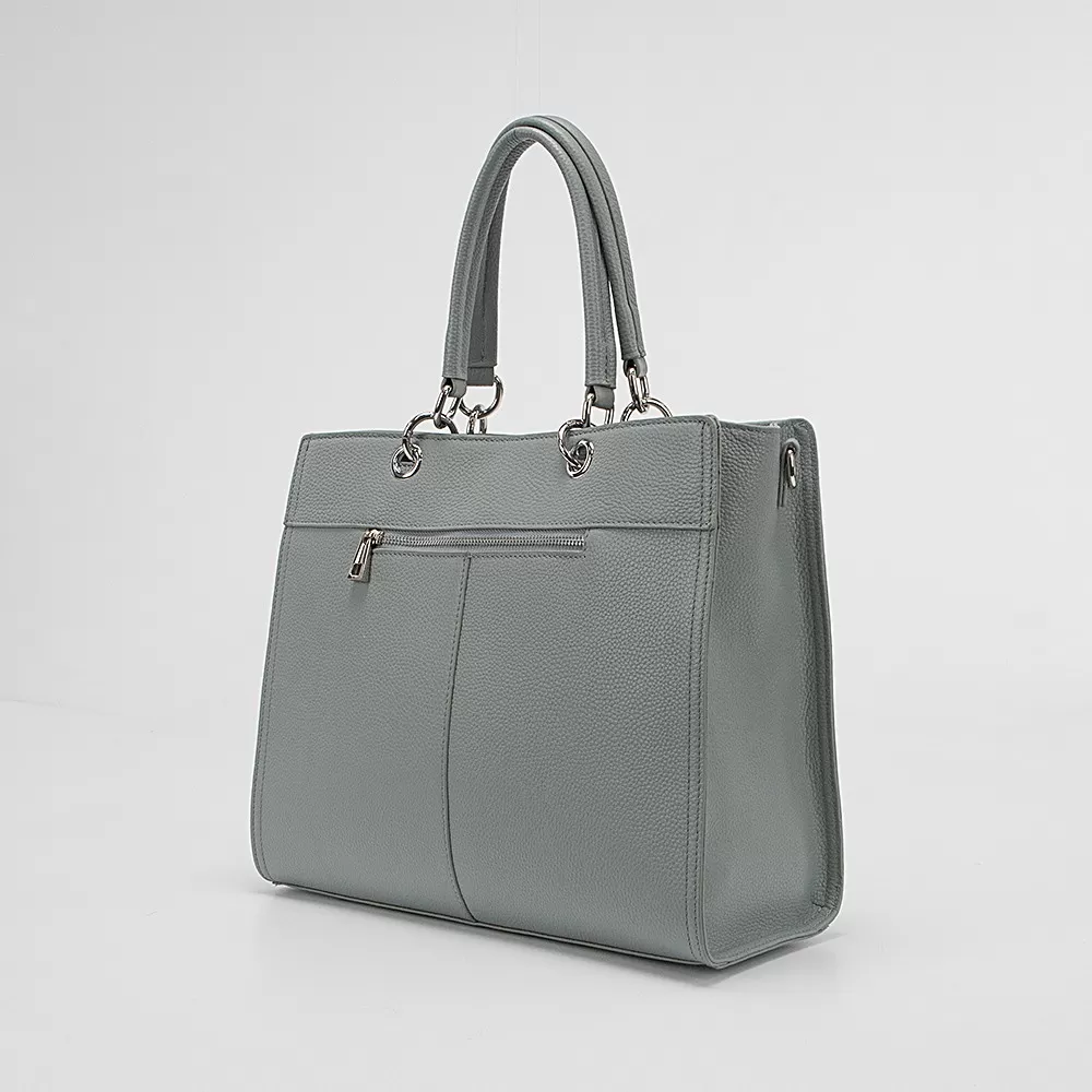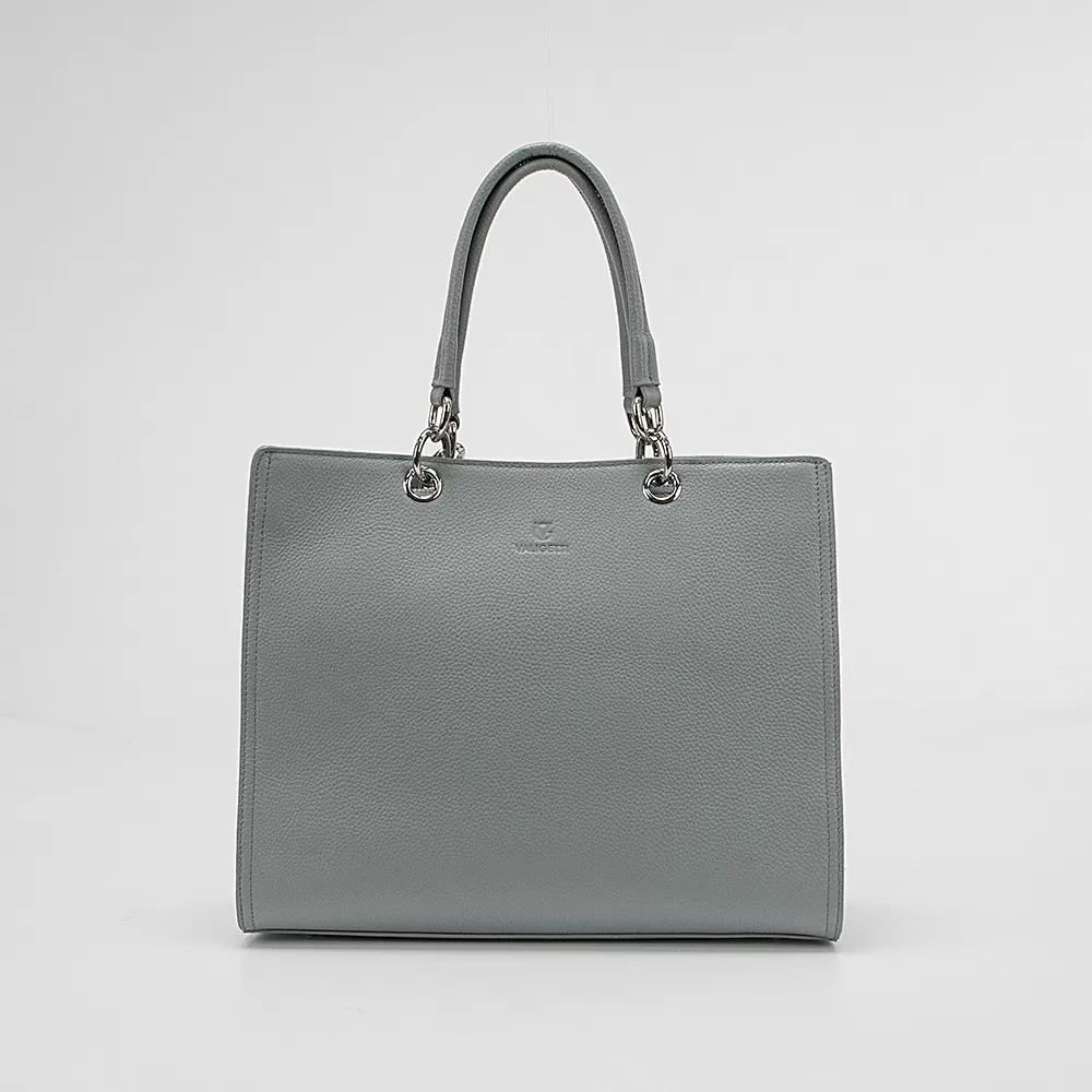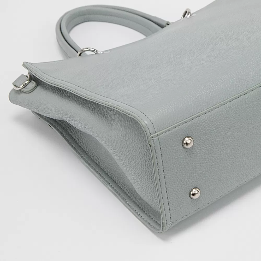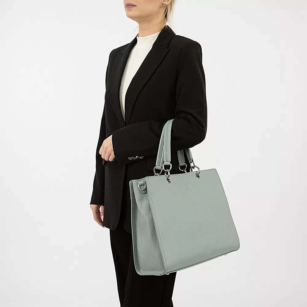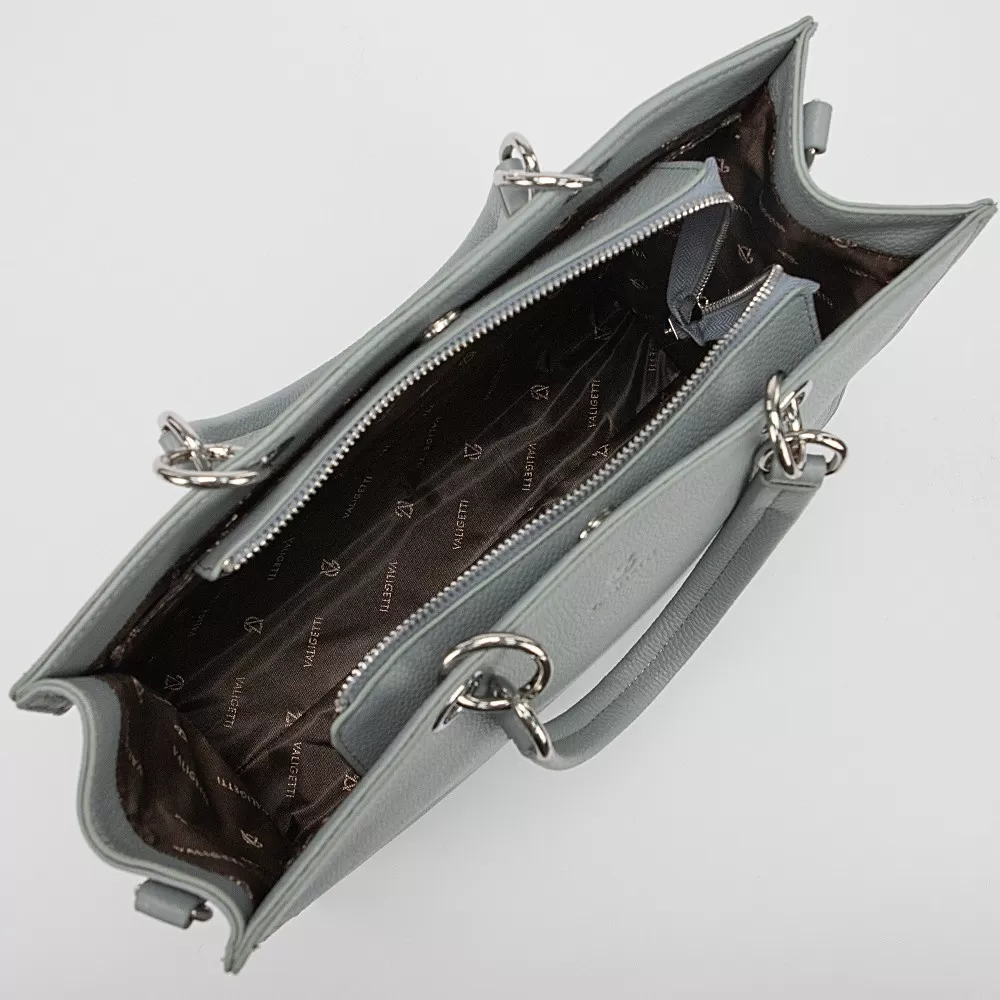 Сумка от Valigetti, выполненная из натуральной кожи голубого цвета. Данная модель имеет две ручки, одна из которых оснащена кожаным ремешком, а также съёмный регулируемый плечевой ремень.