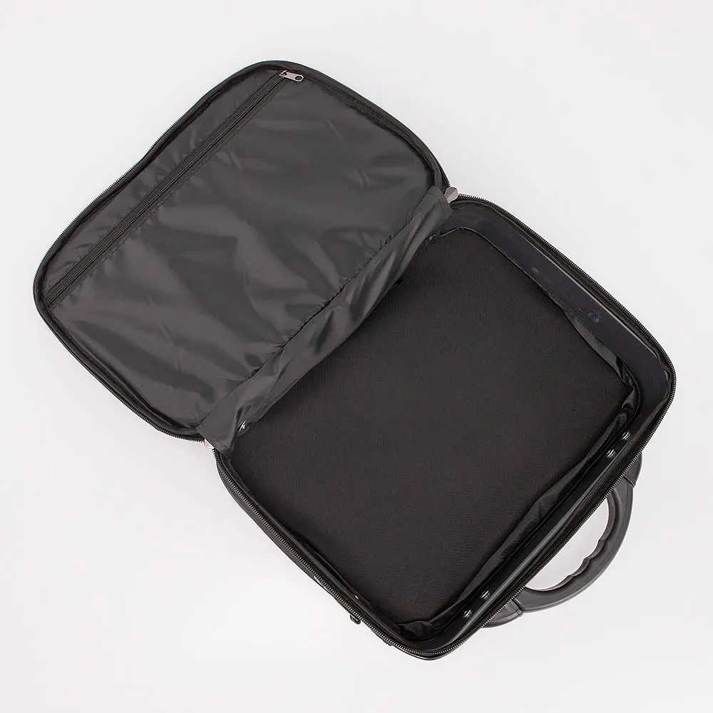 Кейс от торговой марки Mr.Bag из текстильного материала черного цвета. Модель с пластиковой ручкой и съемным регулируемым плечевым ремнем. Два отделения на молнии. Заднее узкое отделение для документов с накладным карманом внутри. Основное отделение глубокое и вместительное. На лицевой стороне - накладной карман на молнии и один прорезной карман на молнии. Имеется раздвижка на молнии для увеличения объема.