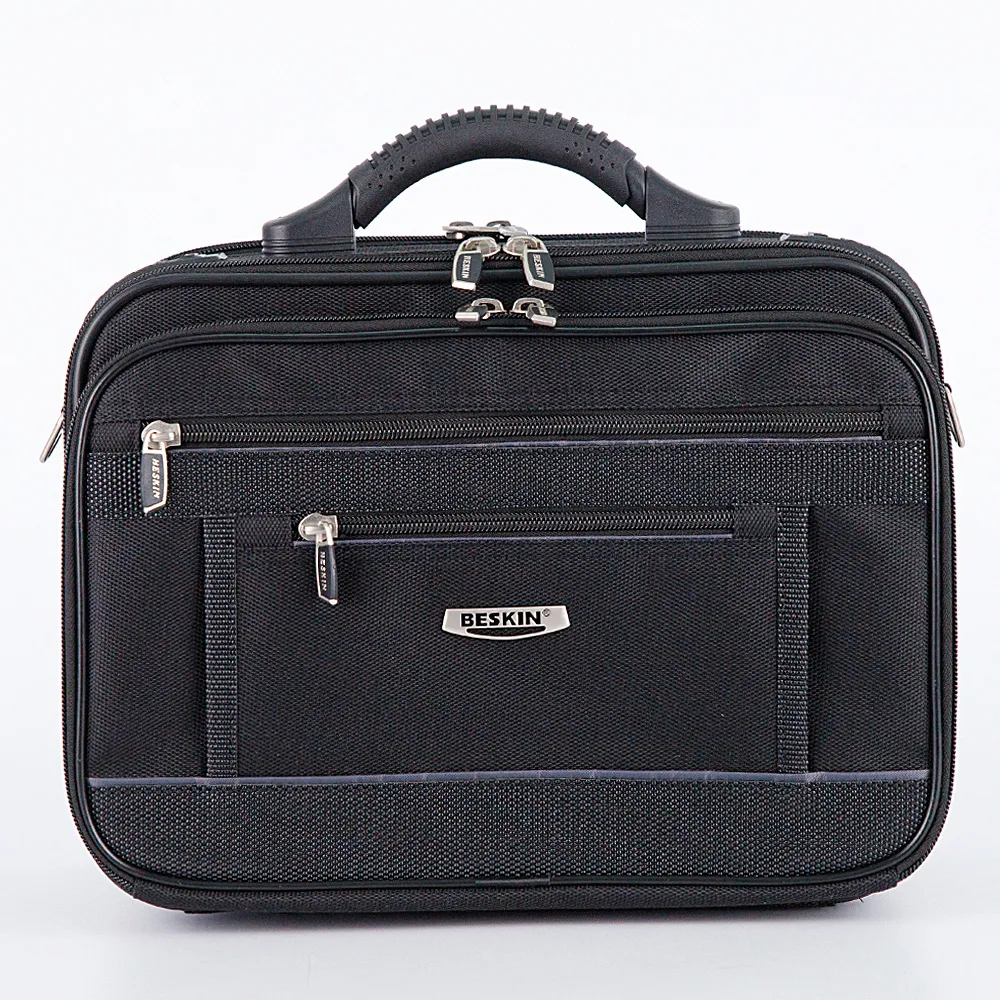 Деловой кейс от торговой марки Beskin из практичного долговечного полиэстера черного цвета с декоративными вставками из искусственной кожи. Модель среднего размера с удобной ручкой из ударопрочного пластика и съемным регулируемым плечевым ремнем с наплечником. Три отделения на молнии с текстильной подкладкой. Заднее отделение для документов с плотной перегородкой разделителем. Среднее вместительное отделение с перекрестными эластичными фиксирующими ремнями на застежке фастекс, карманом на молнии и двумя накладными карманами. В переднем отделении – органайзер для канцелярских принадлежностей, вместительный накладной карман. На лицевой стороне – два кармана на молнии. Вес кейса – 1,5 кг. Имеется раздвижка для увеличения объема с 16 до 20 литров. На углах – защитные прорезиненные накладки. Дно оснащено пластиковыми ножками для защиты от износа.
