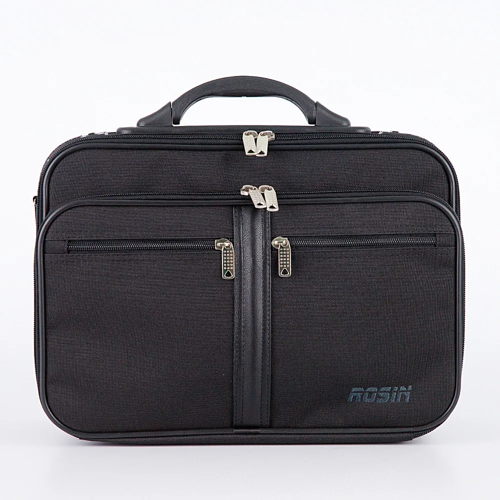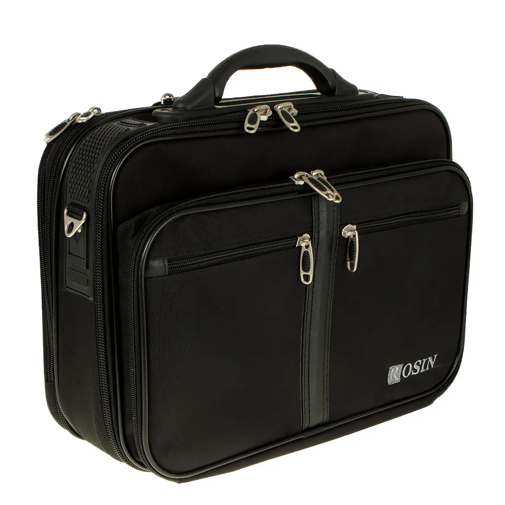 Мужской кейс от торговой марки Rosin из прочного текстильного материала черного цвета. Каркасная модель с широкой пластиковой ручкой и съемным плечевым ремнем. В основном отделении – фиксирующие перекрестные ремни. Два отделения на молнии. Имеется раздвижка на молнии для увеличения объема. На лицевой стороне - вместительный карман с органайзером и два кармана на молнии. На задней стороне – карман на молнии.