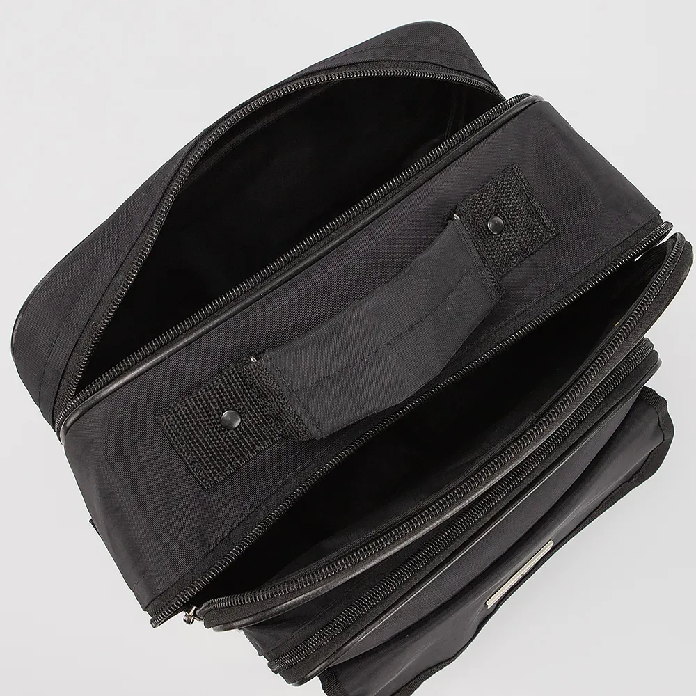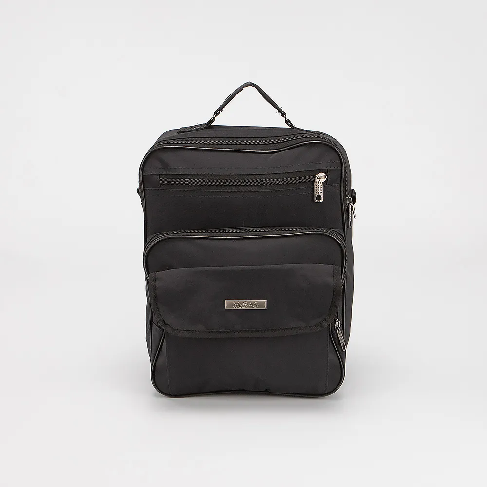 Сумка от торговой марки Mr.Bag выполнена из прочного текстильного материала черного цвета. Модель вертикальной ориентации с одной ручкой и съемным регулируемым плечевым ремнем. Два отделения на молнии с текстильной подкладкой. На лицевой стороне - глубокий карман на молнии, вместительный накладной карман, накладной карман с клапаном на липучке.
