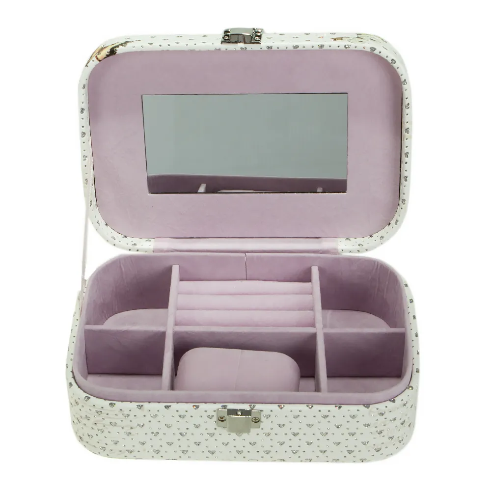 Элегантная шкатулка для украшений от бренда Passo Avanti придаст очарование вашему столику. Имеет прямоугольную форму. Выполнена в белом цвете с принтом, дополнена металлической фурнитурой. Модель с откидной крышкой, внутри множество отсеков для разных видов украшений и зеркальце. Внутри оформлена бархатистым текстильным материалом.