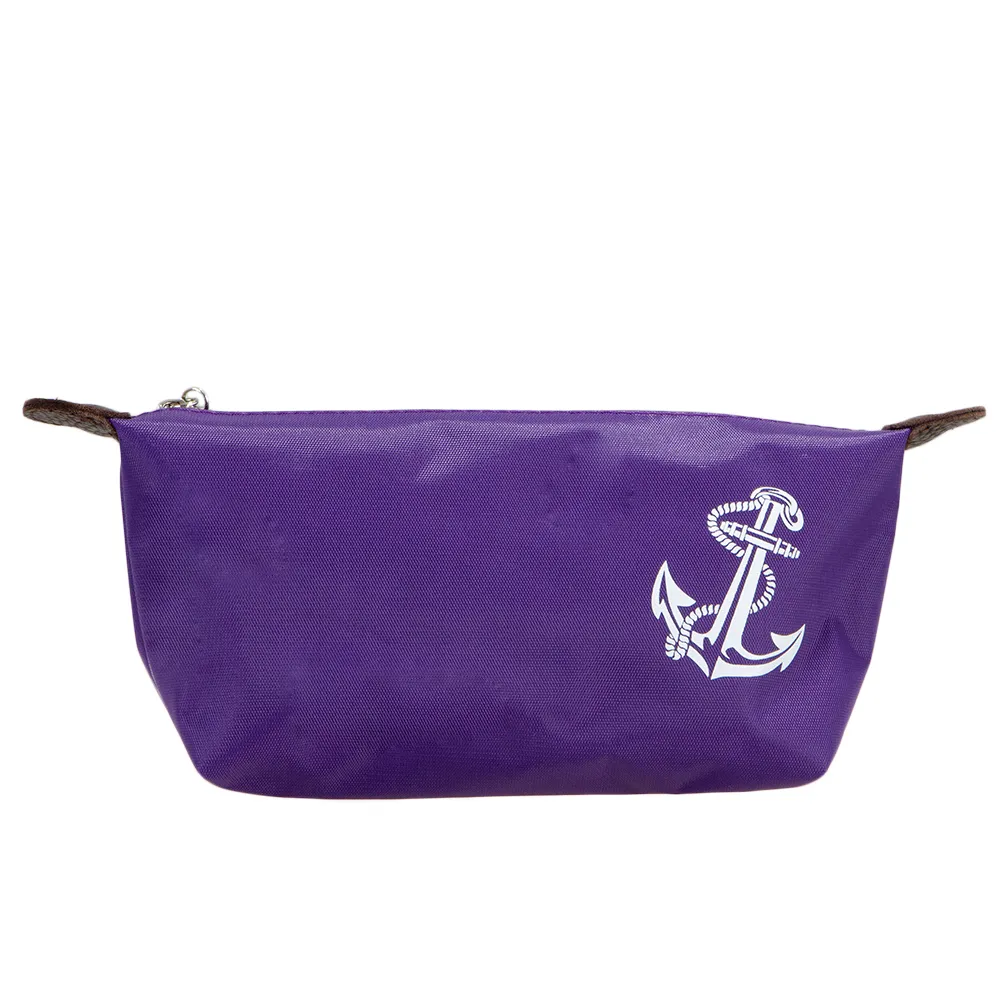 Набор из двух косметичек от торговой марки Antan выполнен из плотного нейлона фиолетового цвета с отделкой из искусственной кожи. На лицевой стороне – принт с якорем. Модель жесткая, устойчивая. Отделение на молнии с оригинальным пуллером-подвеской.