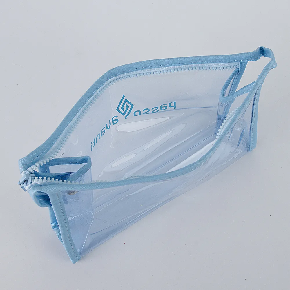 Косметичка от торговой марки Passo Avanti из мягкого прозрачного пластика в голубом цвете. Модель с отделением на молнии. Лицевая сторона декорирована принтом с названием бренда.