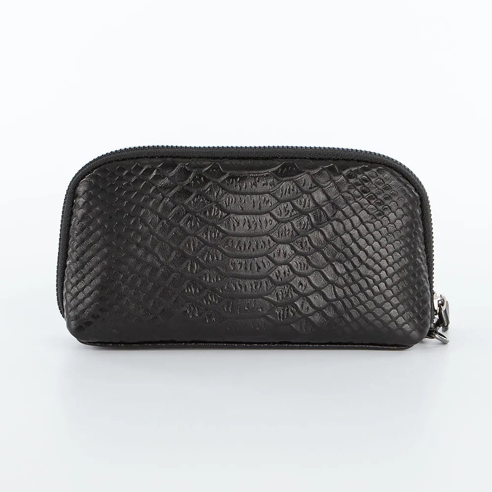 Косметичка от торговой марки Poshete из натуральной кожи черного цвета с тиснением под крокодиловую кожу. Отделение на молнии. Внутри: фирменная подкладка, средник с карманом на молнии и накладной карман. Имеется съемный ремешок для ношения на запястье.