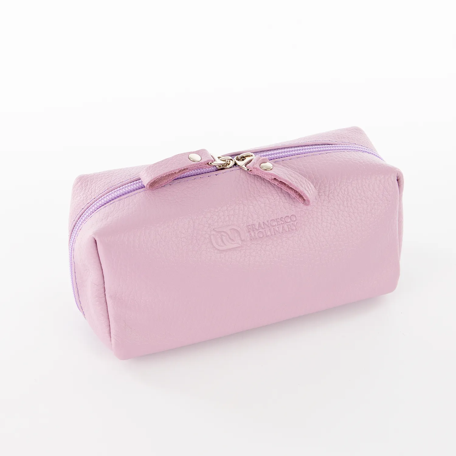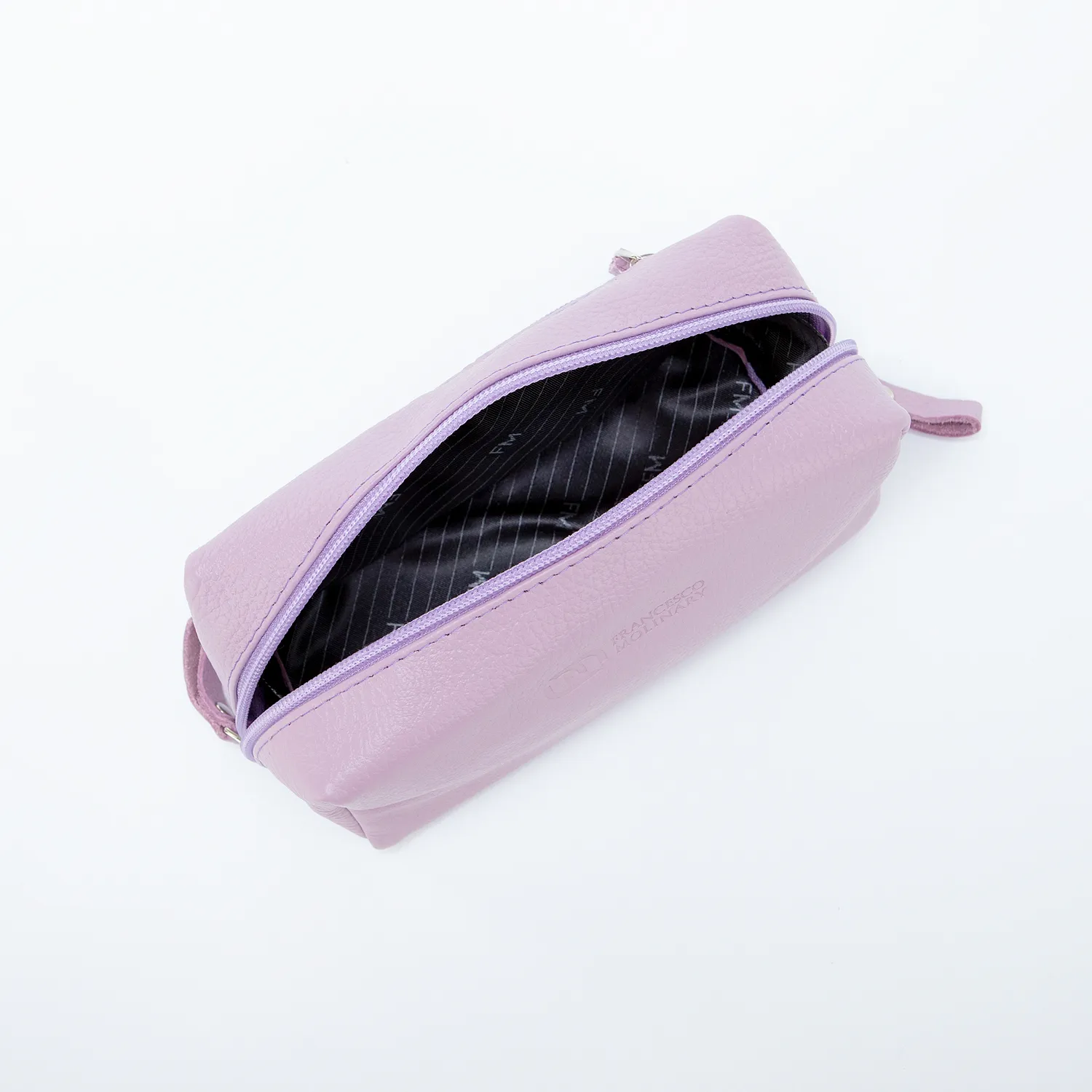 Косметичка от торговой марки Francesco Molinary из натуральной кожи сиреневого цвета. Компактная модель со съемным ремешком для ношения на запястье. Отделение на молнии с двумя встречными бегунками. Внутри: фирменная подкладка, карман на молнии. На задней стороне – карман на молнии.