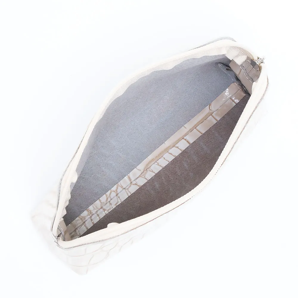 Косметичка от торговой марки Francesco Molinary из натуральной кожи с тиснением под крокодиловую кожу бежевого цвета. Отделение на молнии без подкладки.