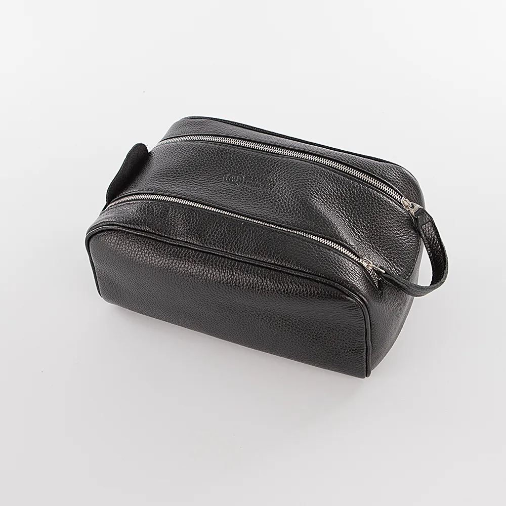 Косметичка от торговой марки Francesco Molinary из натуральной кожи черного цвета. Отделение закрывается двумя молниями с одним пуллером, выполняющим роль лямки-переноски. Внутри: фирменная подкладка, карман на молнии.