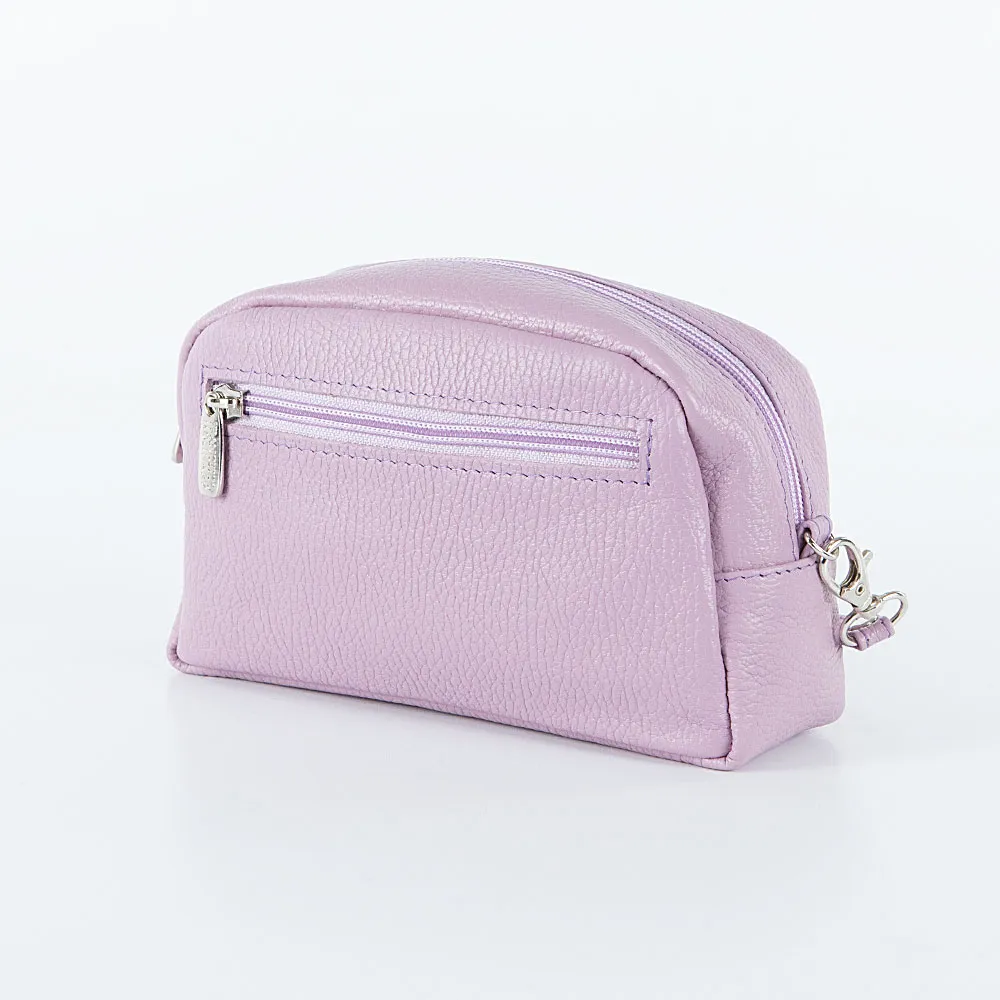 Косметичка от торговой марки Francesco Molinary из натуральной кожи сиреневого цвета. Модель со съемным ремешком для запястья. Отделение на молнии. Внутри: фирменная подкладка. На задней стороне – карман на молнии.