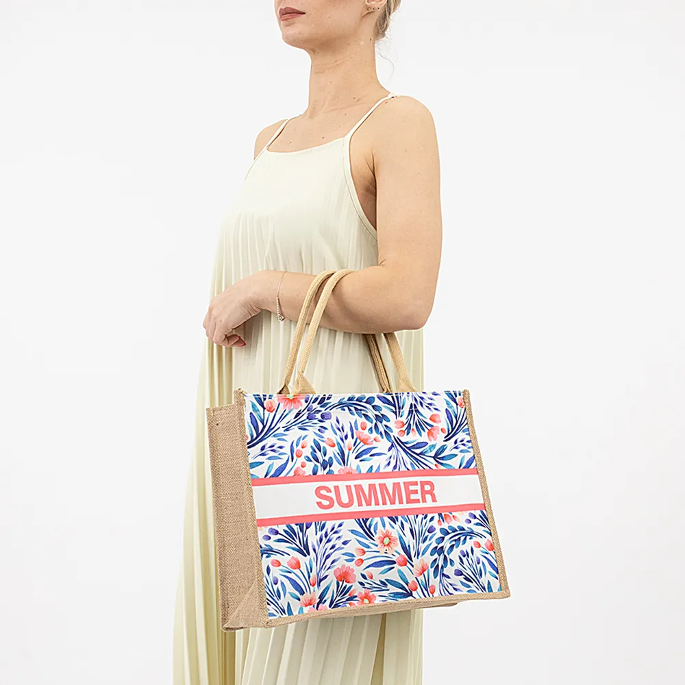 Пляжная сумка от торговой марки Mr.Bag из текстильного материала мешковины. Декорирован оригинальным ярким цветочным принтом и надписью «Summer». Модель квадратной формы с двумя удлиненными ручками. Отделение на молнии. Внутри: без подкладки.