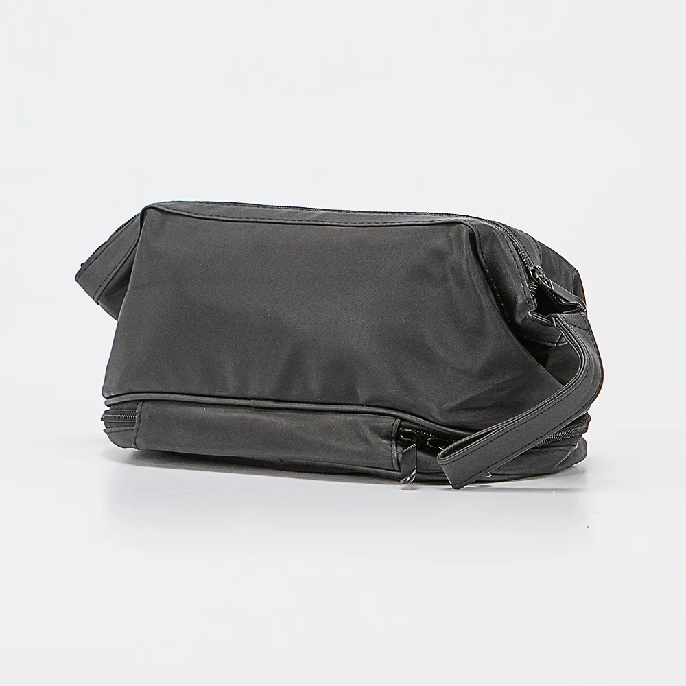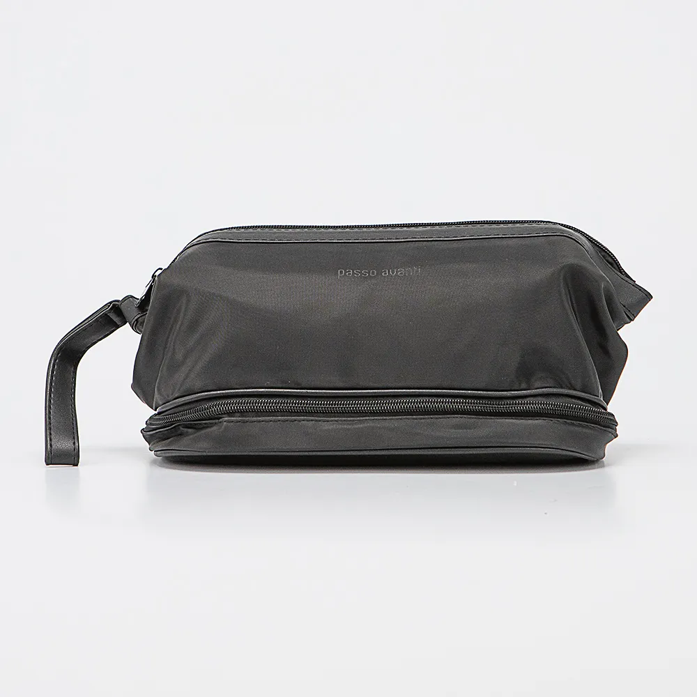Косметичка от торговой марки Passo Avanti из текстильного материала и искусственной кожи черного цвета. Оригинальная модель с петлей для крепления и ношения на руке. Два отделения, с текстильной подкладкой. Основное отделение имеет рамочный вид открытия на молнии, что обеспечивает удобный доступ. Внутри: карман на молнии, два накладных кармана. Второе отделение расположено в нижней части; внутри: накладной карман-сетка.