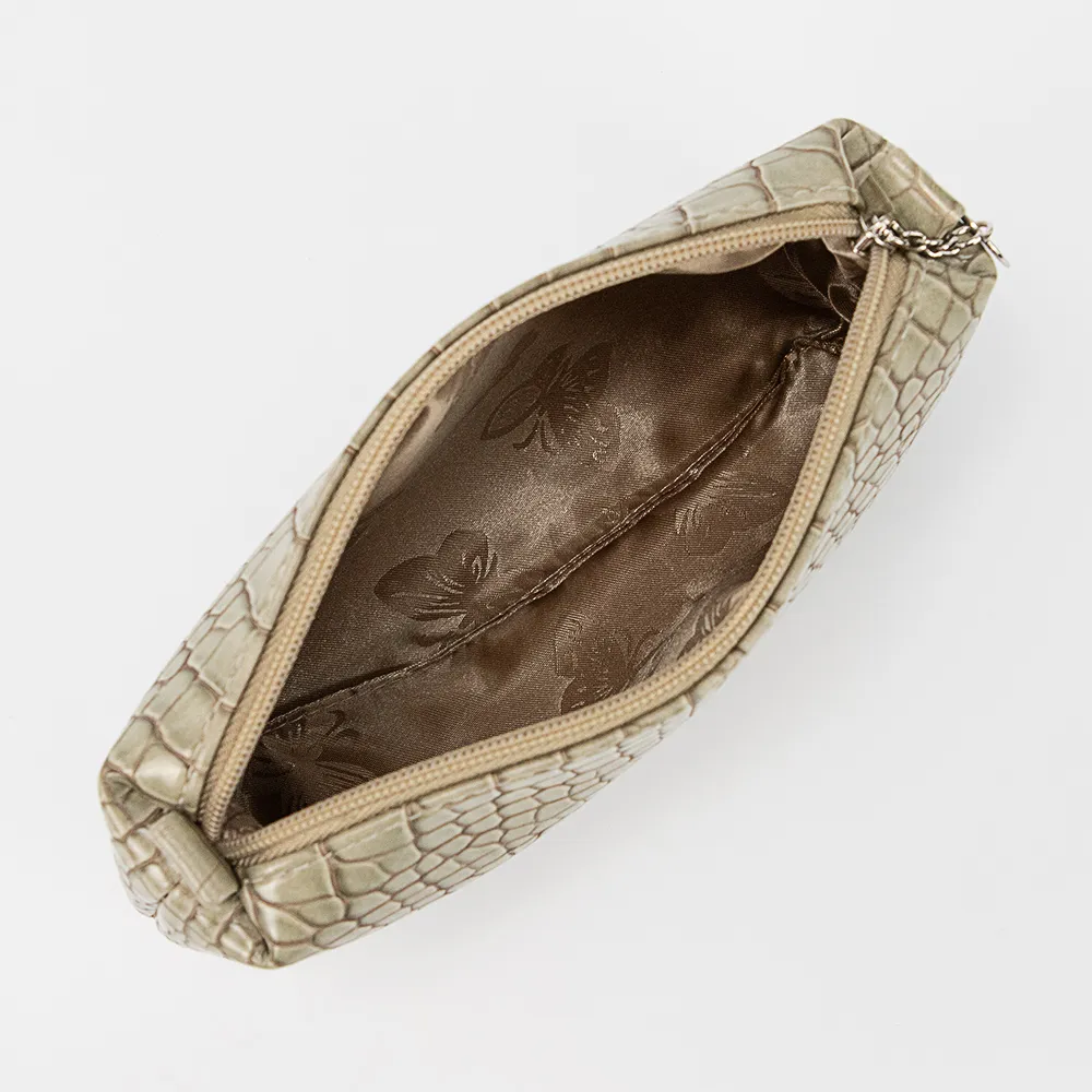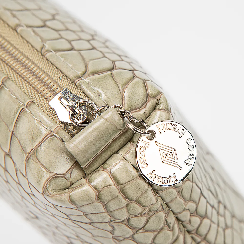 Косметичка от торговой марки Passo Avanti из искусственной кожи оливкового цвета с тиснением под крокодиловую кожу. Модель с отделением на молнии. Внутри: текстильная подкладка.