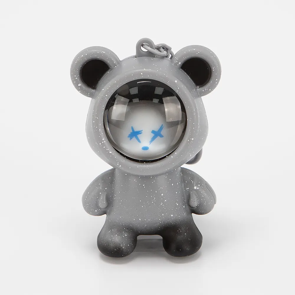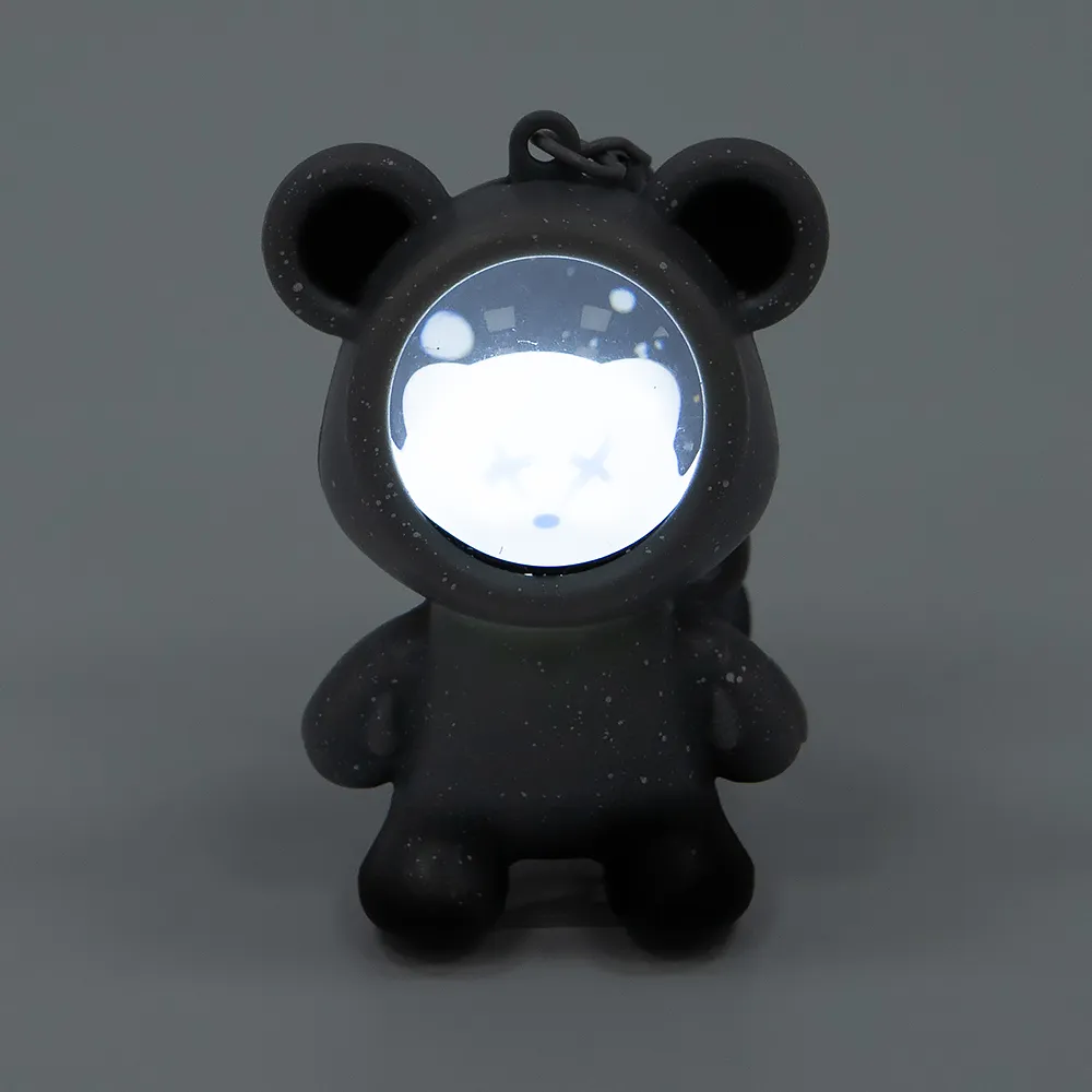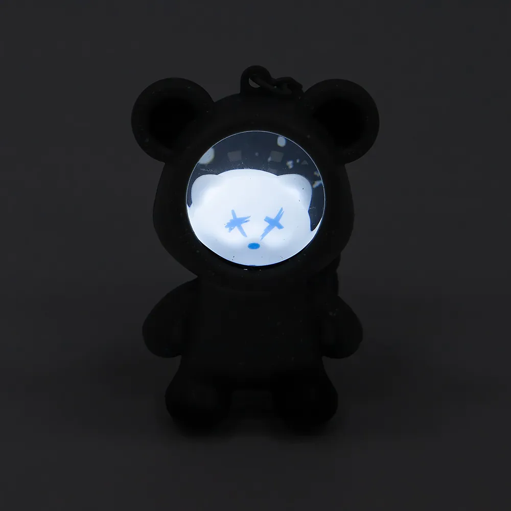 Светящийся брелок в виде мишки-космонавта. Работает от батареек. Модель с карабином и бубенчиком.
