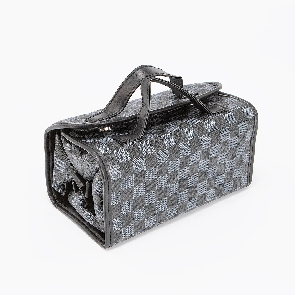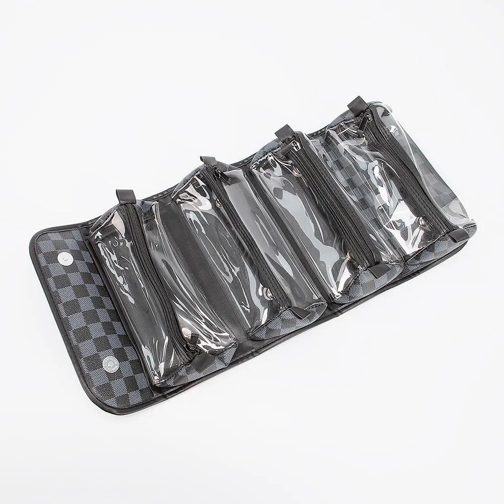 Косметичка от бренда Passo Avanti из искусственной кожи с принтом в клетку. Модель в форме свертка, закрывается клапаном на две кнопки. В развернутом виде - плоская модель с четырьмя прозрачными кармашками на молнии.