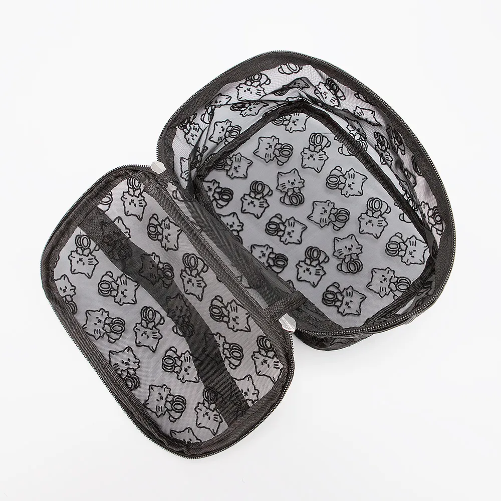 Женская косметичка от бренда Passo Avanti выполнена из прозрачного текстильного материала с изображением котиков. Аксессуар прямоугольной формы, закрывается книжкой и застёгивается на молнию, сверху есть ручка для переноски. Отличный аксессуар для путешествий.