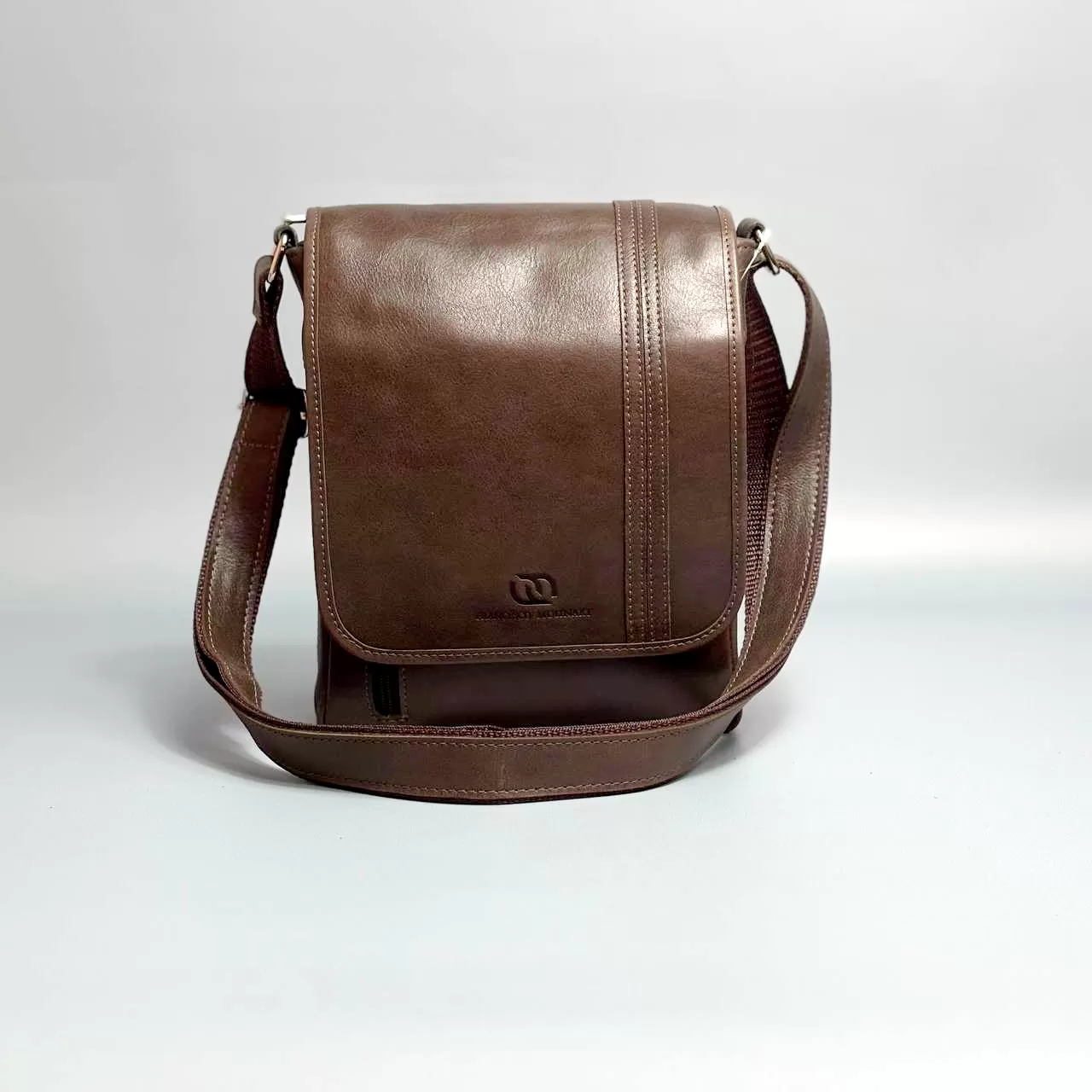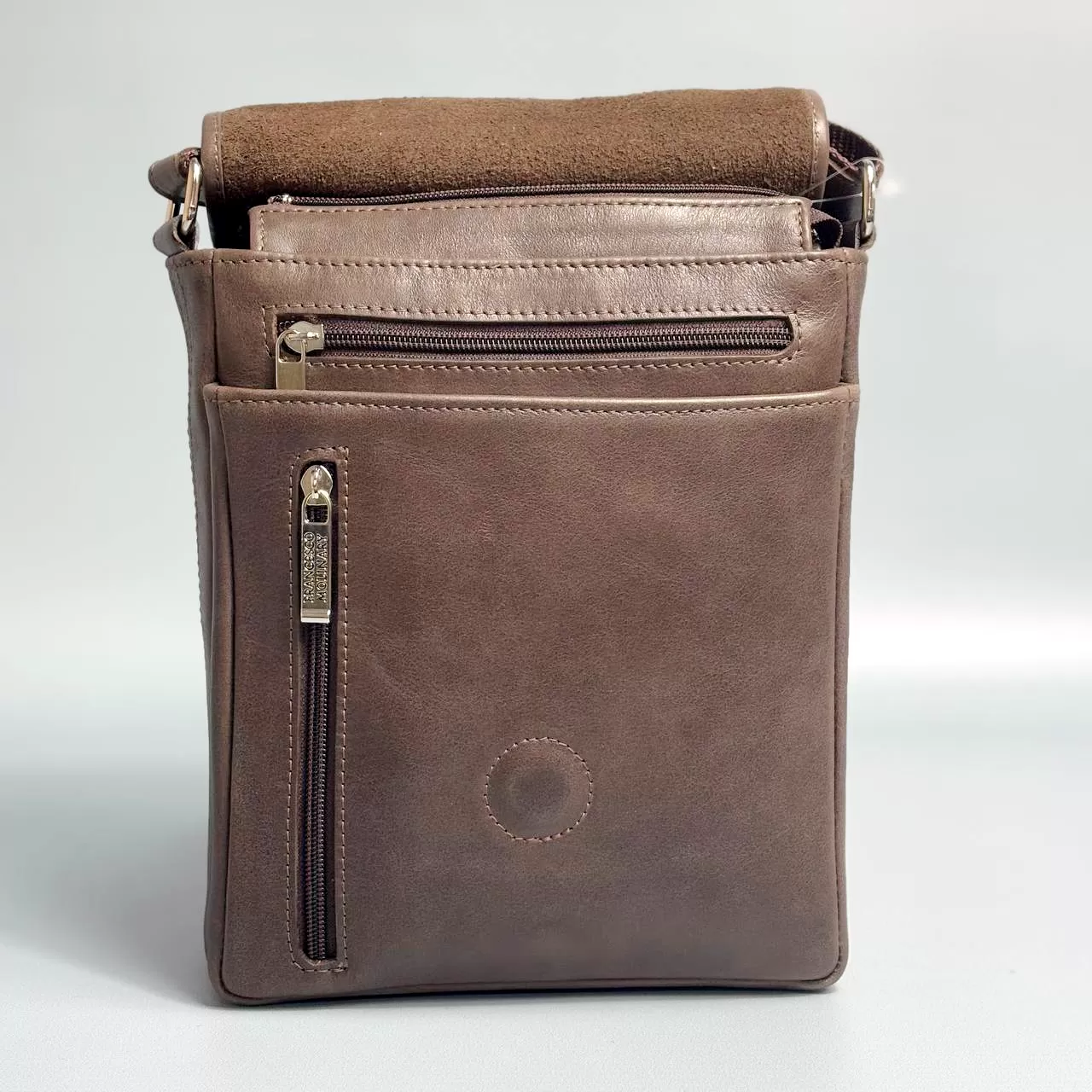 Модель с несъёмным плечевым ремнём коричневого цвета закрывается клапаном на магните. Под клапаном находится основное отделение на молнии. Внутри основного отделения есть фирменная подкладка, карман на молнии, два открытых маленьких кармана и средний карман.