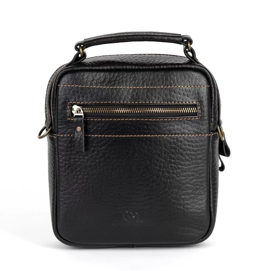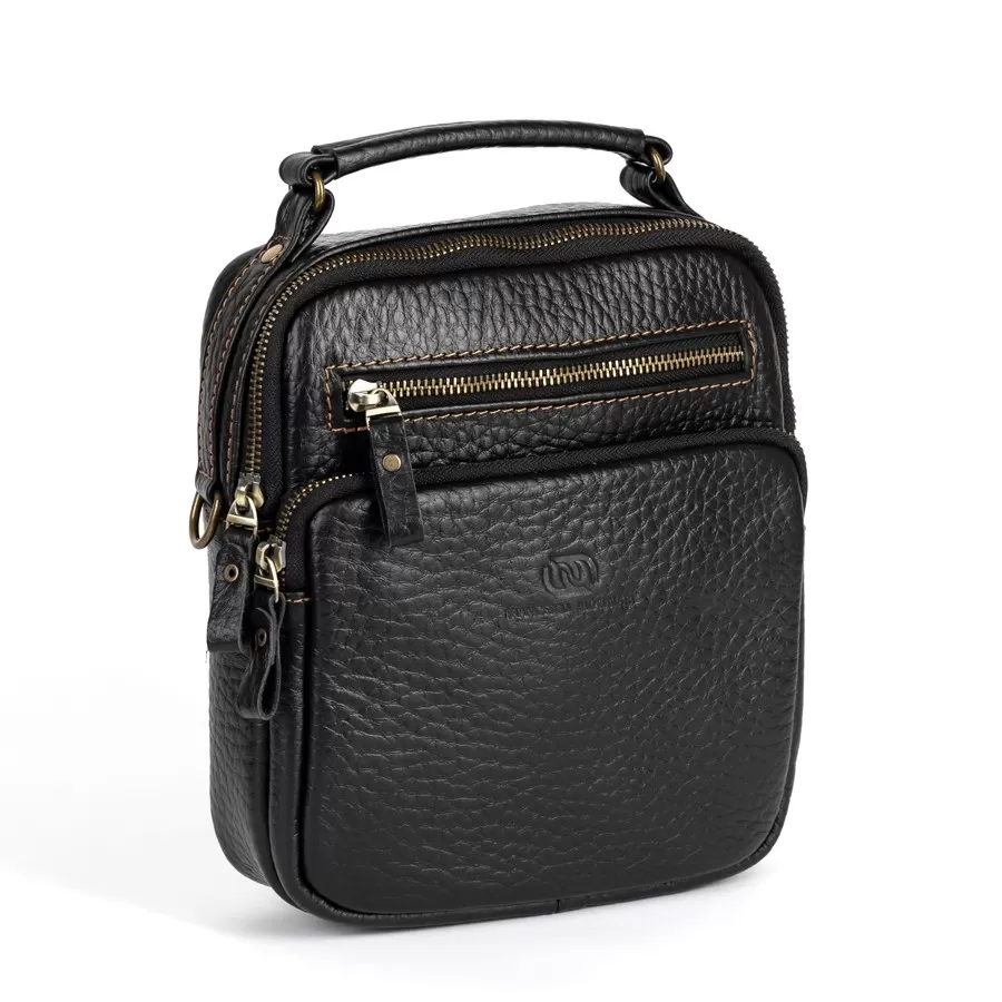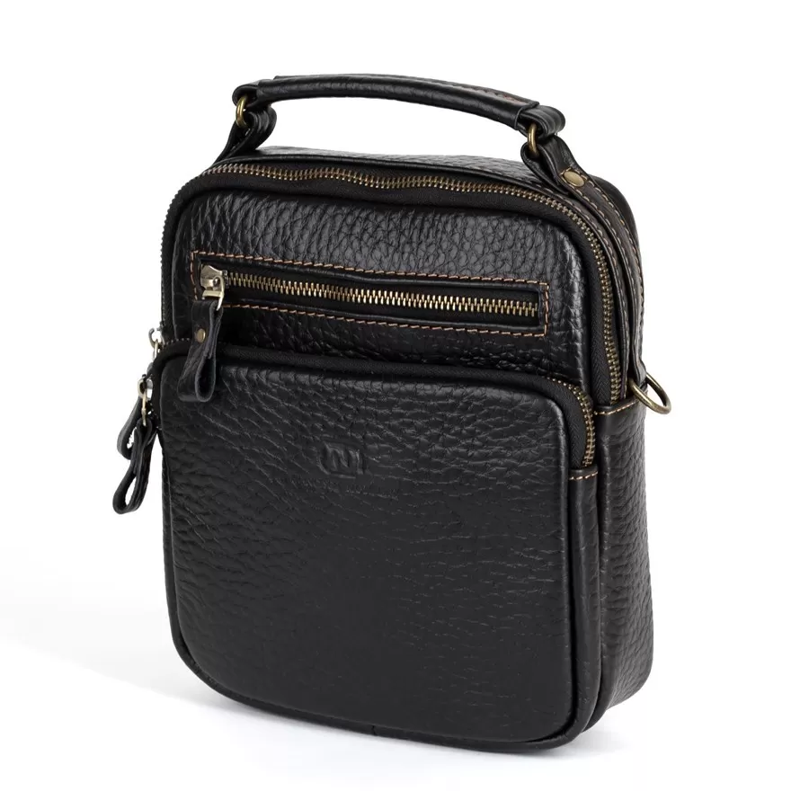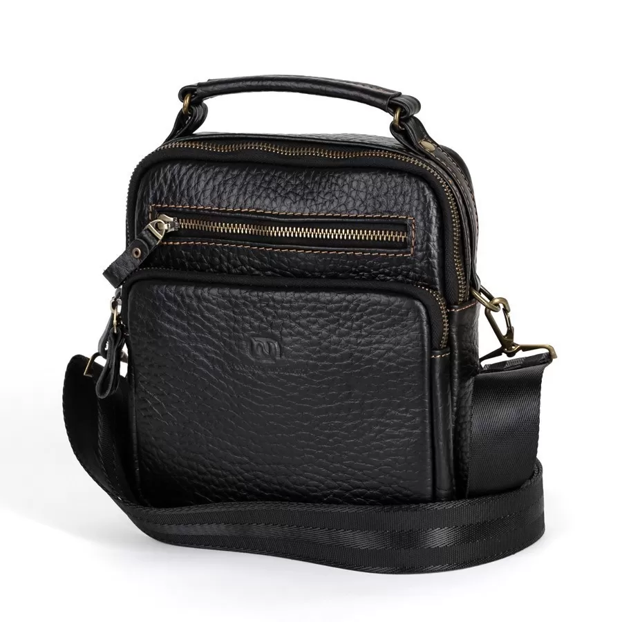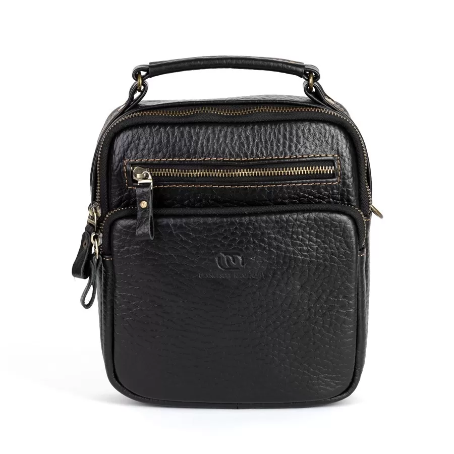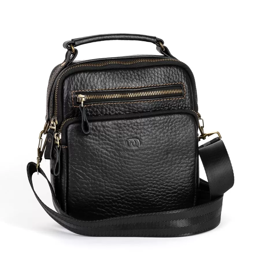 Стильный мужской планшет бренда Francesco Molinary из натуральной кожи черного цвета и рельефной структуры. Модель с одной ручкой на заклепках. Основное отделение на молнии, также имеет потайной карман. Внутри фирменная подкладка. Присутствуют 2 кармана лицевой стороне и 1 задний карман на молниях. В комплекте есть плечевой ремень