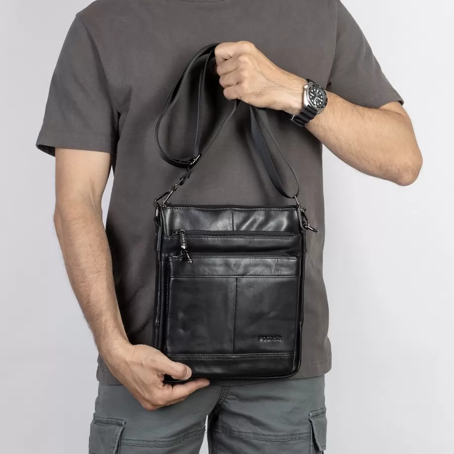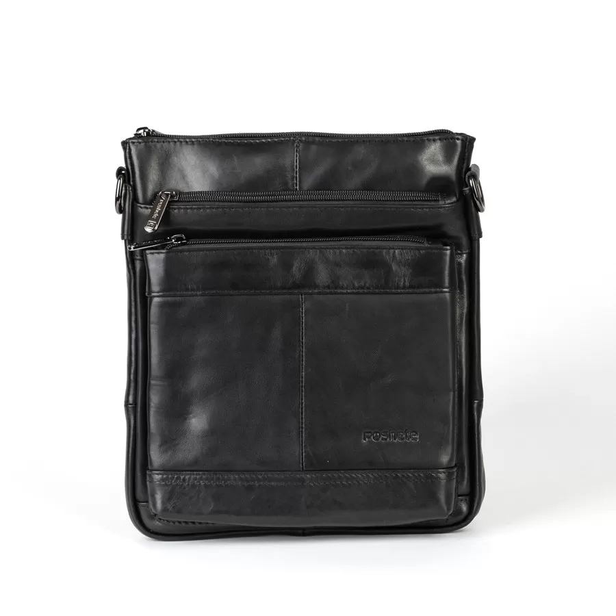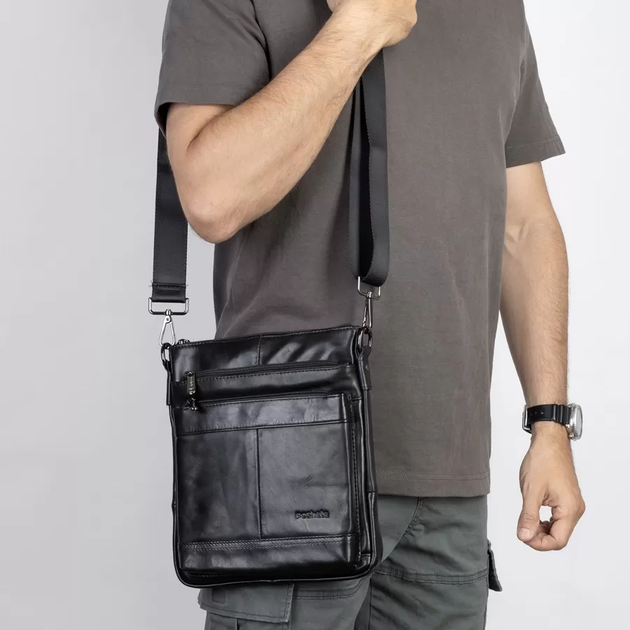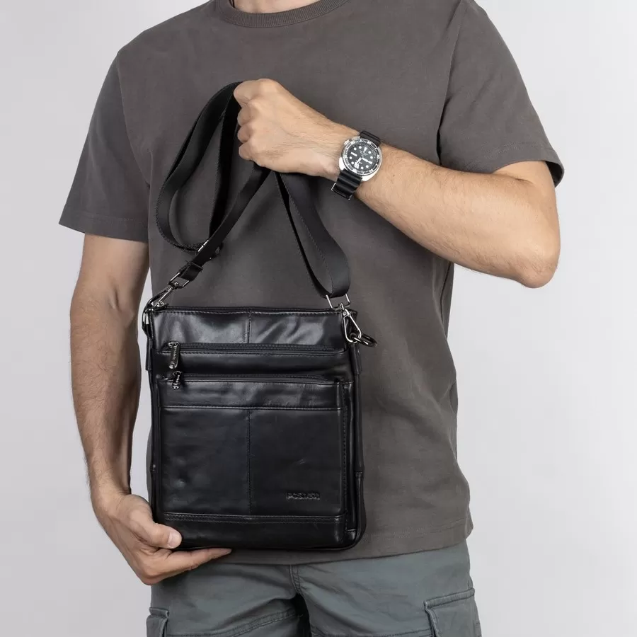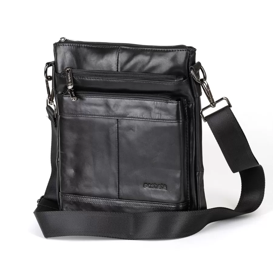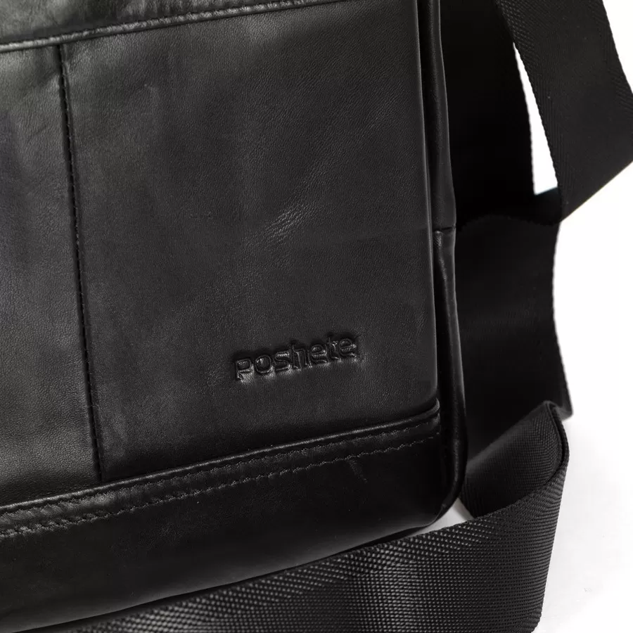 Сумка-планшет бренда Poshete из натуральной гладкой кожи черного цвета. Прошита фирменной подкладочной тканью. Имеет текстильные плечевой ремень. Внутри основного отделения под молнией карман на молнии и 2 кармашка для мелких вещей. На лицевой стороне имеются дополнительное отделение под молнией и карман на молнии. На задней стороне есть карман на молнии