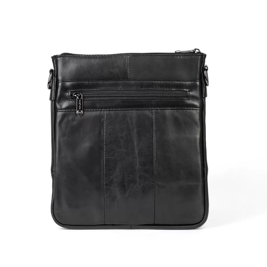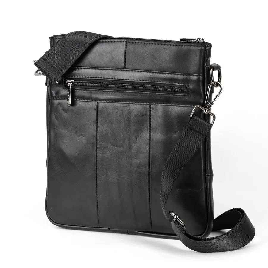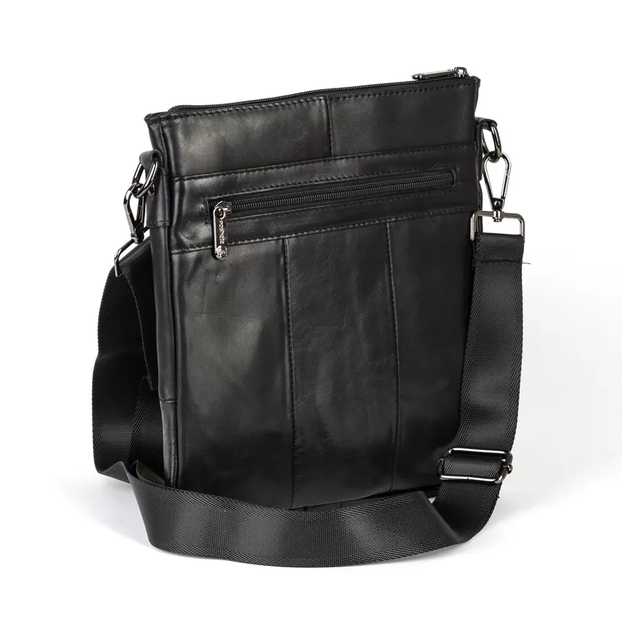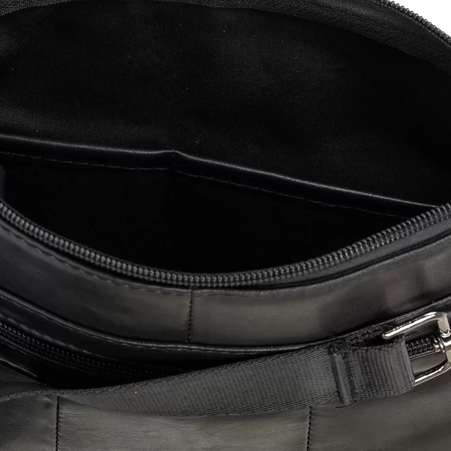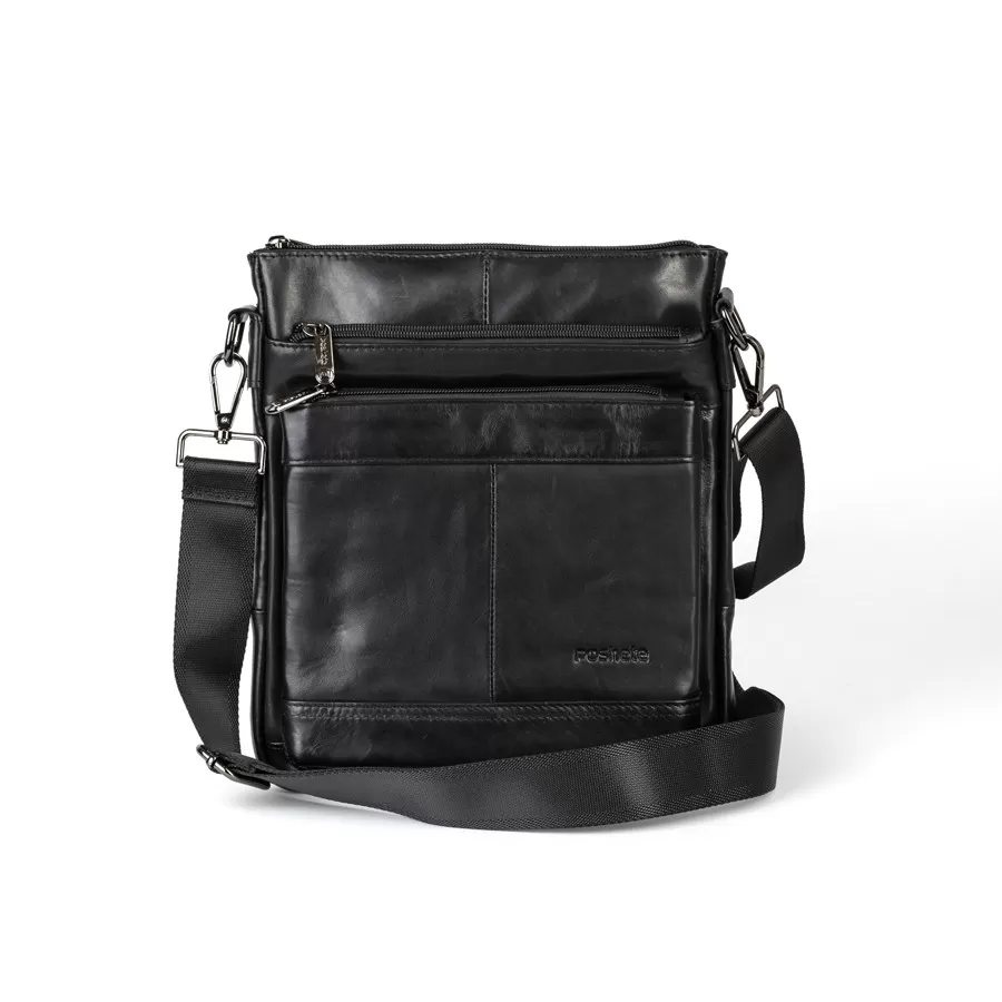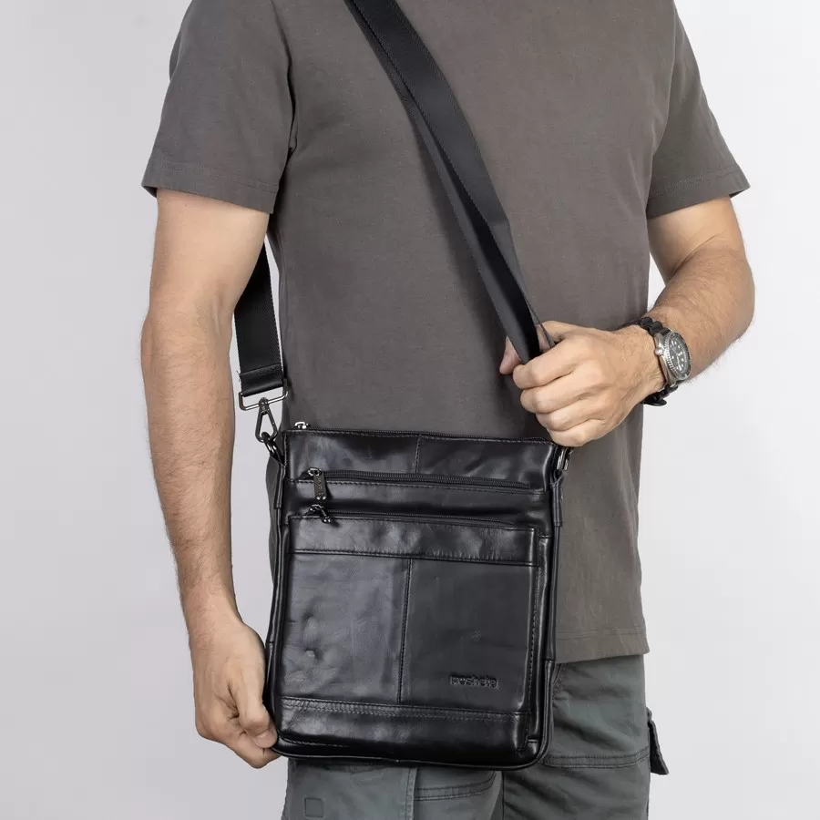 Сумка-планшет бренда Poshete из натуральной гладкой кожи черного цвета. Прошита фирменной подкладочной тканью. Имеет текстильные плечевой ремень. Внутри основного отделения под молнией карман на молнии и 2 кармашка для мелких вещей. На лицевой стороне имеются дополнительное отделение под молнией и карман на молнии. На задней стороне есть карман на молнии