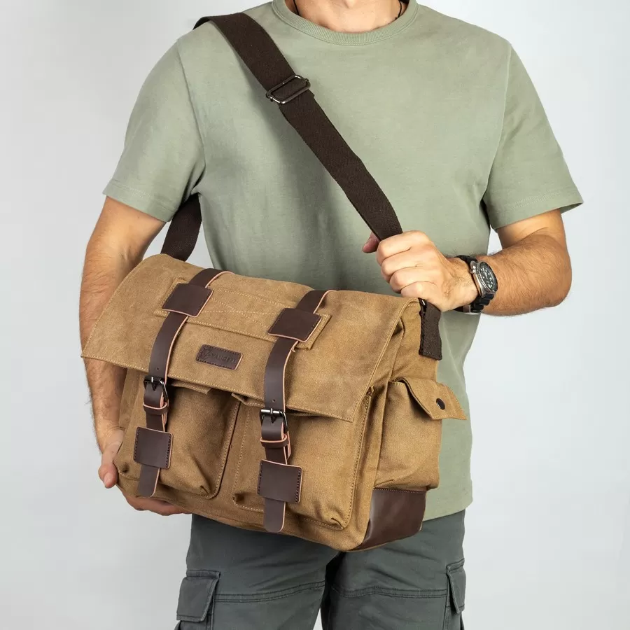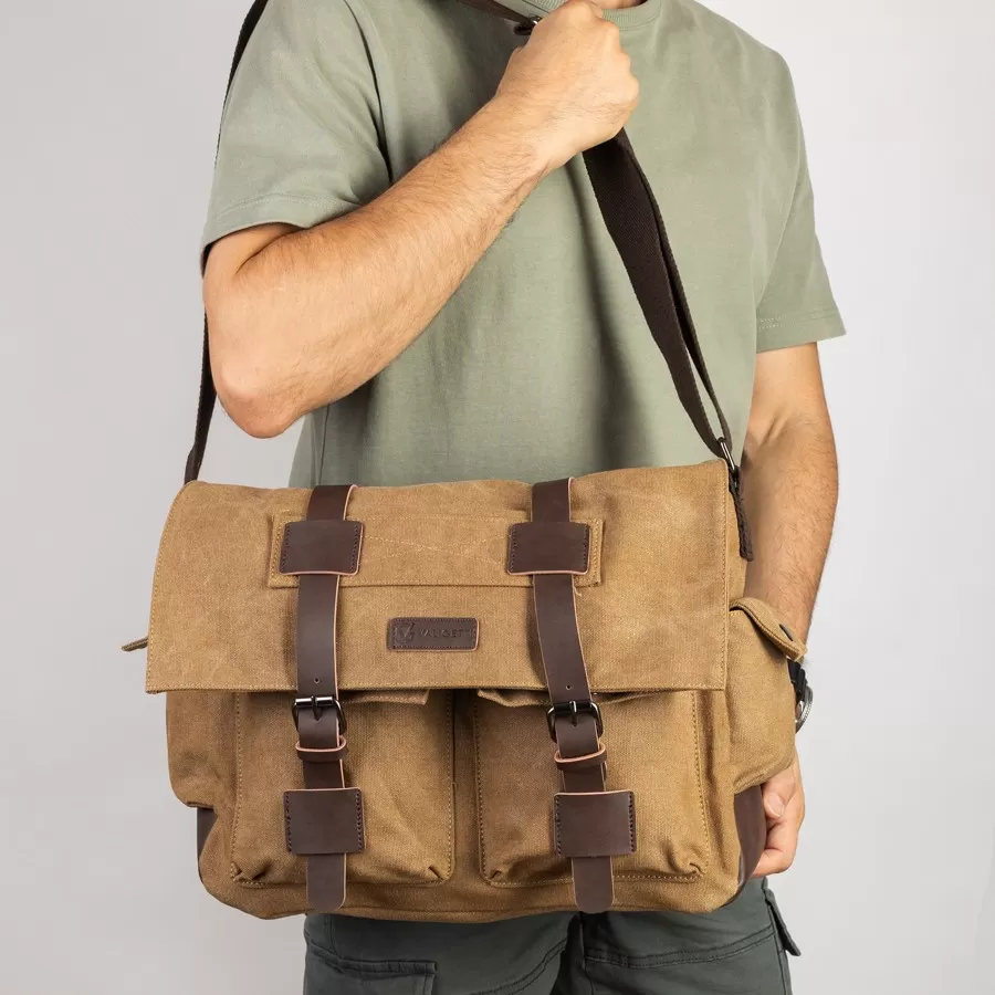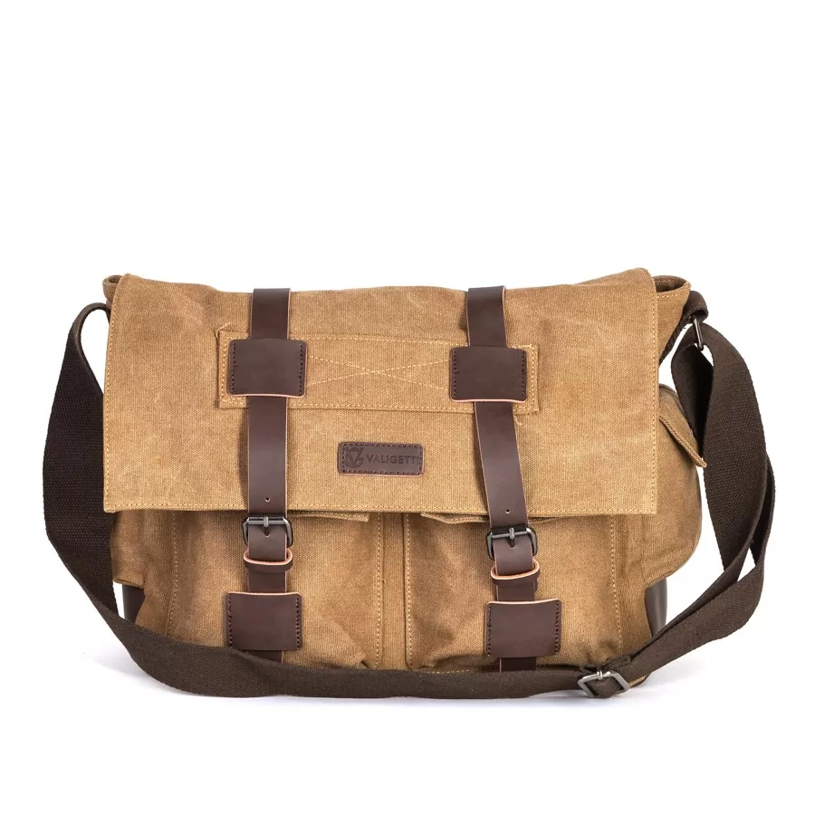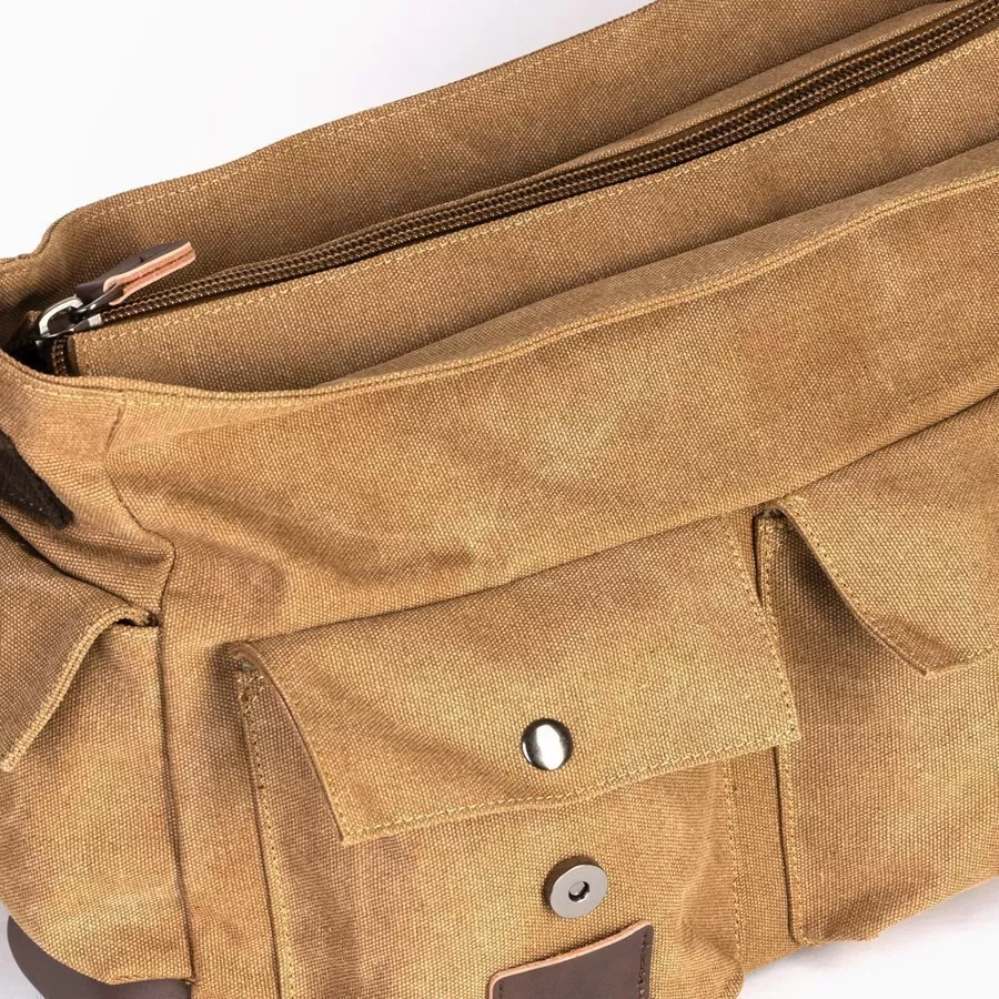 Сумка от торговой марки Valigetti выполнена из плотного текстильного материала цвета хаки. Модель с несъемным регулируемым плечевым ремнем. Клапан на магнитных кнопках закрывает отделение на молнии. Внутри: текстильная подкладка, карман на молнии, накладной карман с уплотненной стенкой. На лицевой стороне и по бокам - накладные карманы с клапаном, декорированные пряжкой. На задней стороне - карман на молнии.