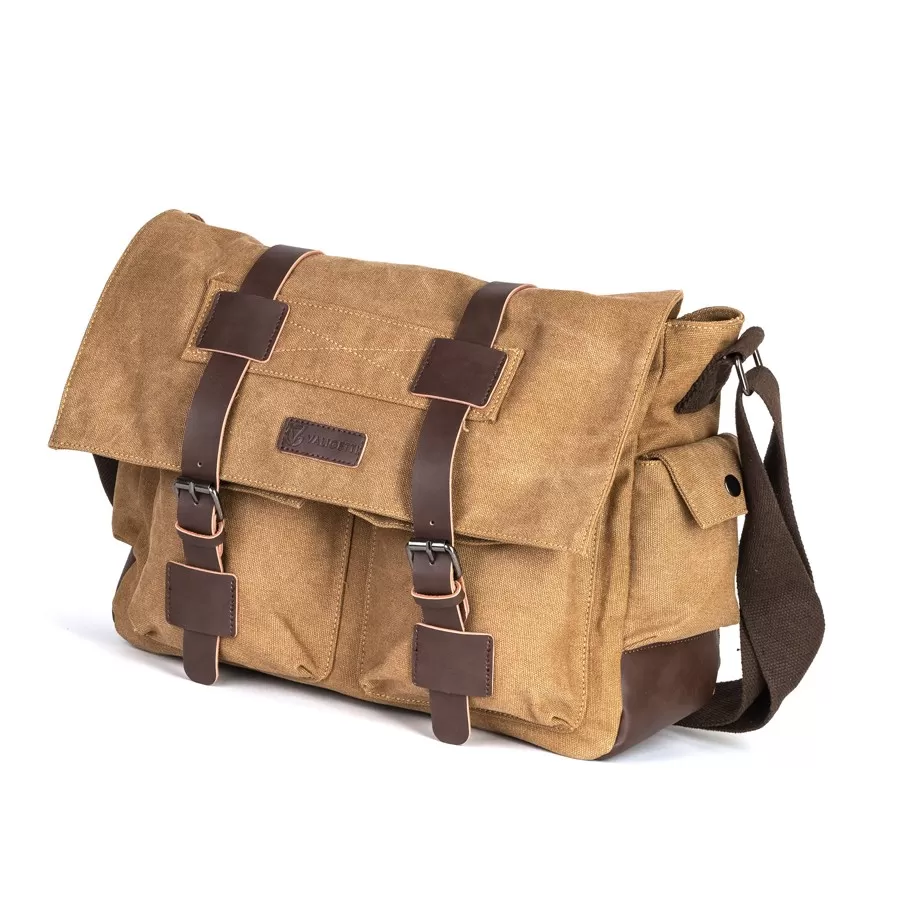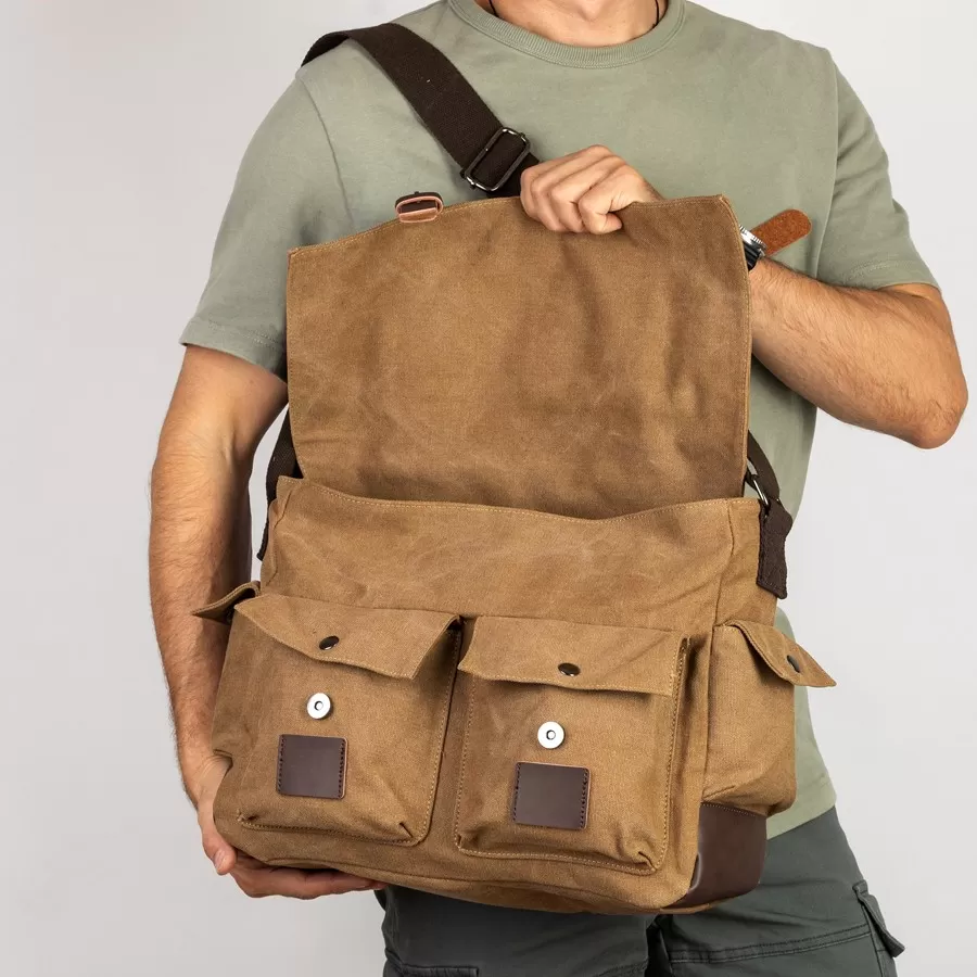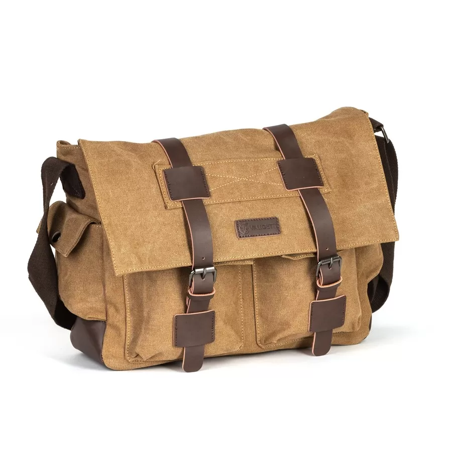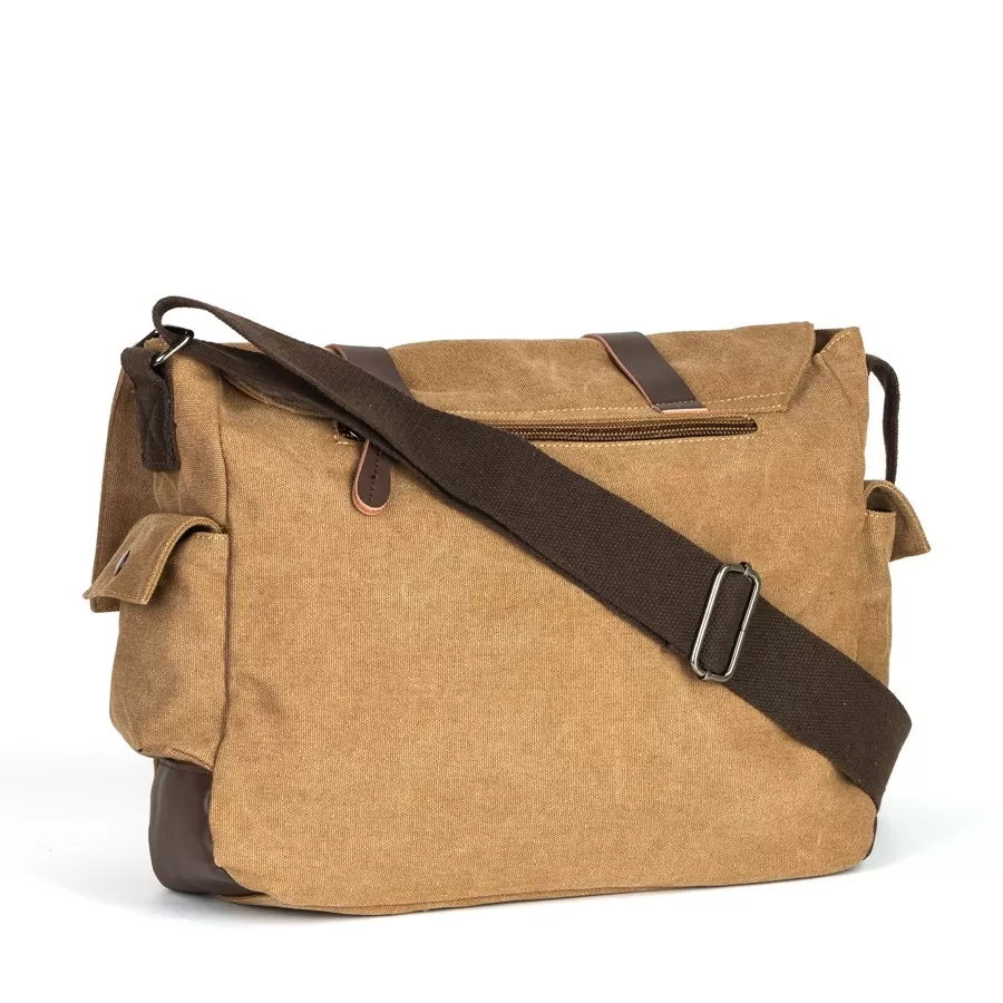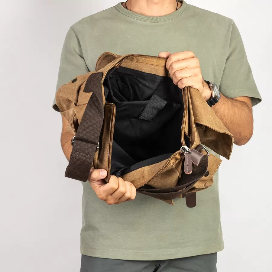 Сумка от торговой марки Valigetti выполнена из плотного текстильного материала цвета хаки. Модель с несъемным регулируемым плечевым ремнем. Клапан на магнитных кнопках закрывает отделение на молнии. Внутри: текстильная подкладка, карман на молнии, накладной карман с уплотненной стенкой. На лицевой стороне и по бокам - накладные карманы с клапаном, декорированные пряжкой. На задней стороне - карман на молнии.