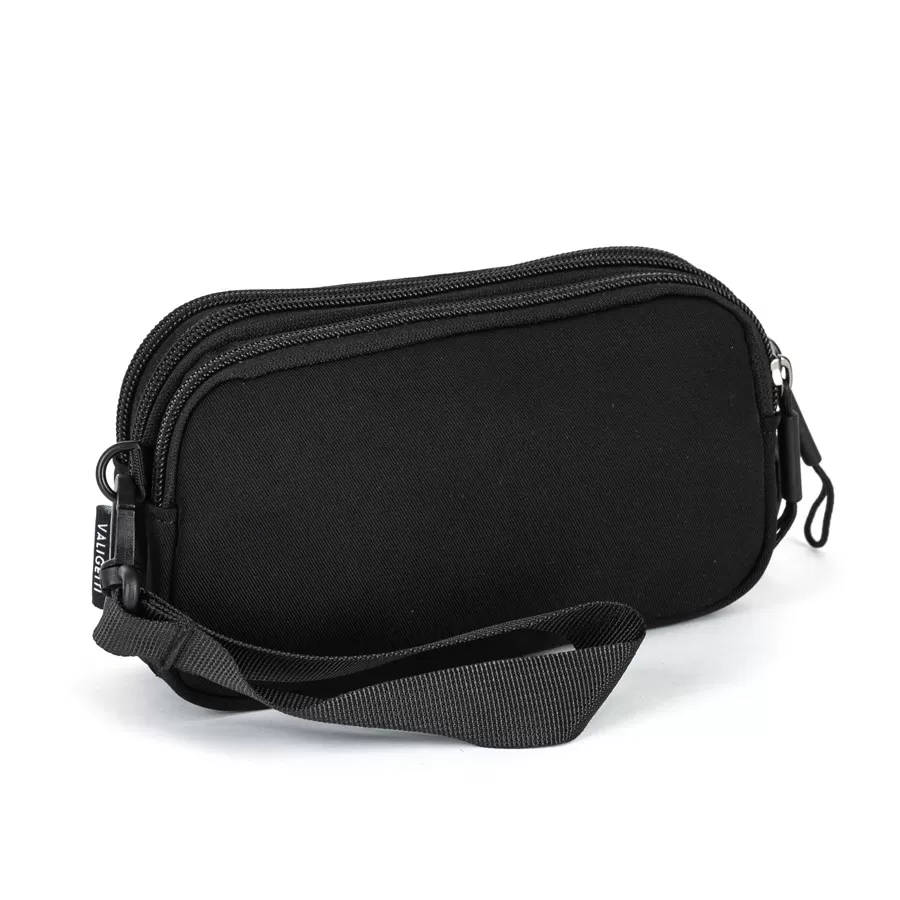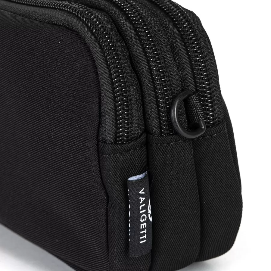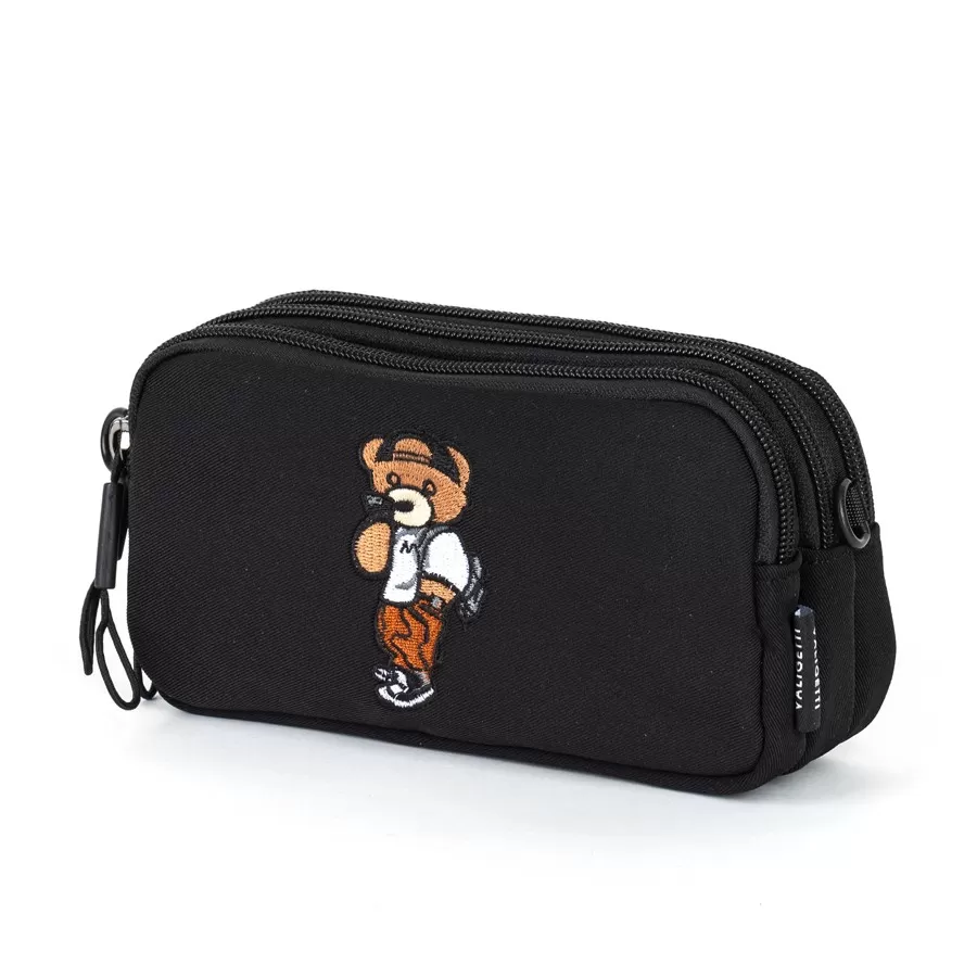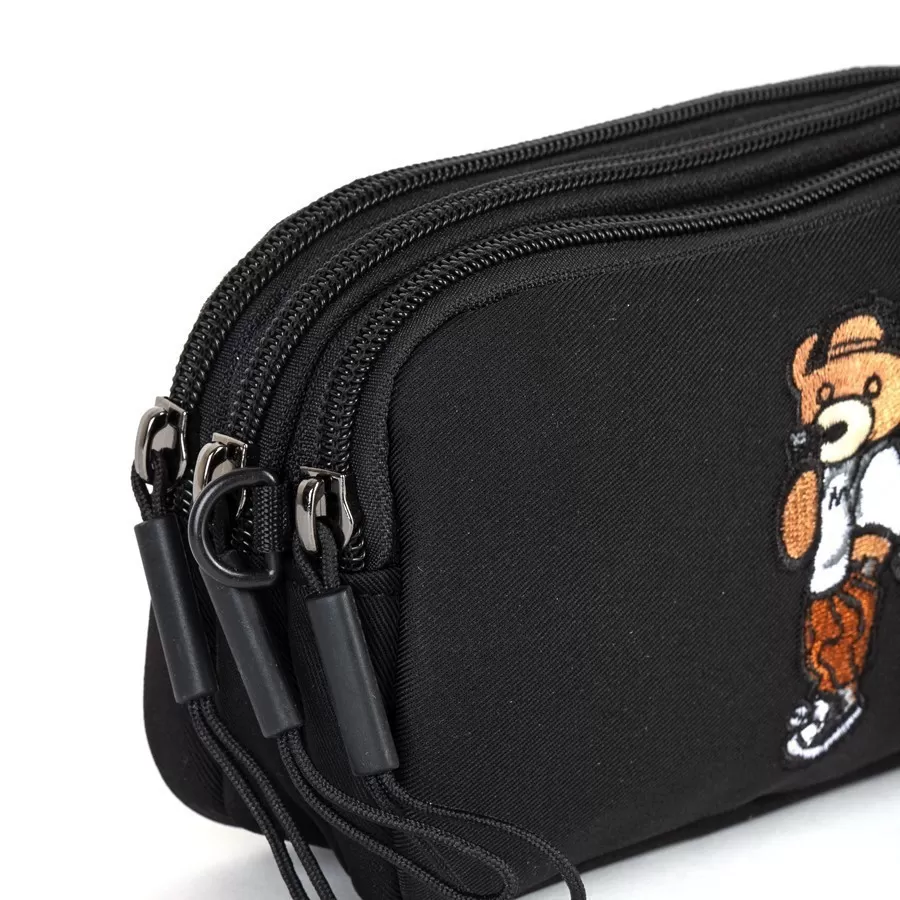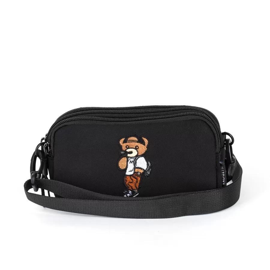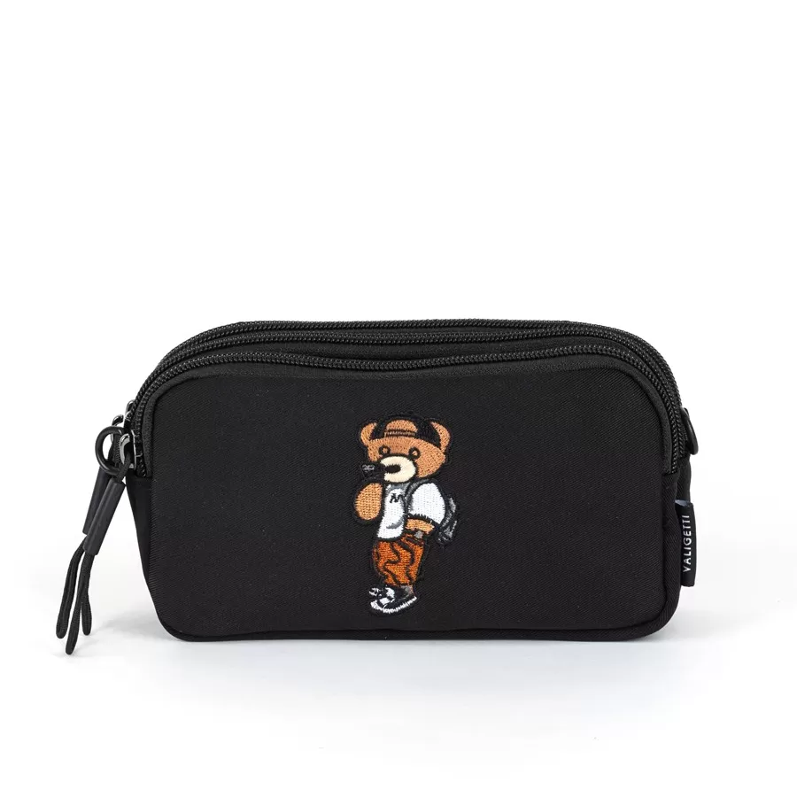 Сумка от торговой марки Valigetti из практичного материала черного цвета. Модель со съемным регулируемым плечевым и поясным ремнем, съемным ремешком для запястья. Три отделения на молнии, с текстильной подкладкой; в заднем – карман на молнии. Лицевая сторона декорирована аппликацией в виде мишки. Молодежная текстильная коллекция представлена моделями, выполненными из трех видов материалов: прочной ткани рип-стоп, блестящего и матового текстиля. Фурнитура повышенной прочности обеспечивает плавность движения замка и долговечность использования.