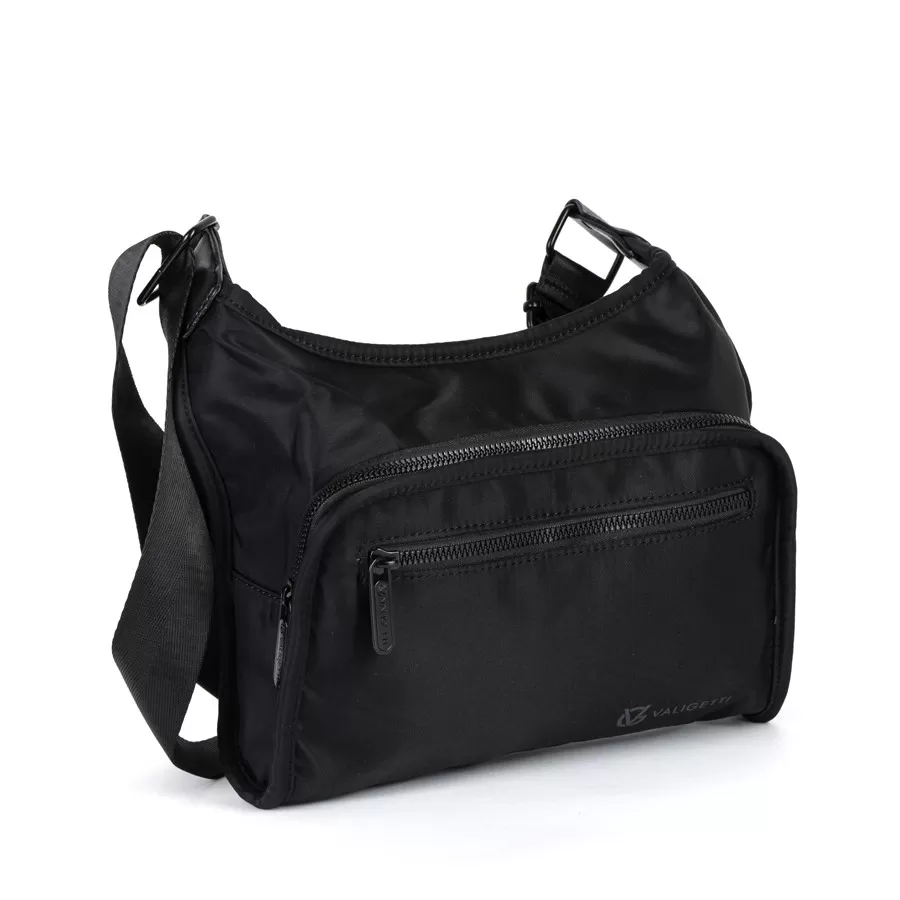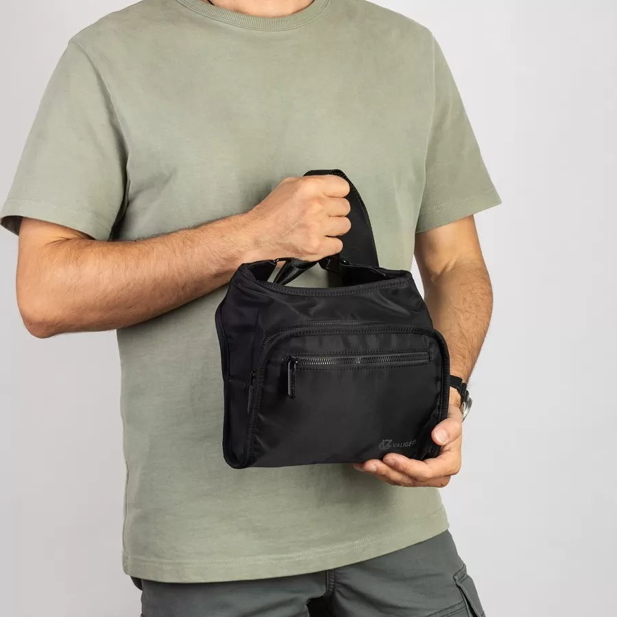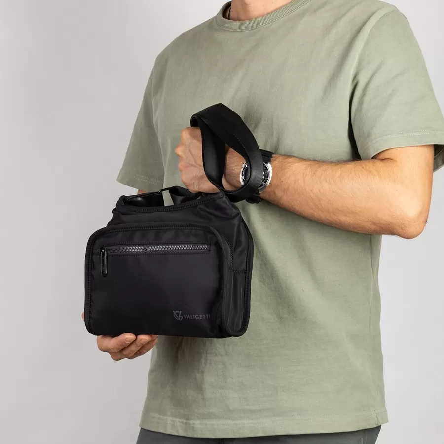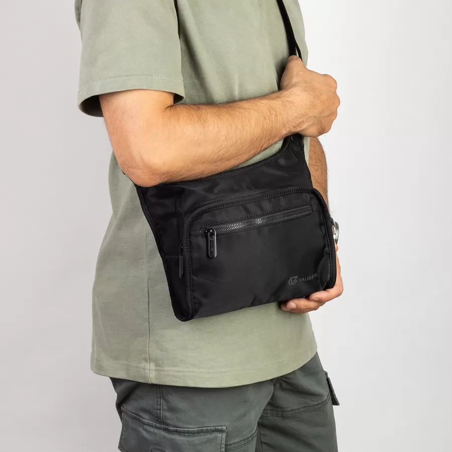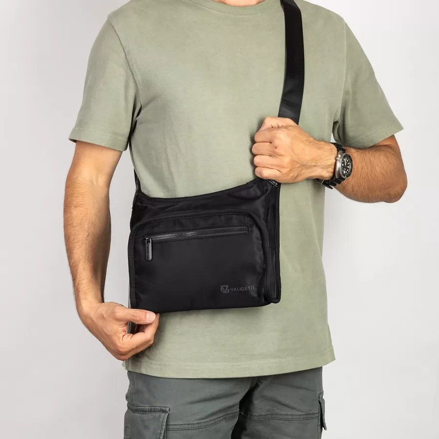 Мужская сумка-планшет от бренда Valigetti выполнена в черном цвете из текстиля. Модель с несъемным регулируемым текстильным плечевым ремнем. Одно основное отделение на молнии, внутри фирменная текстильная подкладка, один накладной карман на молнии и 2 кармашка для мелких вещей. На лицевой и задней сторонах по карману на молнии