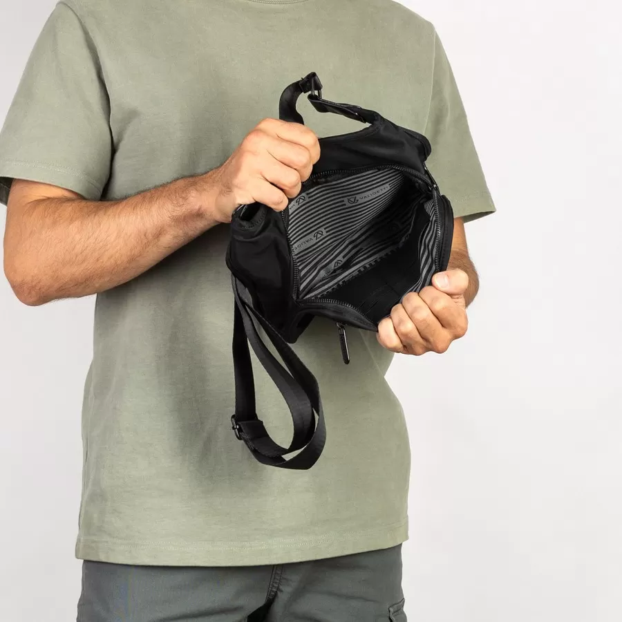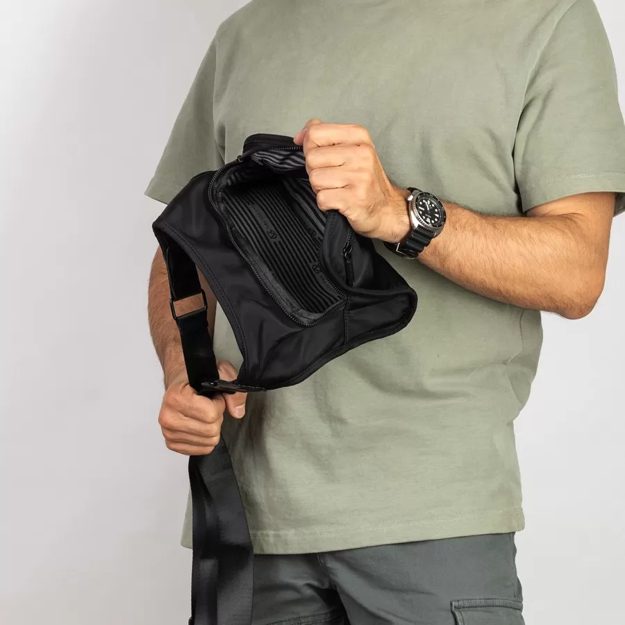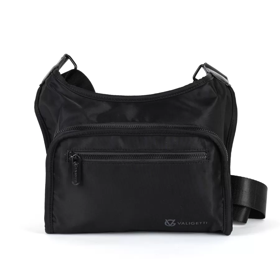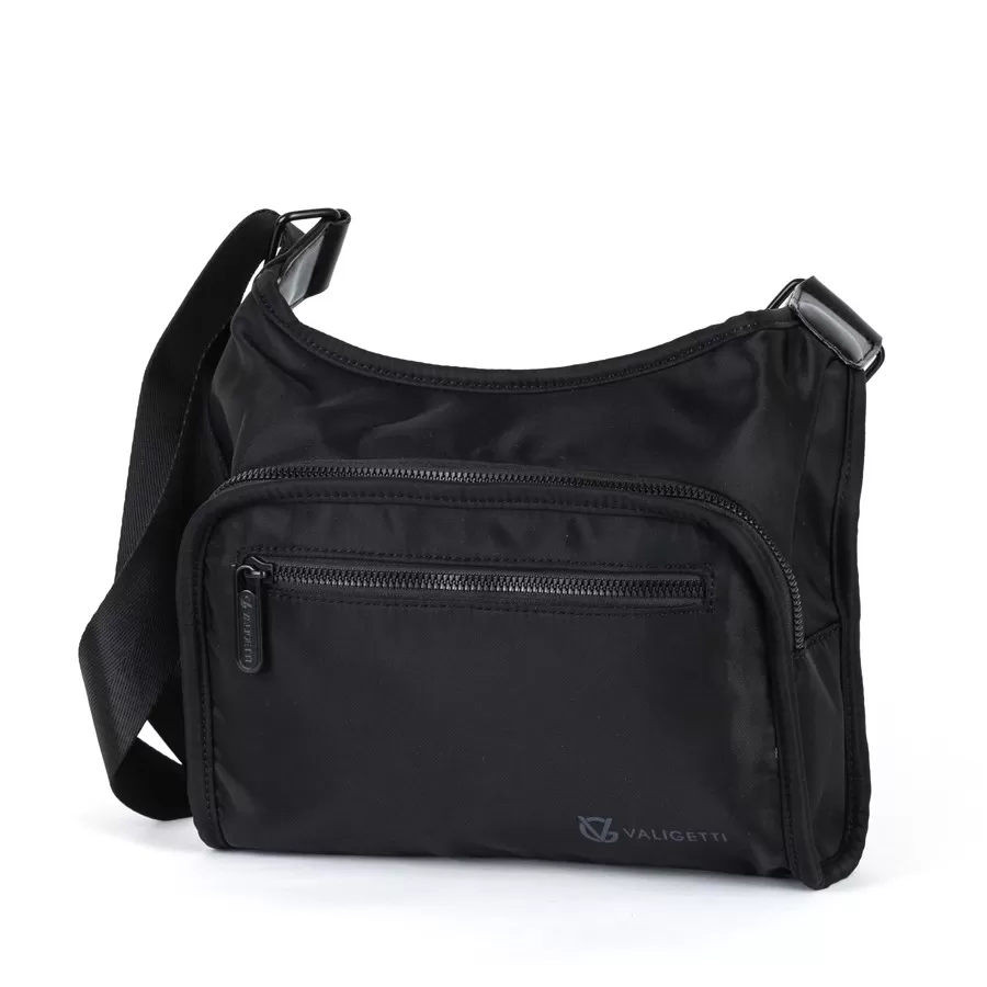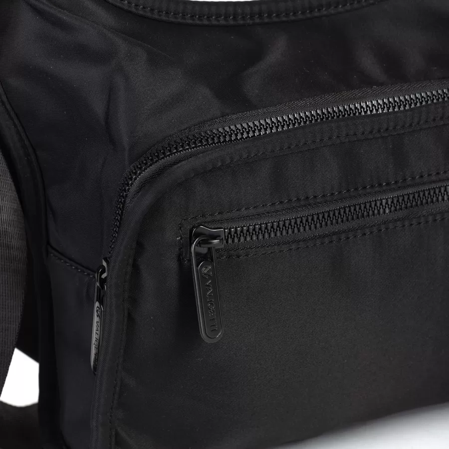 Мужская сумка-планшет от бренда Valigetti выполнена в черном цвете из текстиля. Модель с несъемным регулируемым текстильным плечевым ремнем. Одно основное отделение на молнии, внутри фирменная текстильная подкладка, один накладной карман на молнии и 2 кармашка для мелких вещей. На лицевой и задней сторонах по карману на молнии