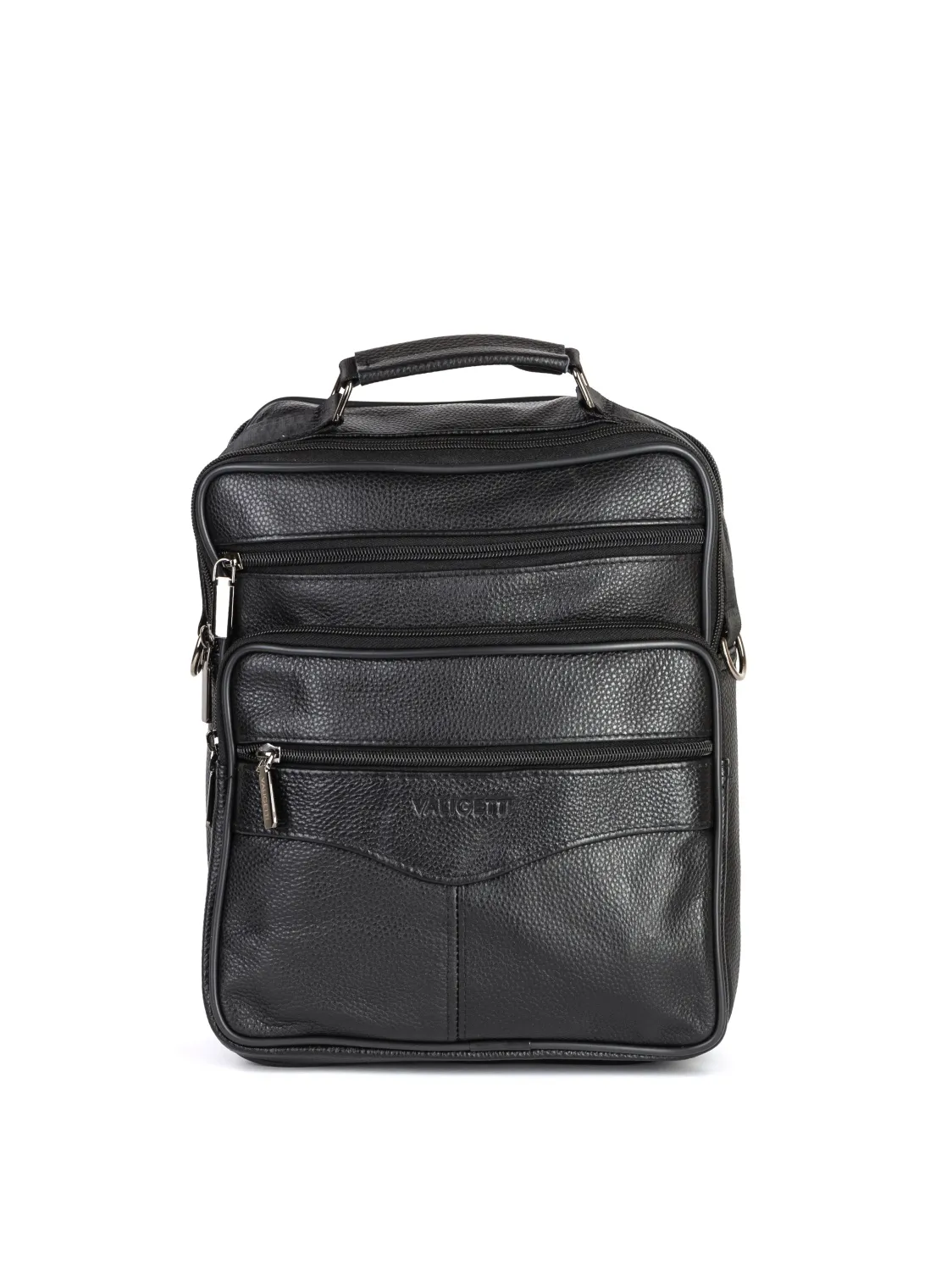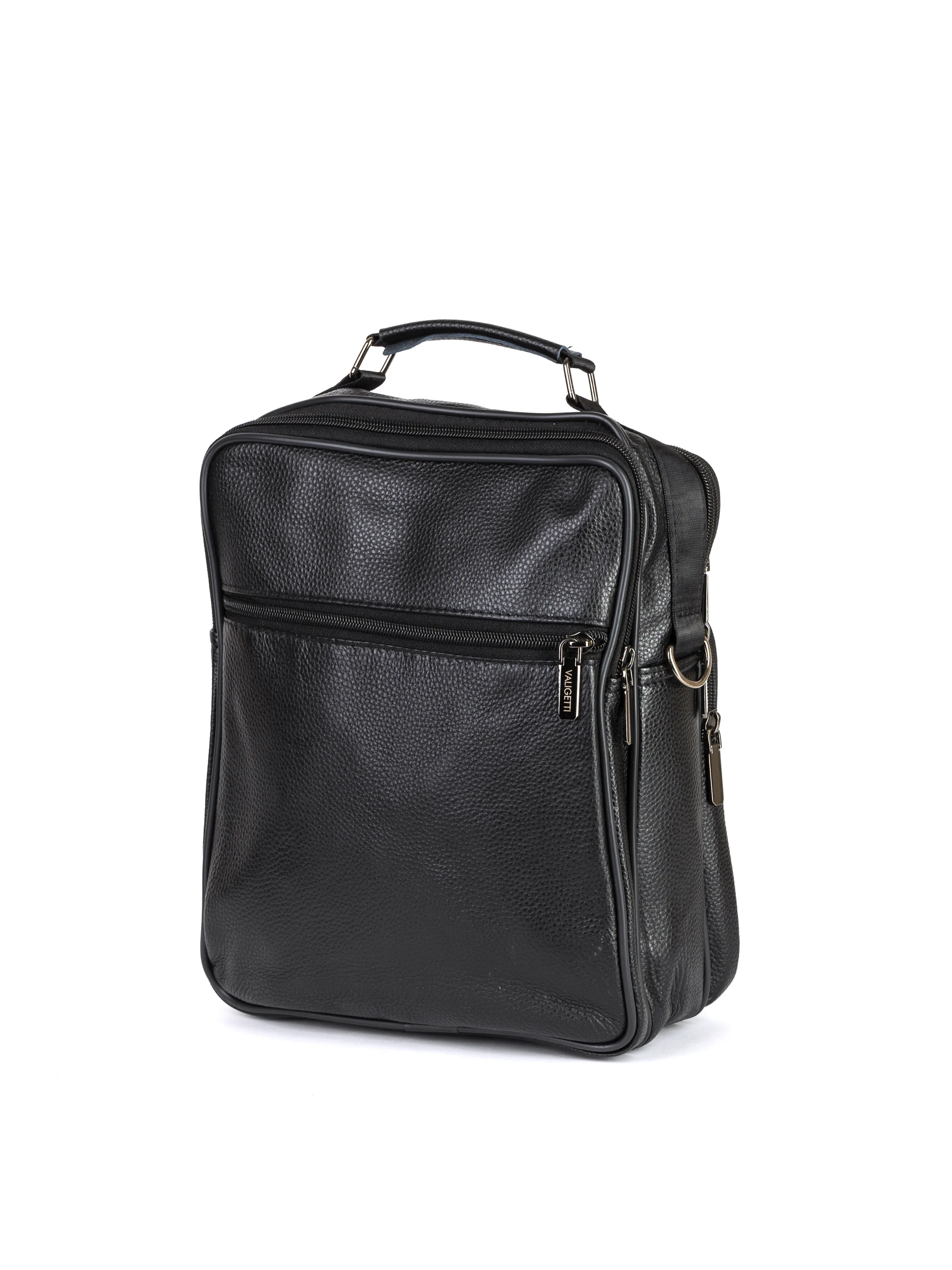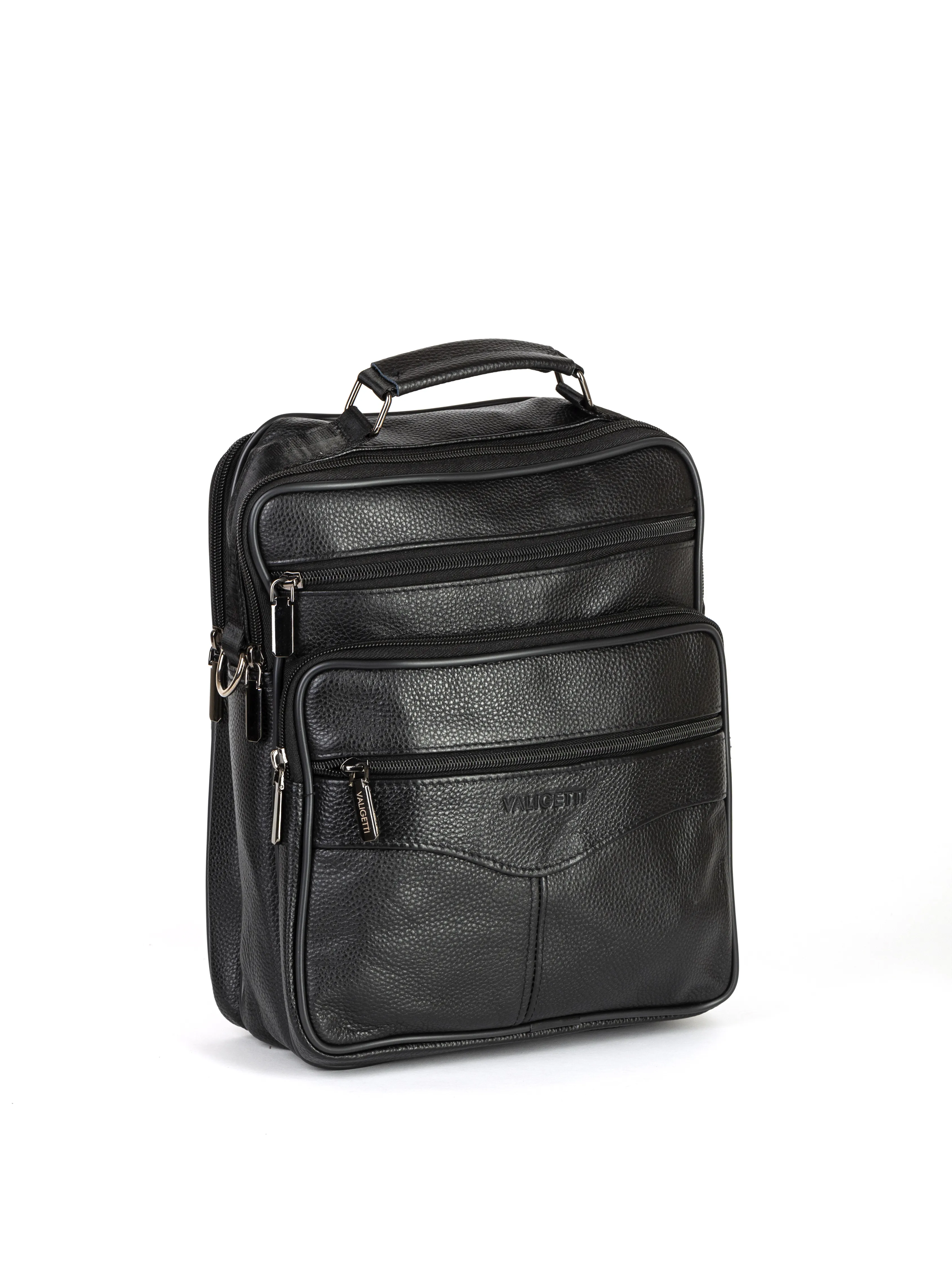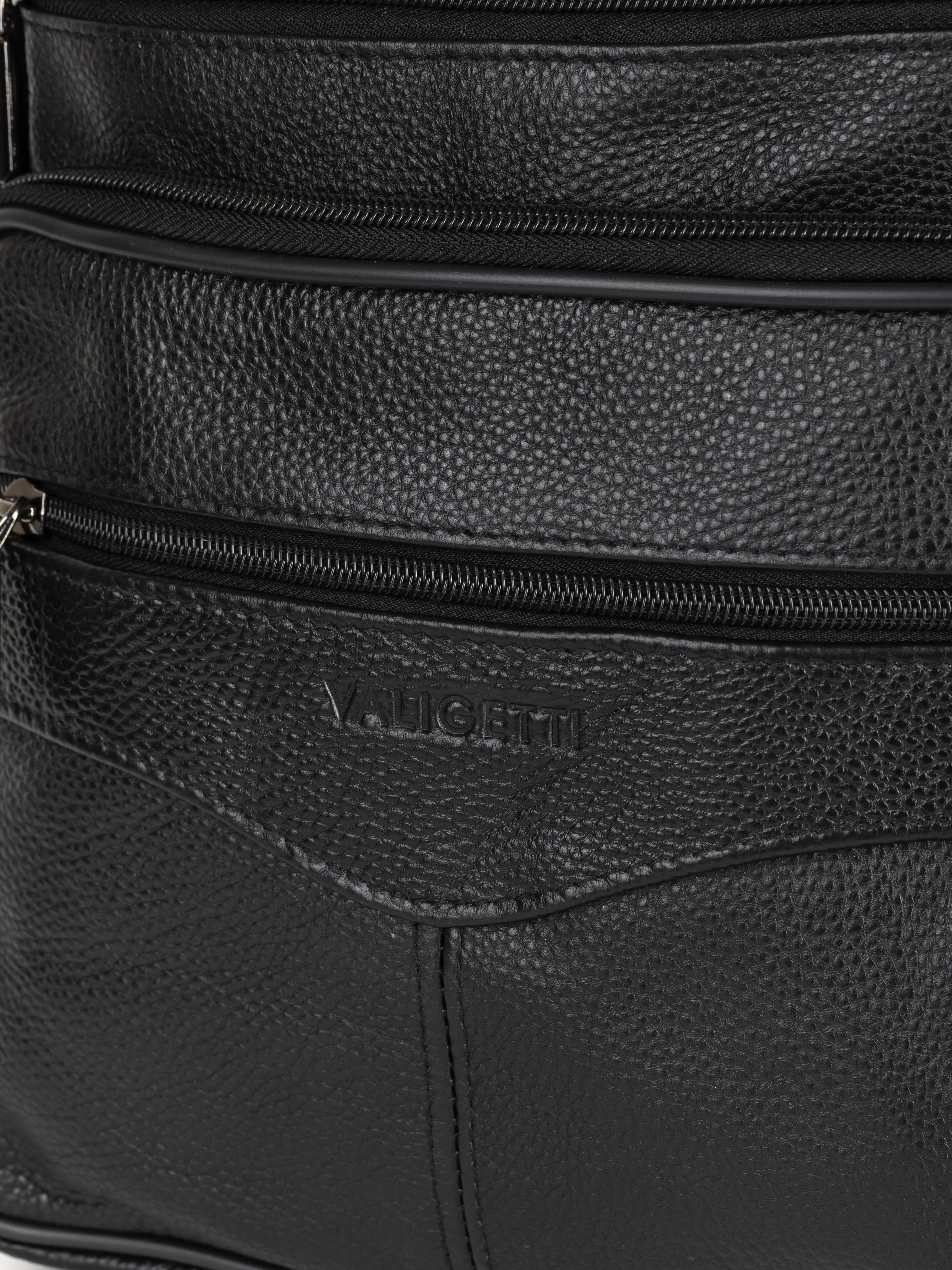 Сумка от торговой марки Valigetti выполнена из натуральной кожи черного цвета. Модель с ручкой для переноски и съемным регулируемым плечевым ремнем. Два отделения на молнии, внутри текстильная подкладка. С лицевой стороны - три кармана на молнии. С задней стороны - карман на молнии.