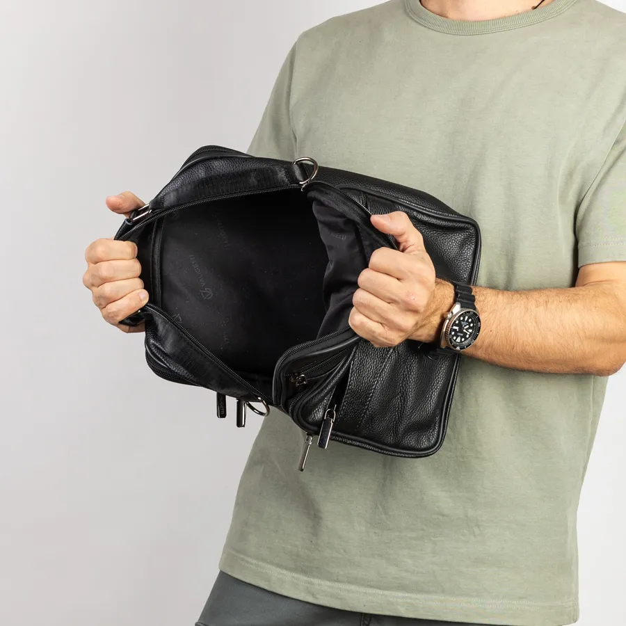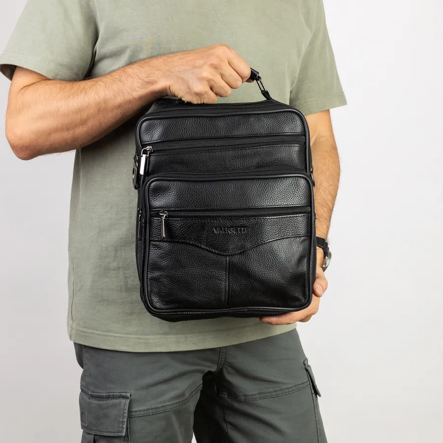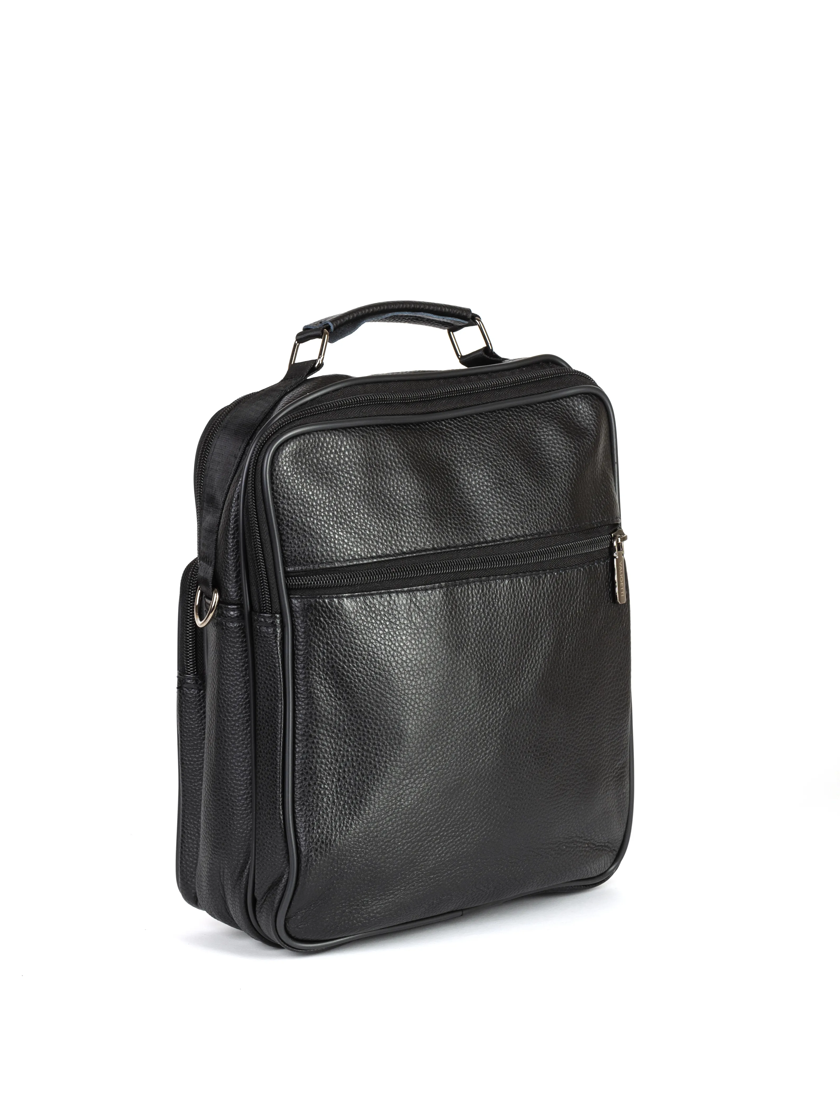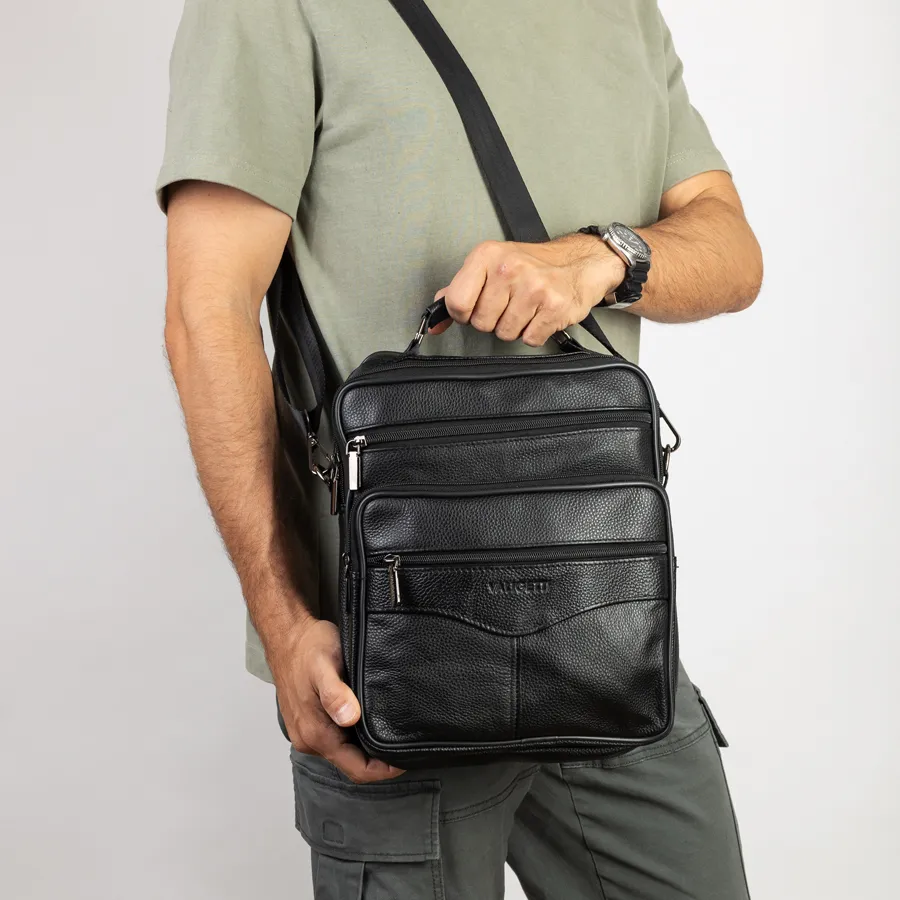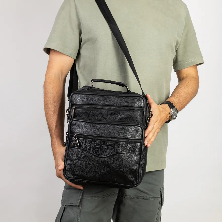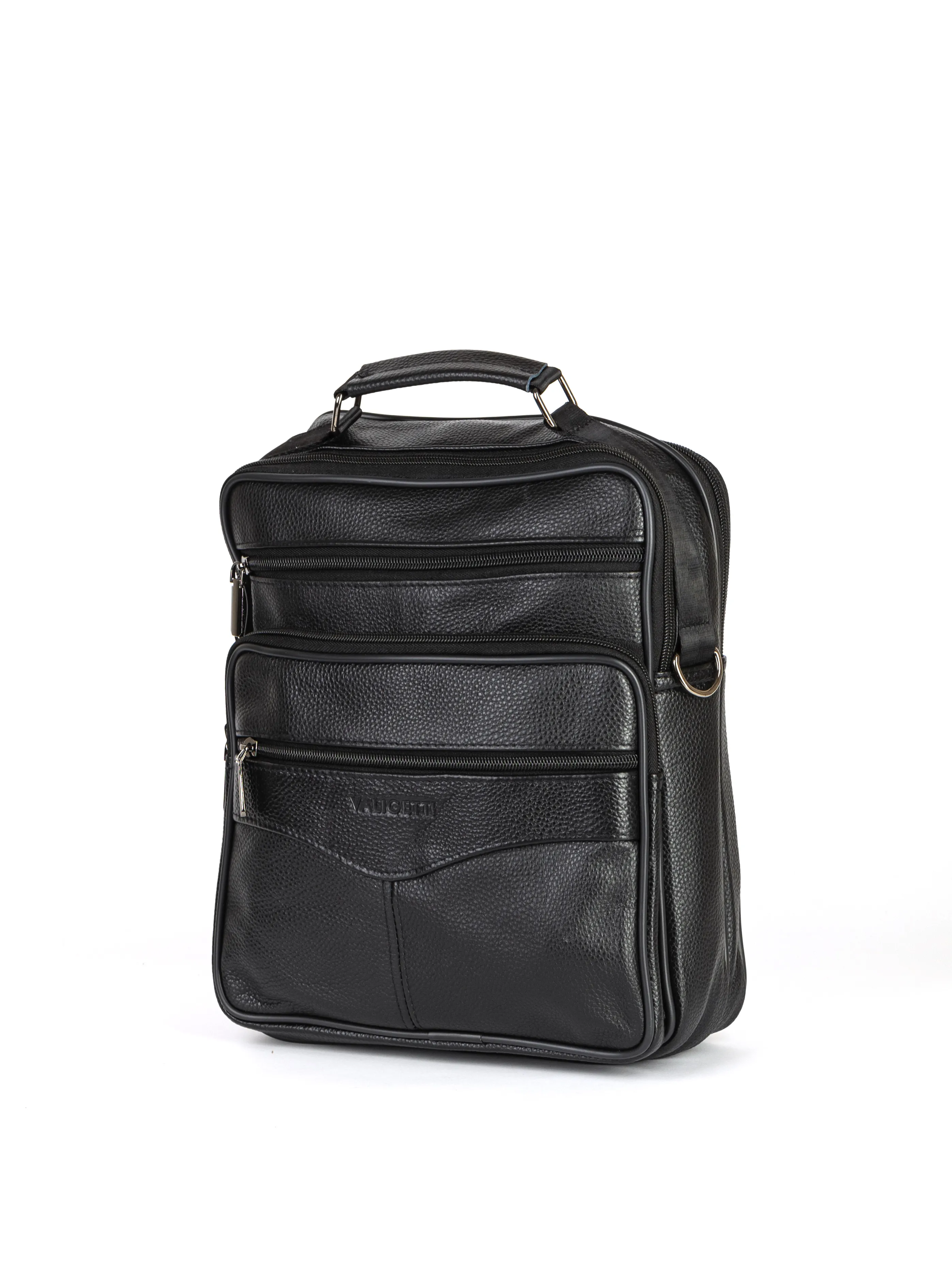Сумка от торговой марки Valigetti выполнена из натуральной кожи черного цвета. Модель с ручкой для переноски и съемным регулируемым плечевым ремнем. Два отделения на молнии, внутри текстильная подкладка. С лицевой стороны - три кармана на молнии. С задней стороны - карман на молнии.