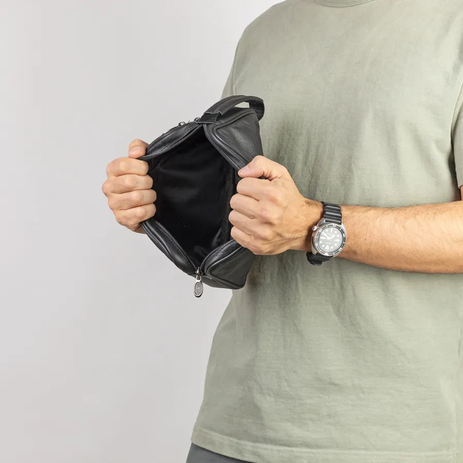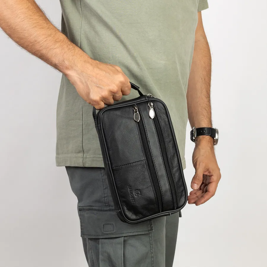 Мужская барсетка бренда Valigetti выполнена из натуральной черной кожи. У нее есть вшитая ручка для запястья. Внутри одно отделение на молнии. На лицевой стороне сумки расположены 2 кармана на молнии