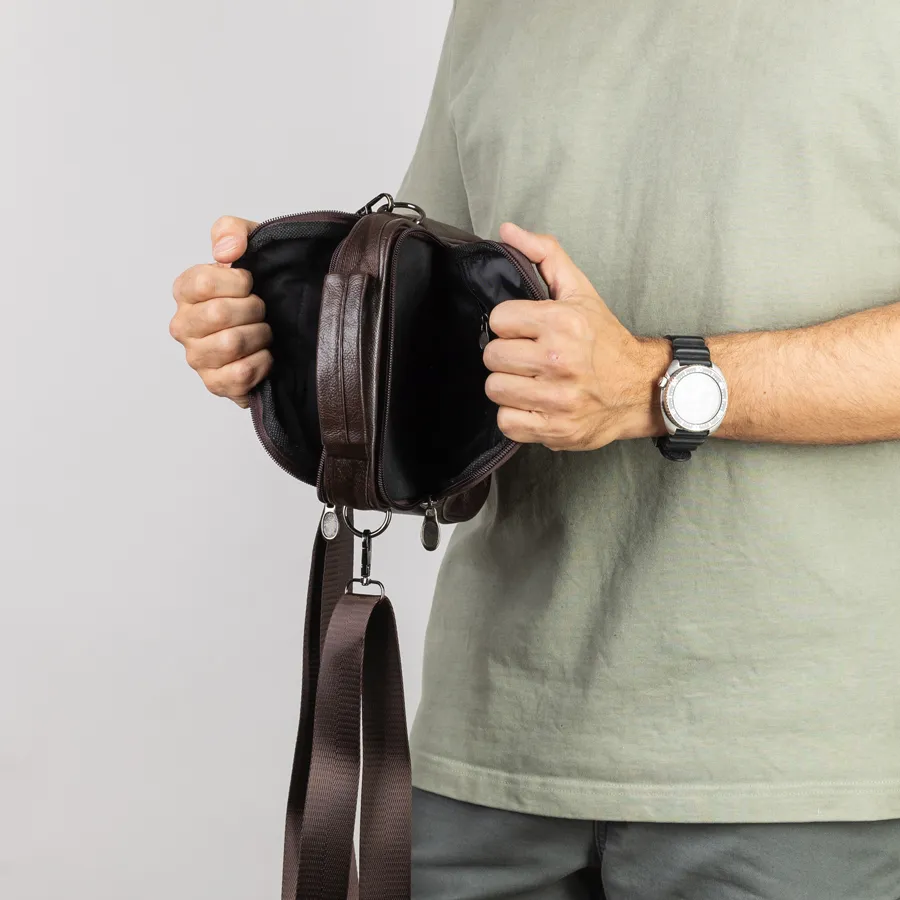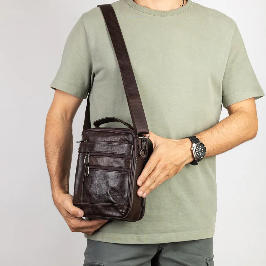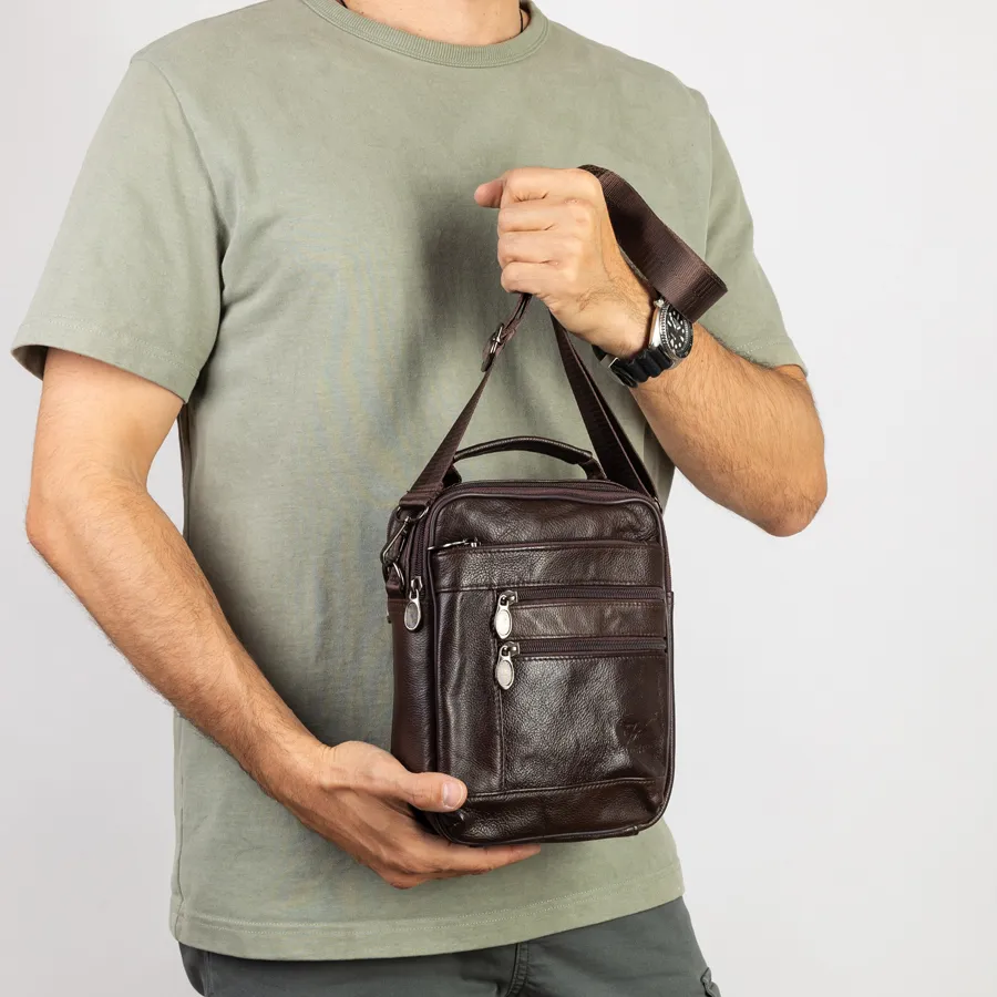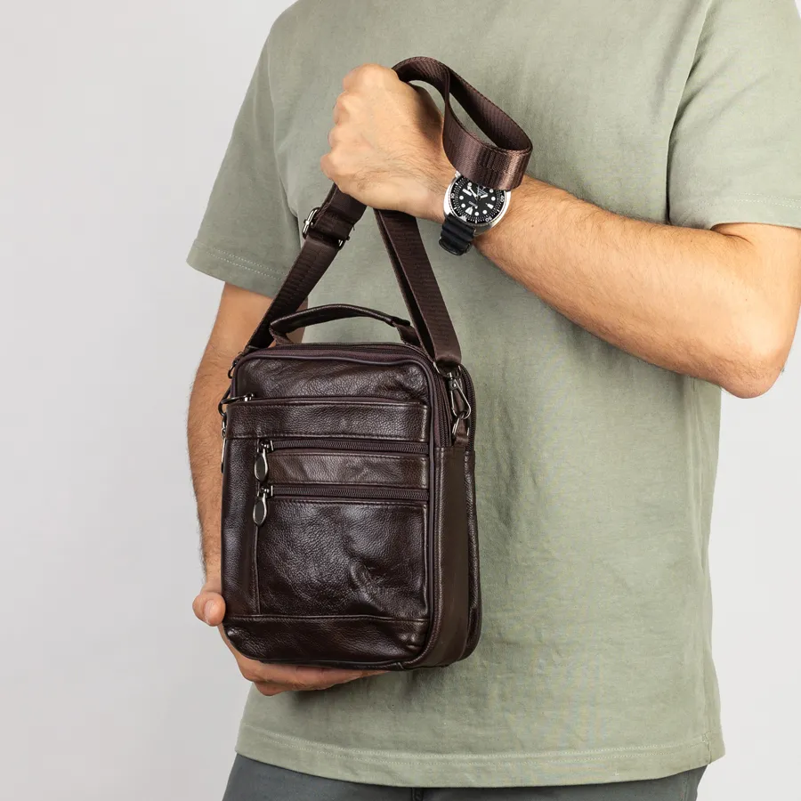 Сумка-планшет от бренда Valigetti выполнена из натуральной кожи коричневого цвета зернистой структуры. Модель оснащена широким съемным регулируемым плечевым ремнем из текстиля. Также вшитая ручка. Внутри: 2 отделения и внутренний карман на молнии. На передней стороне 3 кармана на молнии. На задней — карман на молнии