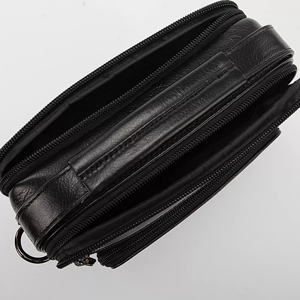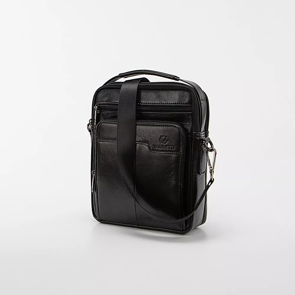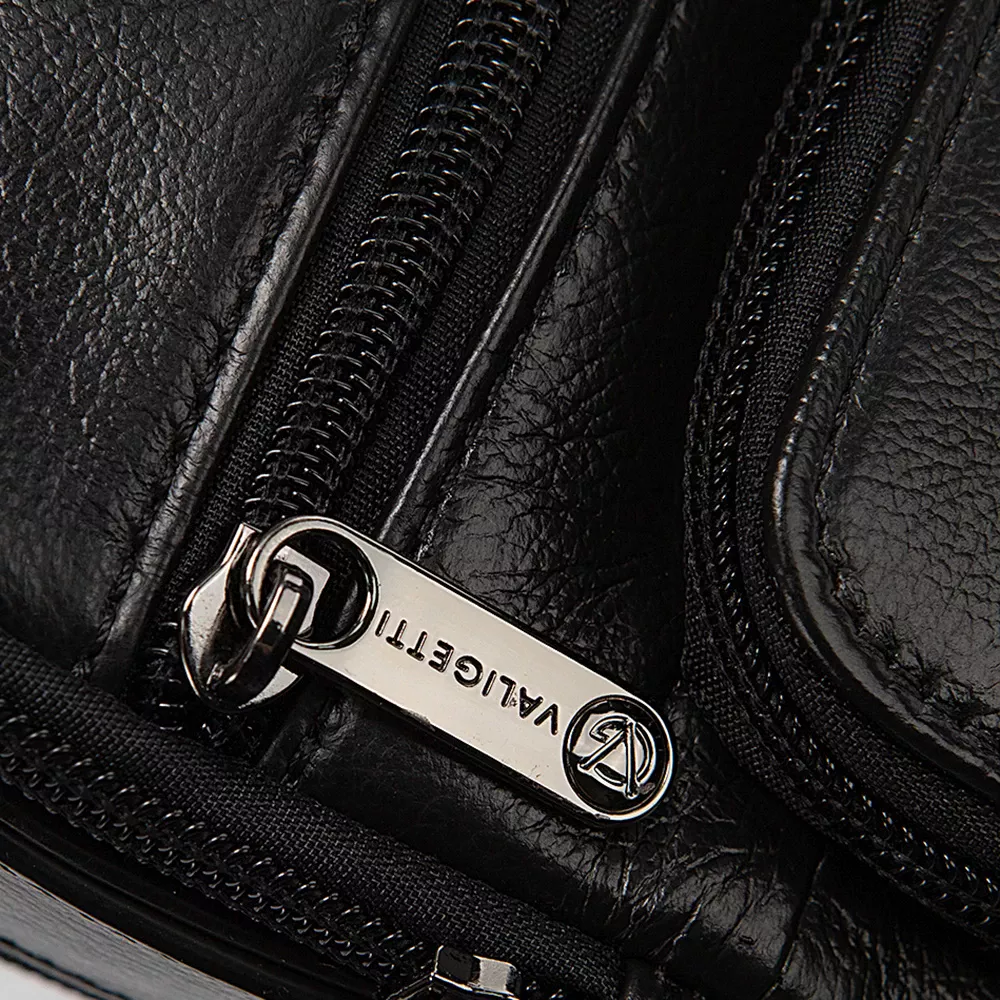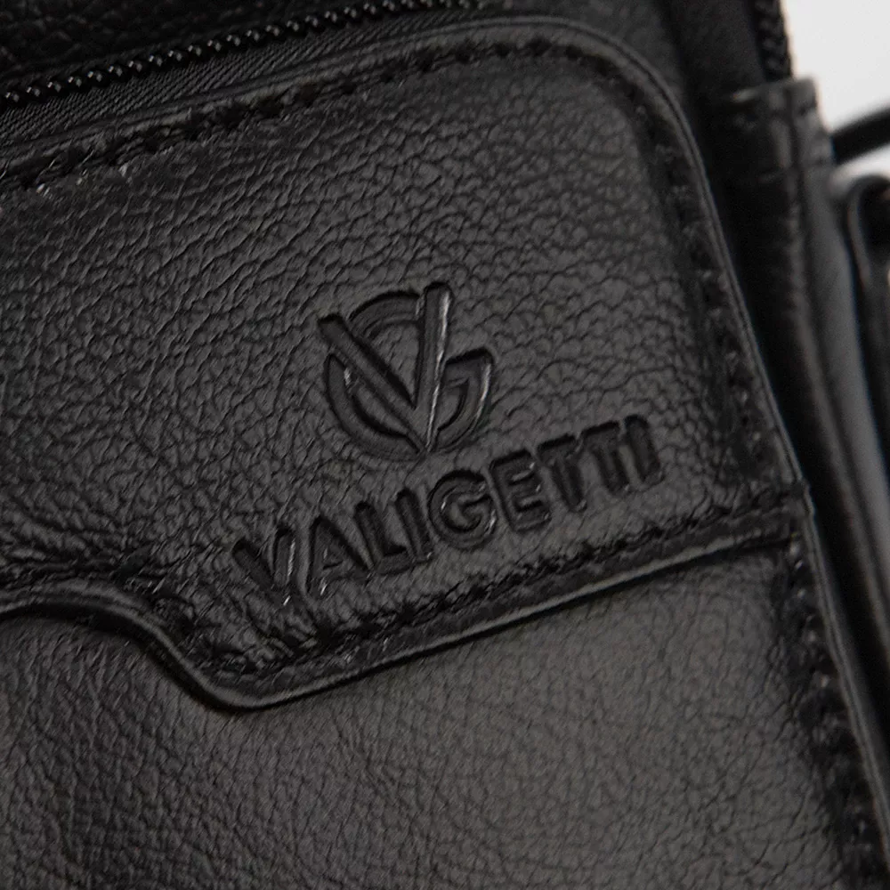 Сумка от бренда Valigetti из натуральной кожи черного цвета. Модель с одной ручкой и съемным регулируемым плечевым ремнем, выполненным из текстильного материала. Два отделения на молнии, с фирменной подкладкой. В заднем отделении – карман на молнии. На лицевой стороне – два кармана на молнии. На задней стороне – карман на молнии.
