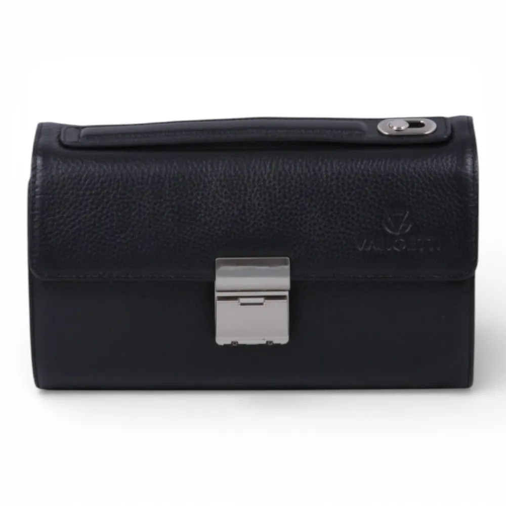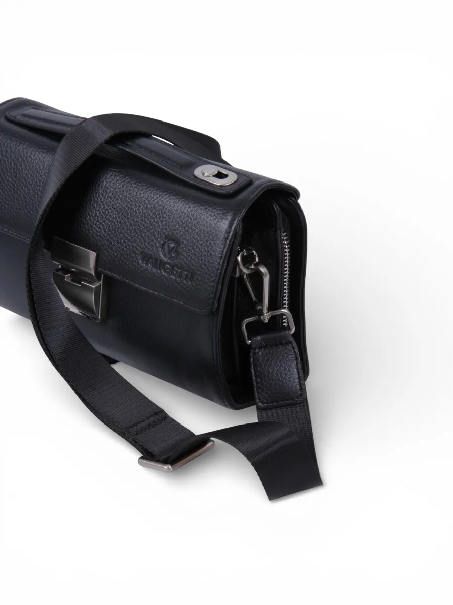 Барсетка от бренда Valigetti выполнена из натуральной кожи в черном цвете. Модель оснащена ручкой для переноски, дополнительной ручкой на клапане и съемным плечевым ремнем с регулировкой длины. Внутри есть два отделения, закрытые клапаном с кодовым замком. В одном отделении предусмотрены места для мелочей, средний карман на молнии, а также два боковых накладных кармана без застежек. Второе отделение, закрытое на молнию, можно использовать как кошелек для хранения документов, кредитных карт, монет и купюр.