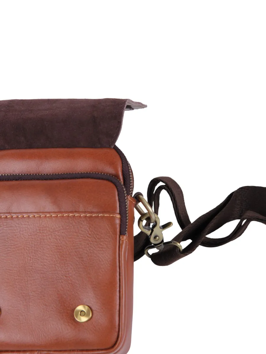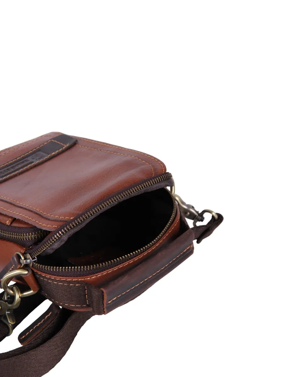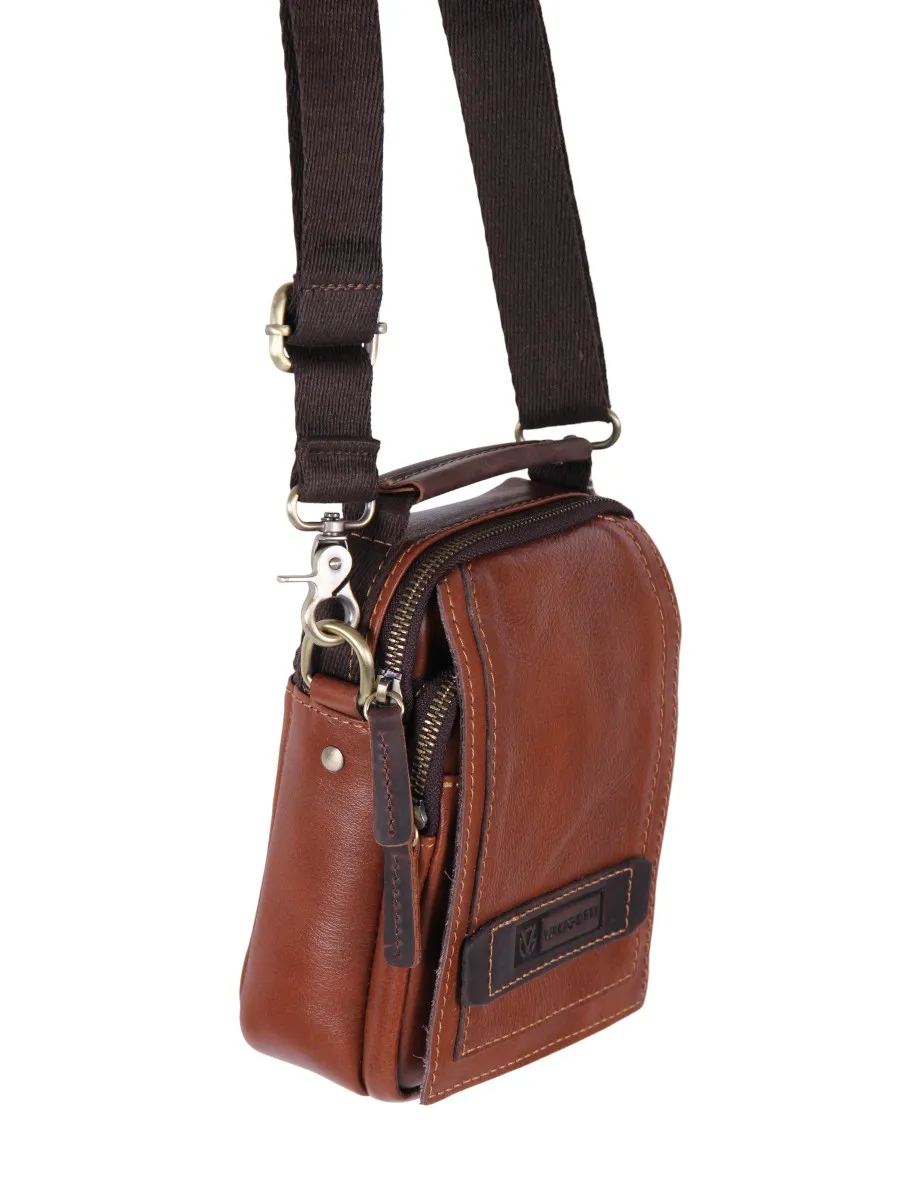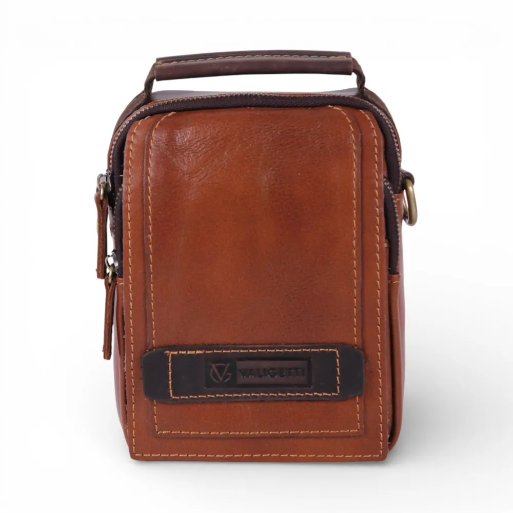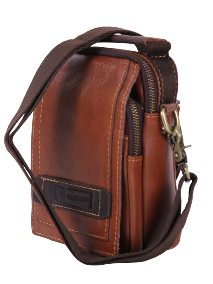 Винтажная мужская сумка через плечо, небольшого размера, на каждый день от бренда Valigetti с отличным качеством отделки, эффектом потёртости и золотистой металлической фурнитурой, выполнена из натуральной кожи. Хорошо подходит для вещей, которые всегда нужны под рукой: телефон, кошелёк и автодокументы. Сумка коричневого цвета, в комплекте предусмотрен мешковидный ремень, который регулируется по длине. Снаружи под клапаном два кармана: накладной открытый и на молнии. Основное отделение на молнии, внутри: текстильная подкладка и карман на молнии. На задней стороне сумки расположен карман на молнии.