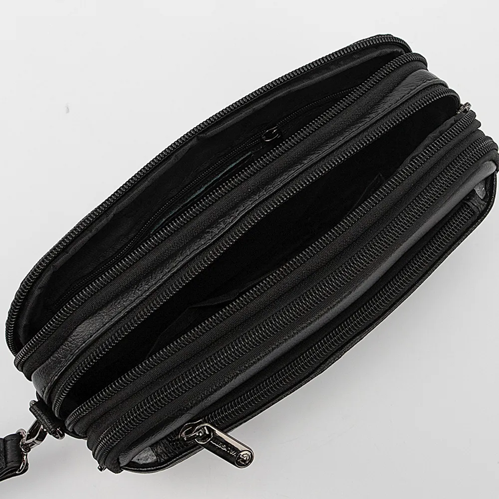 Сумка-барсетка от торговой марки Valigetti из натуральной кожи черного цвета. Модель со съемным ремешком для запястья, ремешком для ношения на ладони. Три отделения на молнии, с фирменной подкладкой. В заднем отделении – карман на молнии. На лицевой и задней сторонах – карман на молнии.