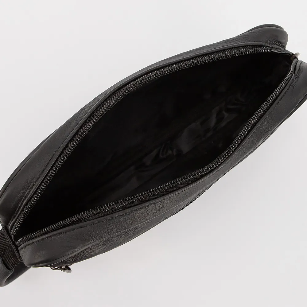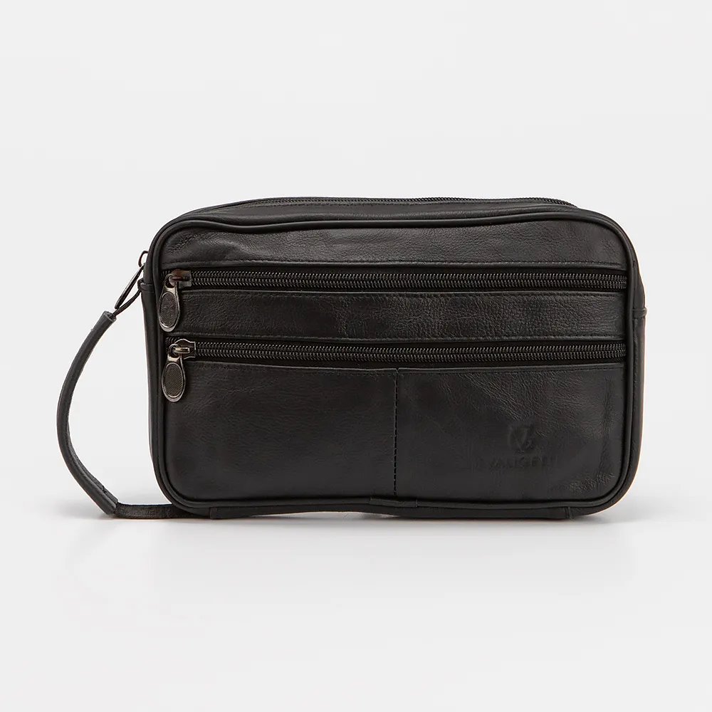 Барсетка от торговой марки Valigetti выполнена из натуральной кожи черного цвета. Модель с ручкой для переноски. Отделение на молнии. Внутри: текстильная подкладка. С лицевой стороны два кармана на молнии.