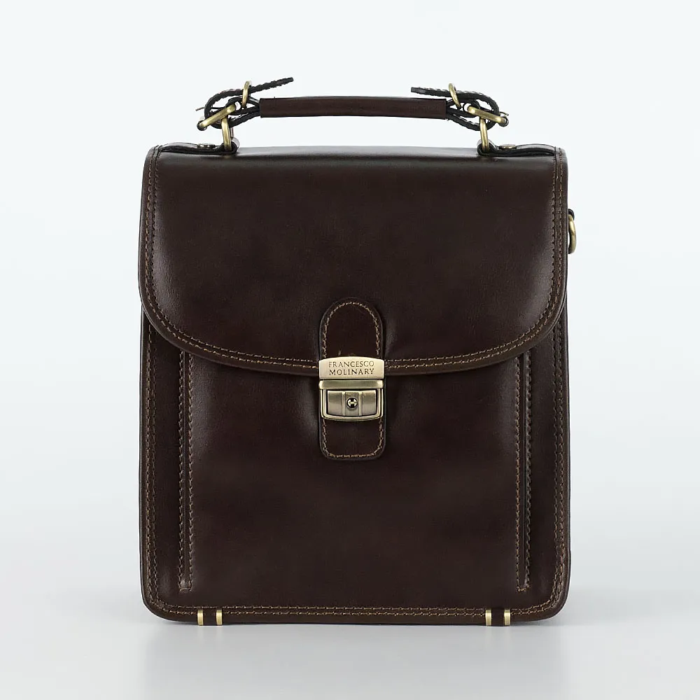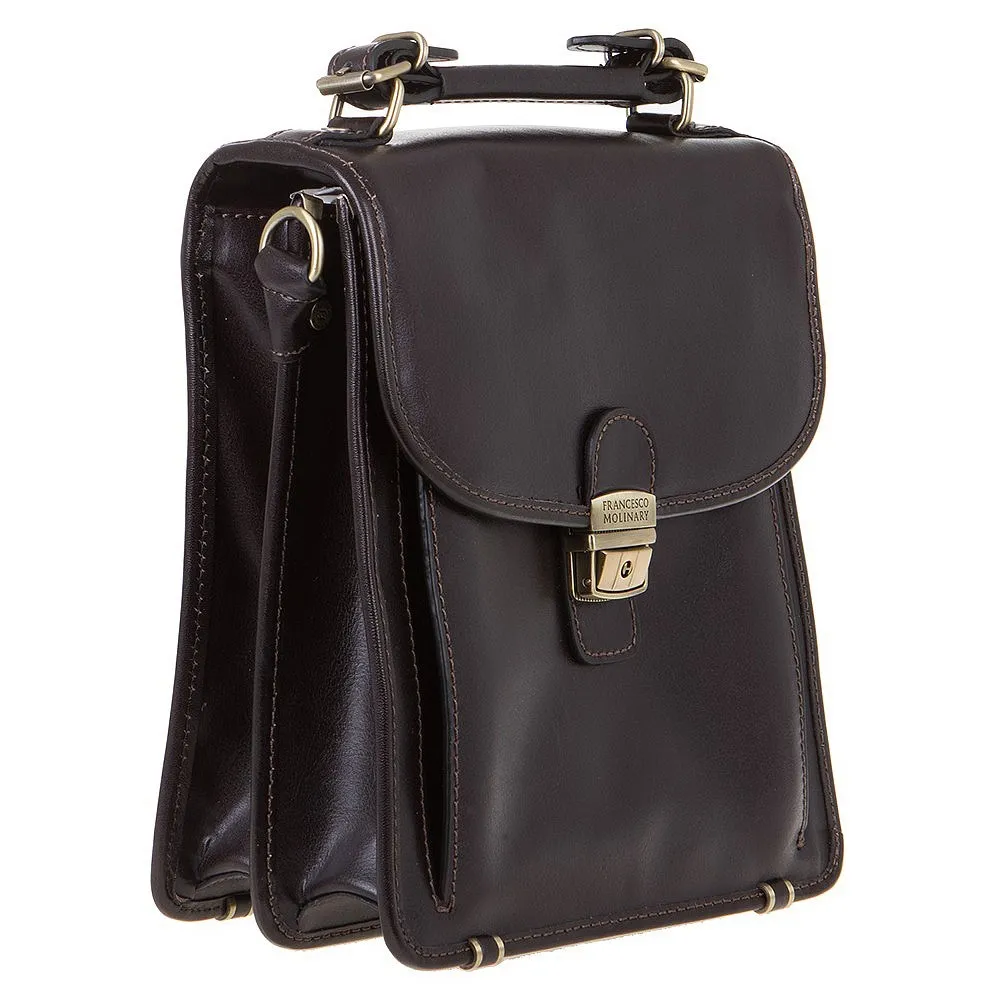 Деловая мужская сумка Francesco Molinary выполнена в тёмно-коричневом цвете из натуральной кожи с отличным качеством отделки и дополнена золотистой металлической фурнитурой. Снаружи карман на молнии, эргономичная ручка и клапан на замке-щеколде с ключиком, под ним накладной карман без застёжки с двумя кармашками для карточек и два независимых отделения, внутри два кармана на молниях, петельки для письменных принадлежностей и удобная петля с кнопкой для ключей. В комплекте предусмотрен плечевой ремень.