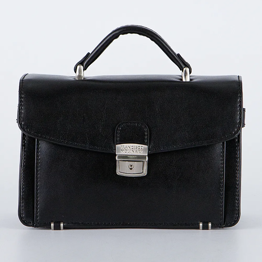 Классическая мужская барсетка Francesco Molinary из натуральной мягкой кожи. Внутри два отдела и средник на молнии, закрывается на клапан с железным замком - щеколдой. Внутри карман на кнопке, карман на молнии и карман под мелочи. Сзади с внешней стороны карман на молнии. Фурнитура и ножки на дне барсетки металлические золотистого цвета.