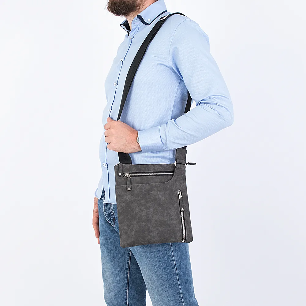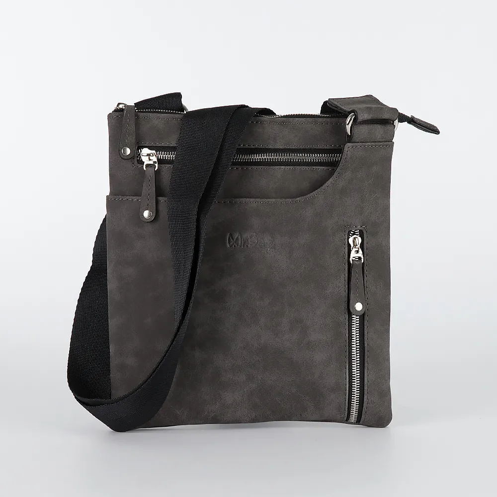Сумка-планшет от торговой марки Mr.Bag из искусственной кожи серого цвета. Компактная плоская модель с несъемным регулируемым плечев ым ремнем. Отделение на молнии. Внутри: текстильная подкладка, накладной карман. На лицевой стороне – два кармана на молнии, на задней – карман на молнии.